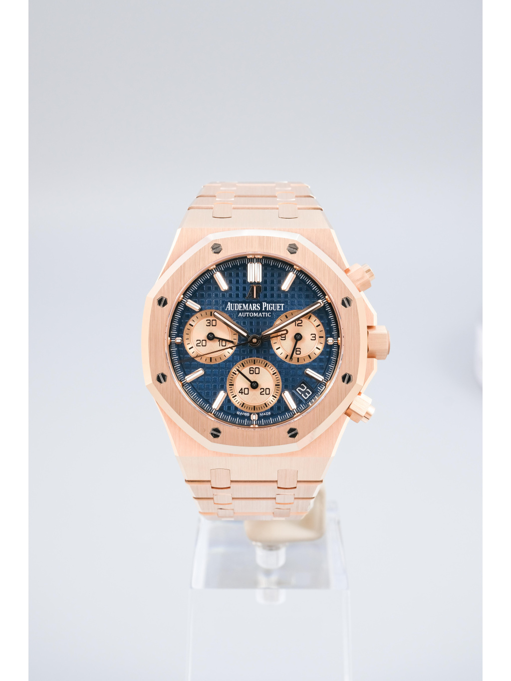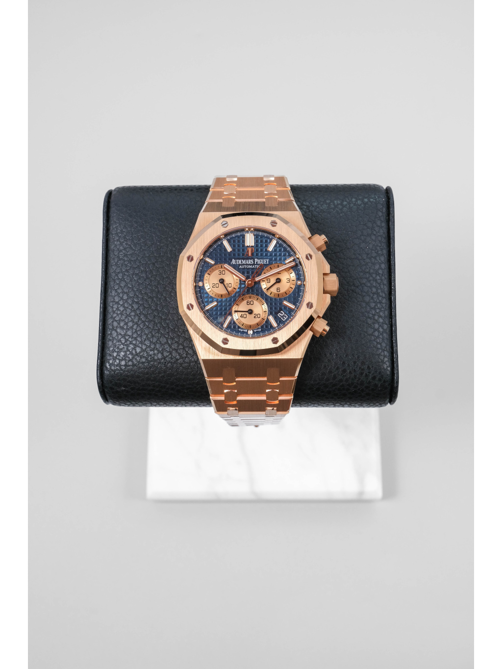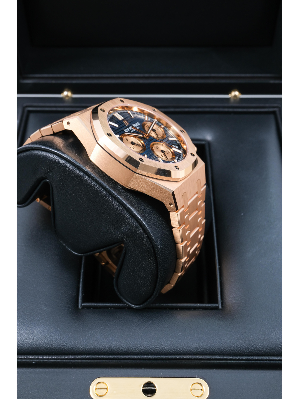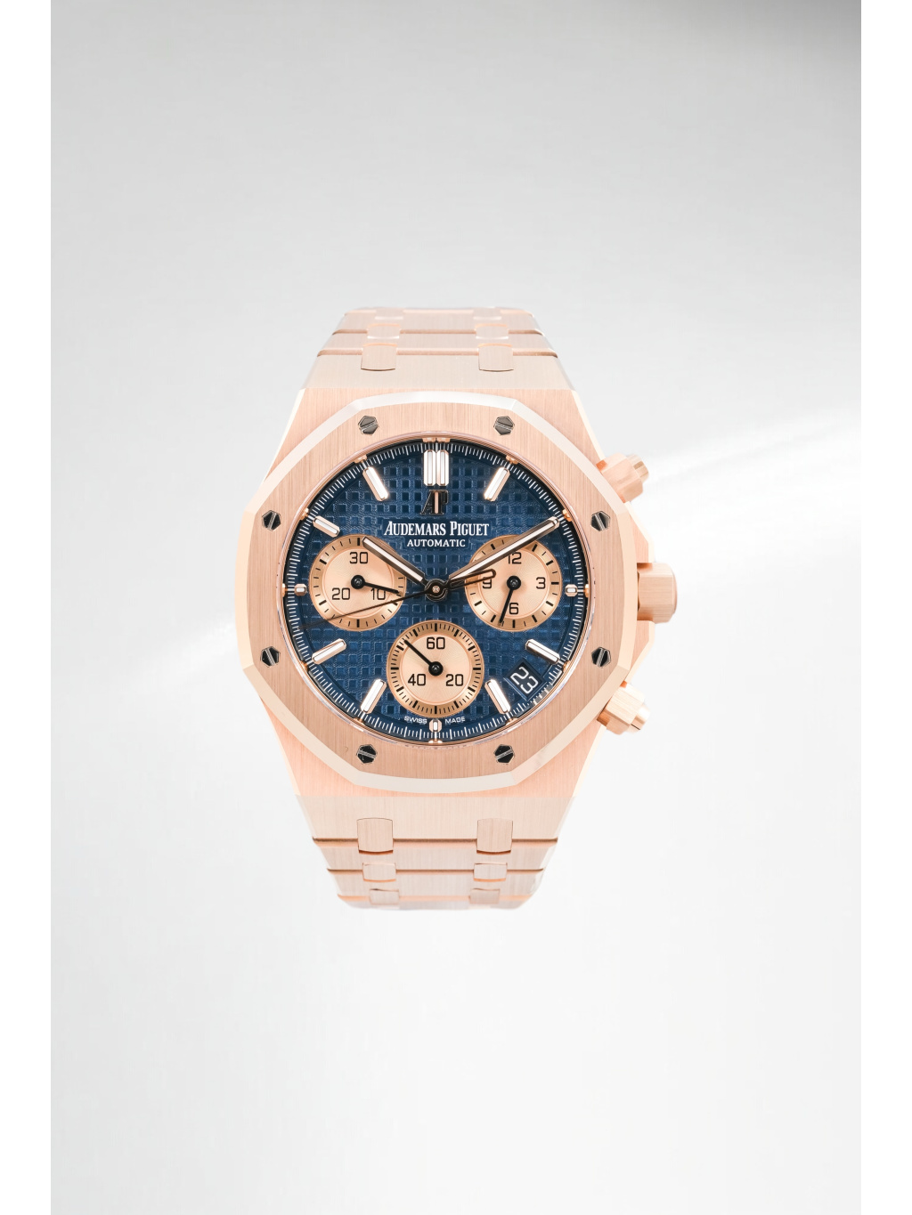 Model Royal Oak Chronograph je ukázkou toho, jak Audemars Piguet mistrně kombinuje sportovní charakter a ryzí luxus. Pouzdro z 18karátového růžového zlata o průměru 41 mm nese ikonickou osmihrannou lunetu s viditelnými šrouby, která se stala symbolem celé kolekce Royal Oak.