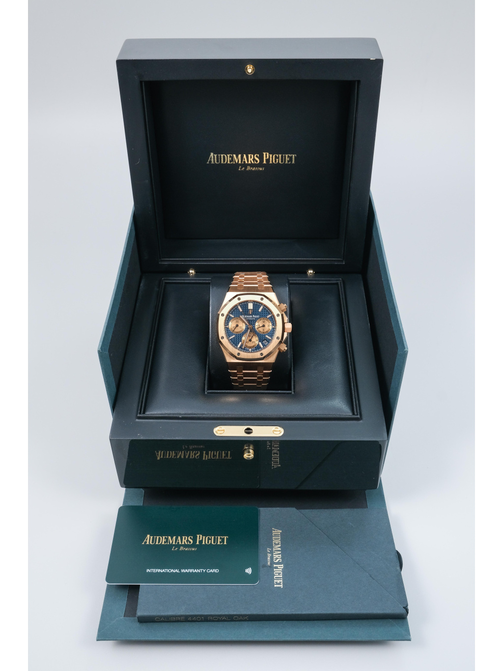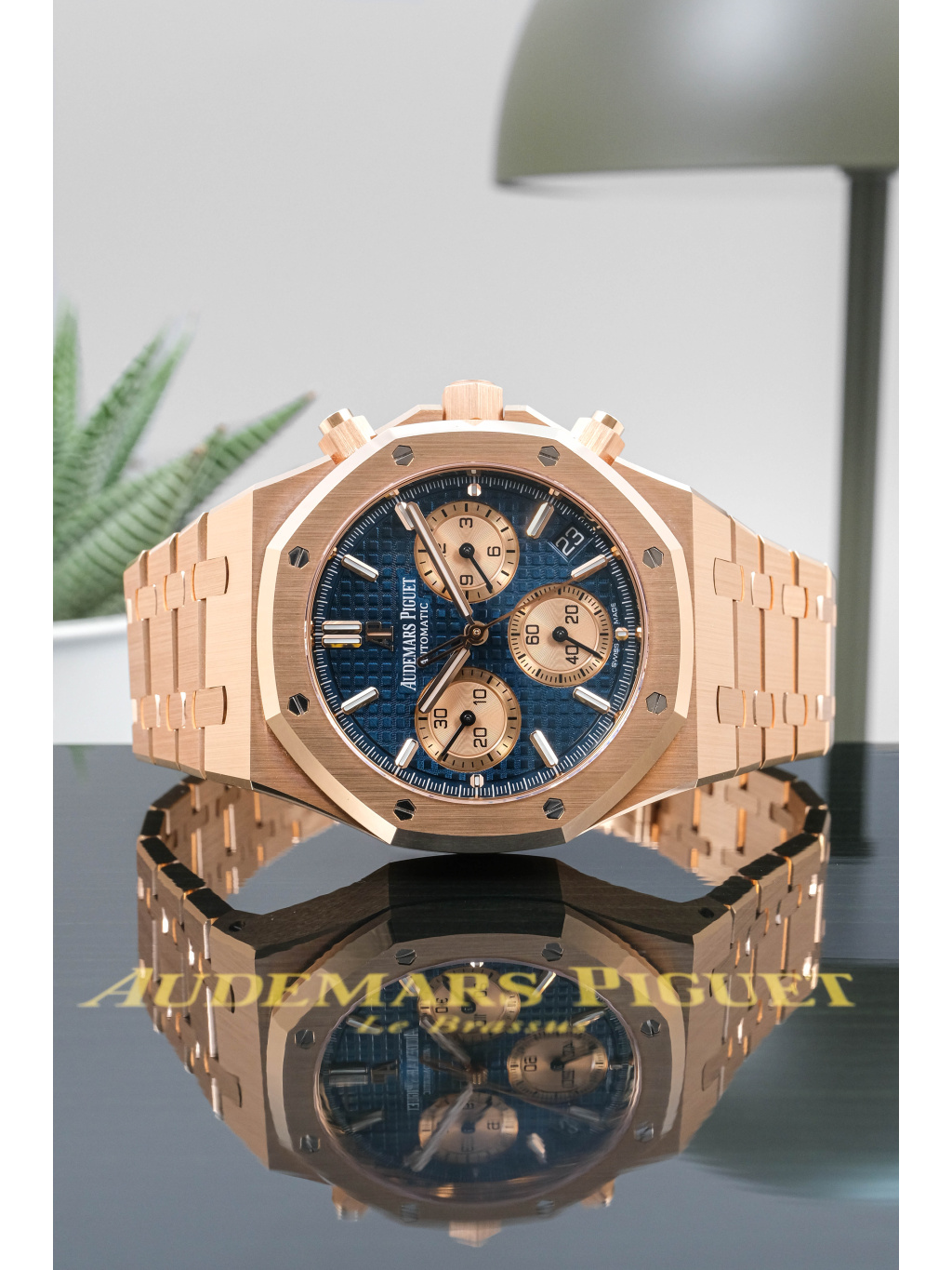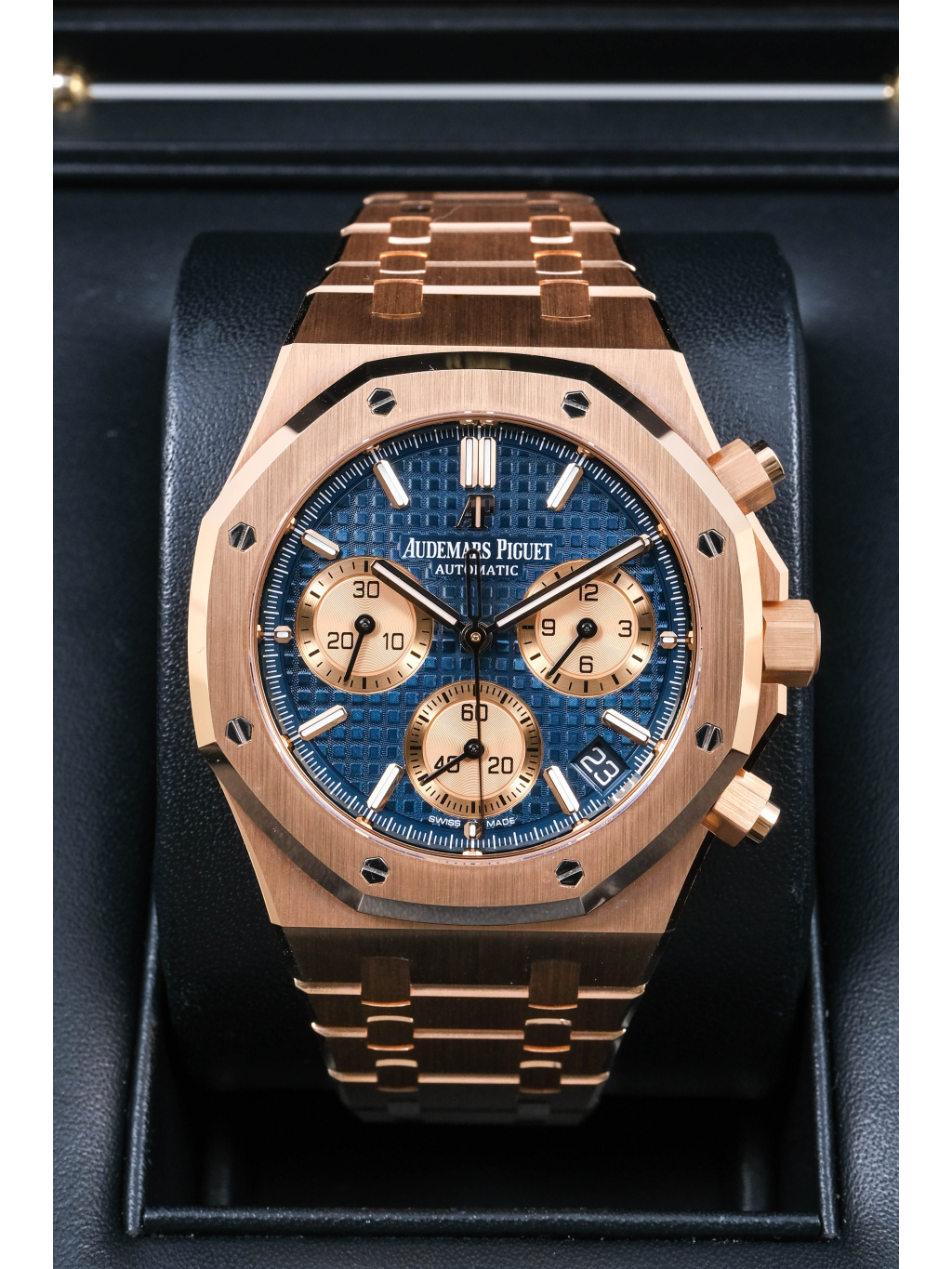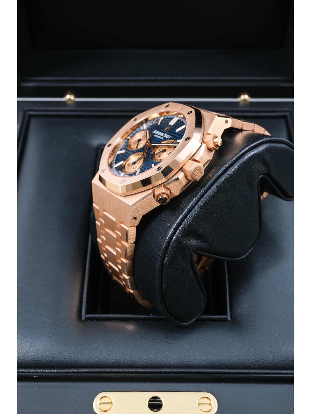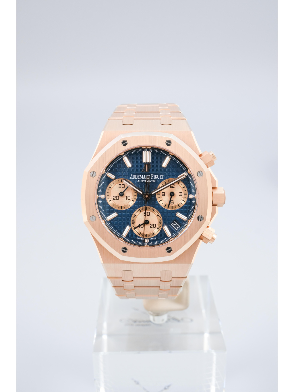 Model Royal Oak Chronograph je ukázkou toho, jak Audemars Piguet mistrně kombinuje sportovní charakter a ryzí luxus. Pouzdro z 18karátového růžového zlata o průměru 41 mm nese ikonickou osmihrannou lunetu s viditelnými šrouby, která se stala symbolem celé kolekce Royal Oak.