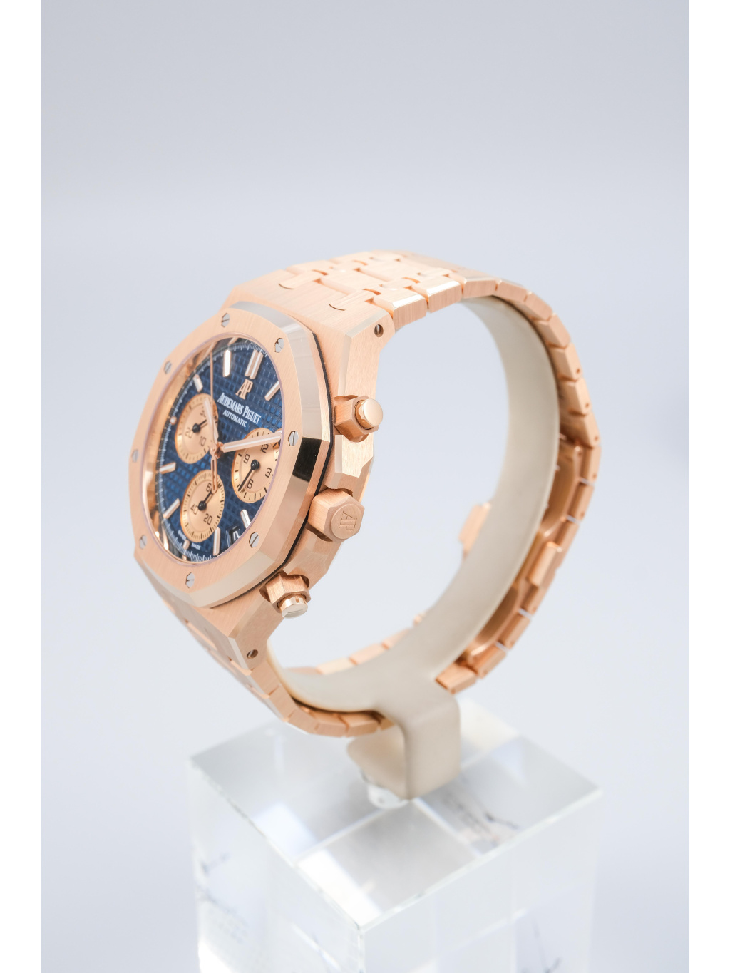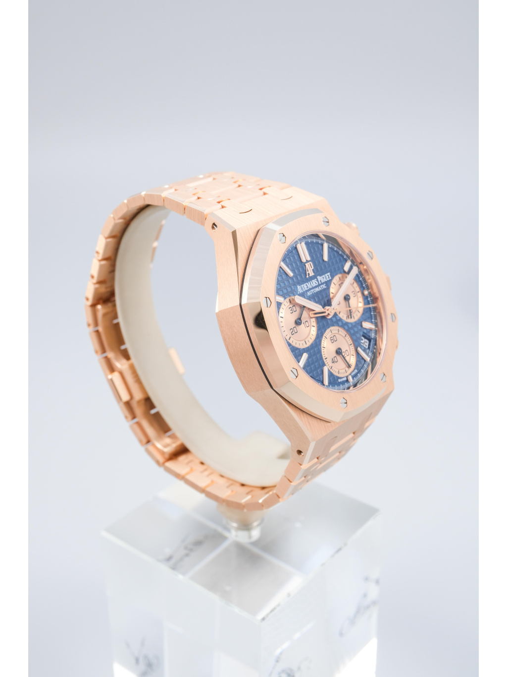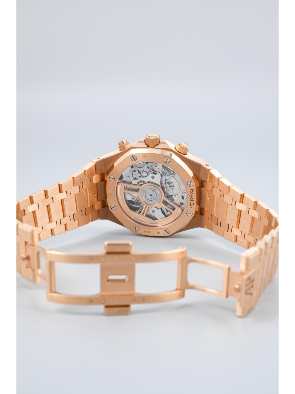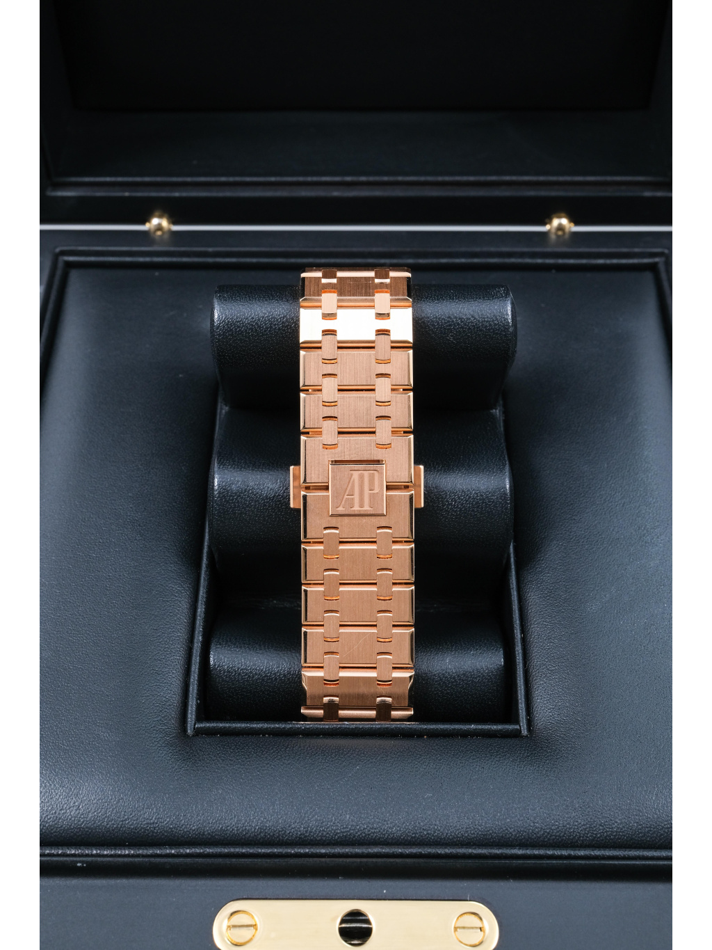 Model je nasazen na integrovaném náramku z růžového zlata, který dokonale splývá s pouzdrem a podtrhuje ikonický design Royal Oak.