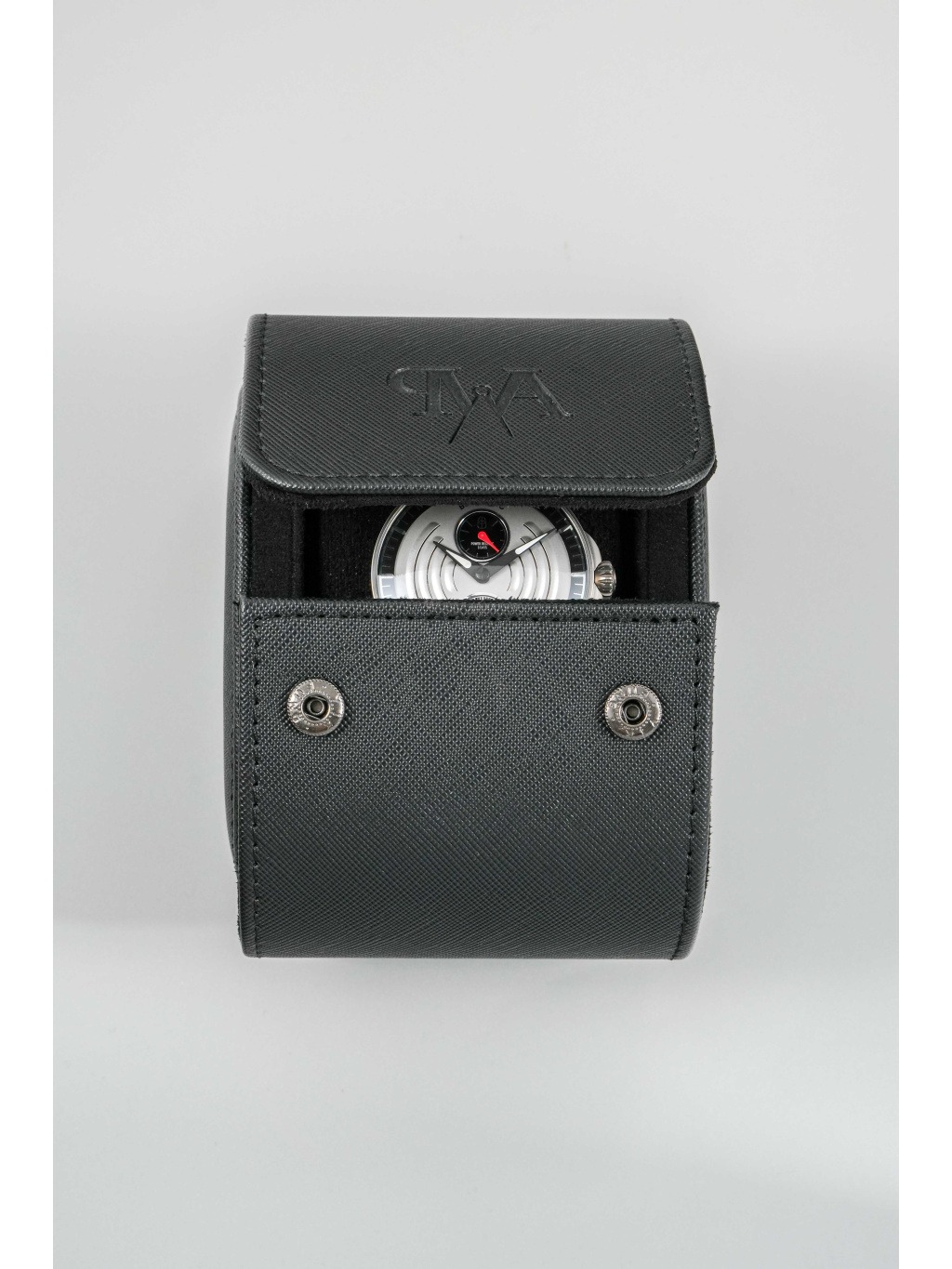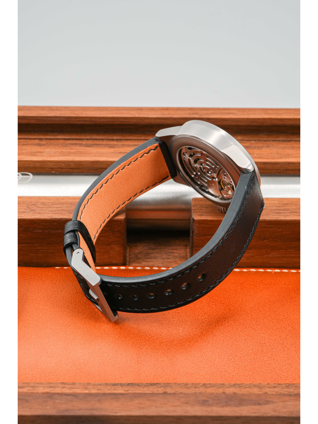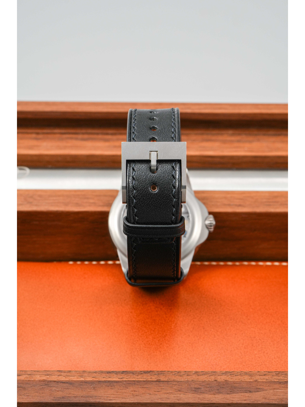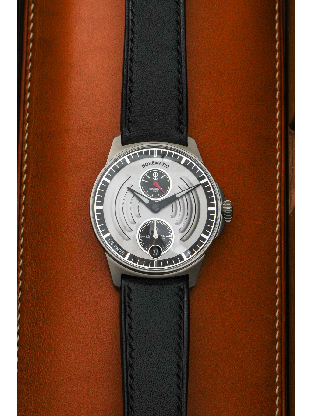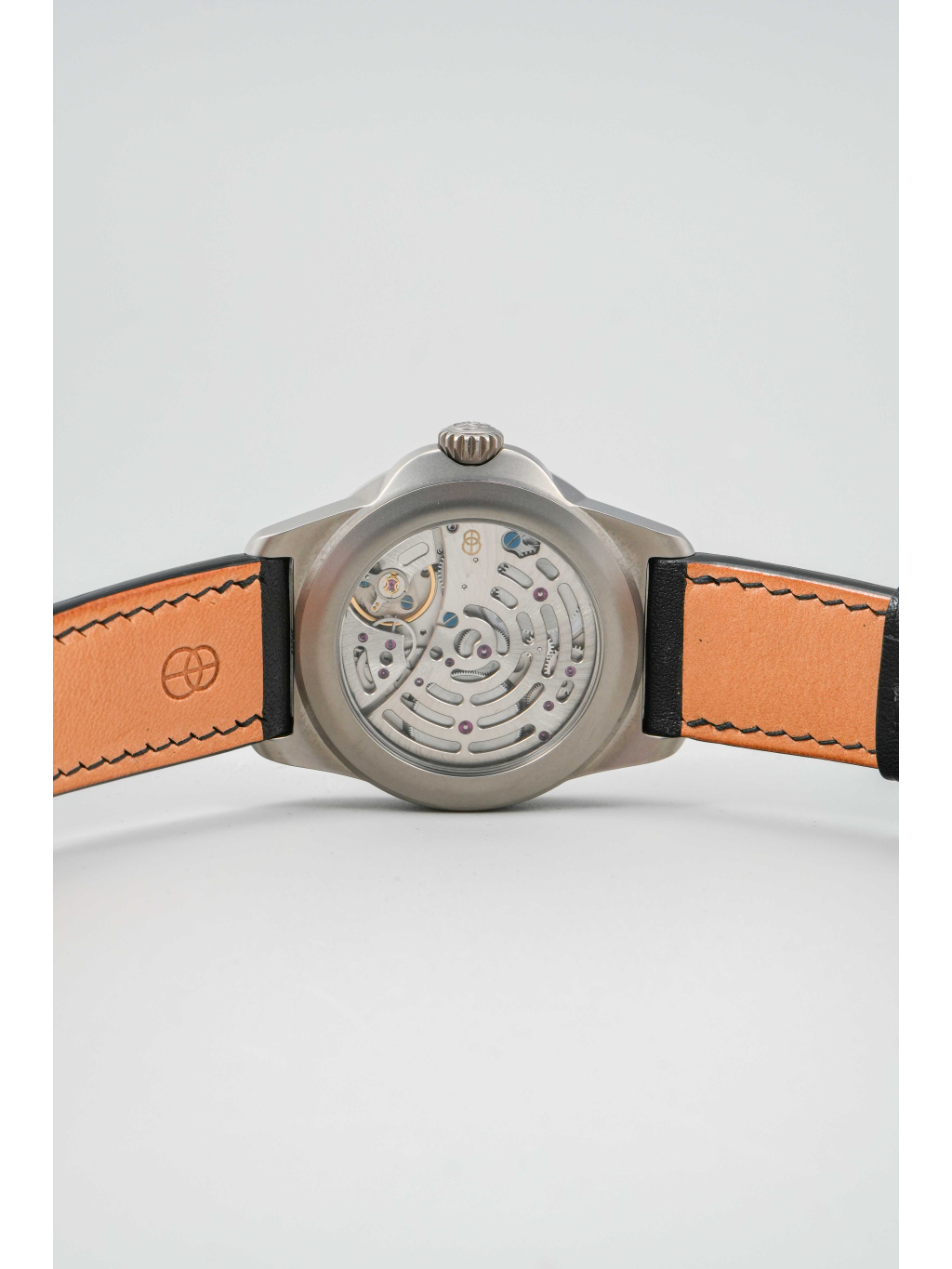 Pouzdro je z tryskaného titanu a má průměr 39,5 mm při výšce 12,2 mm, takže působí elegantně a sedí na každém zápěstí. Voděodolnost je 50 m pro bezstarostné každodenní nošení. Číselník je stříbrný reliéfní s luminiscencí, doplněný frézovanými ručkami s luminiscencí pro dobrou čitelnost. Vše chrání sférické safírové sklíčko s antireflexní úpravou. Na ruce sedí na ručně šitém koženém řemínku a hodinky uzavírá trnová spona z tryskaného titanu.