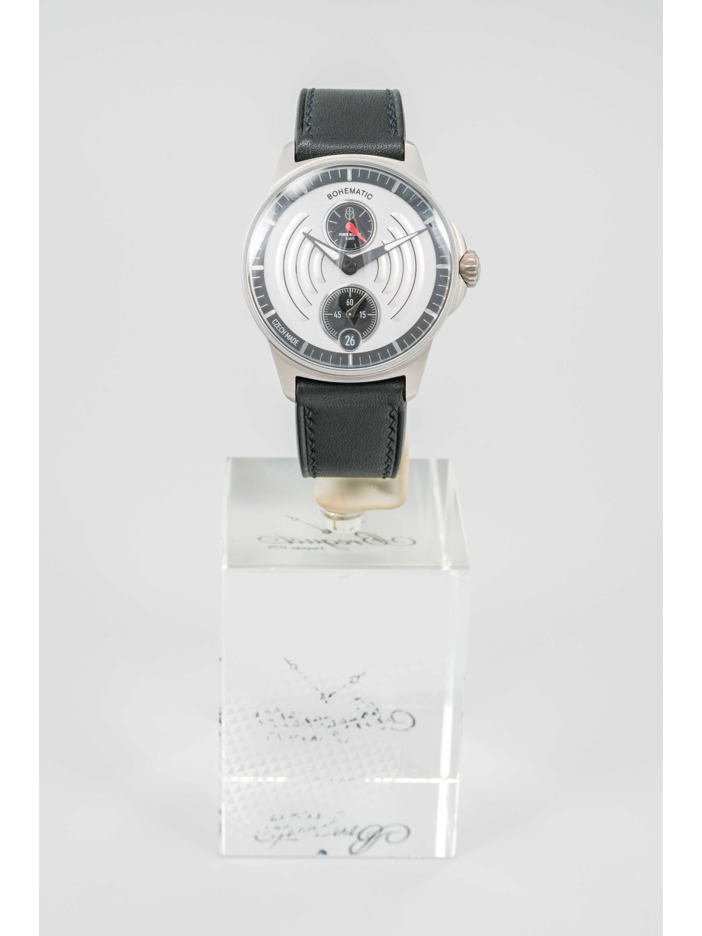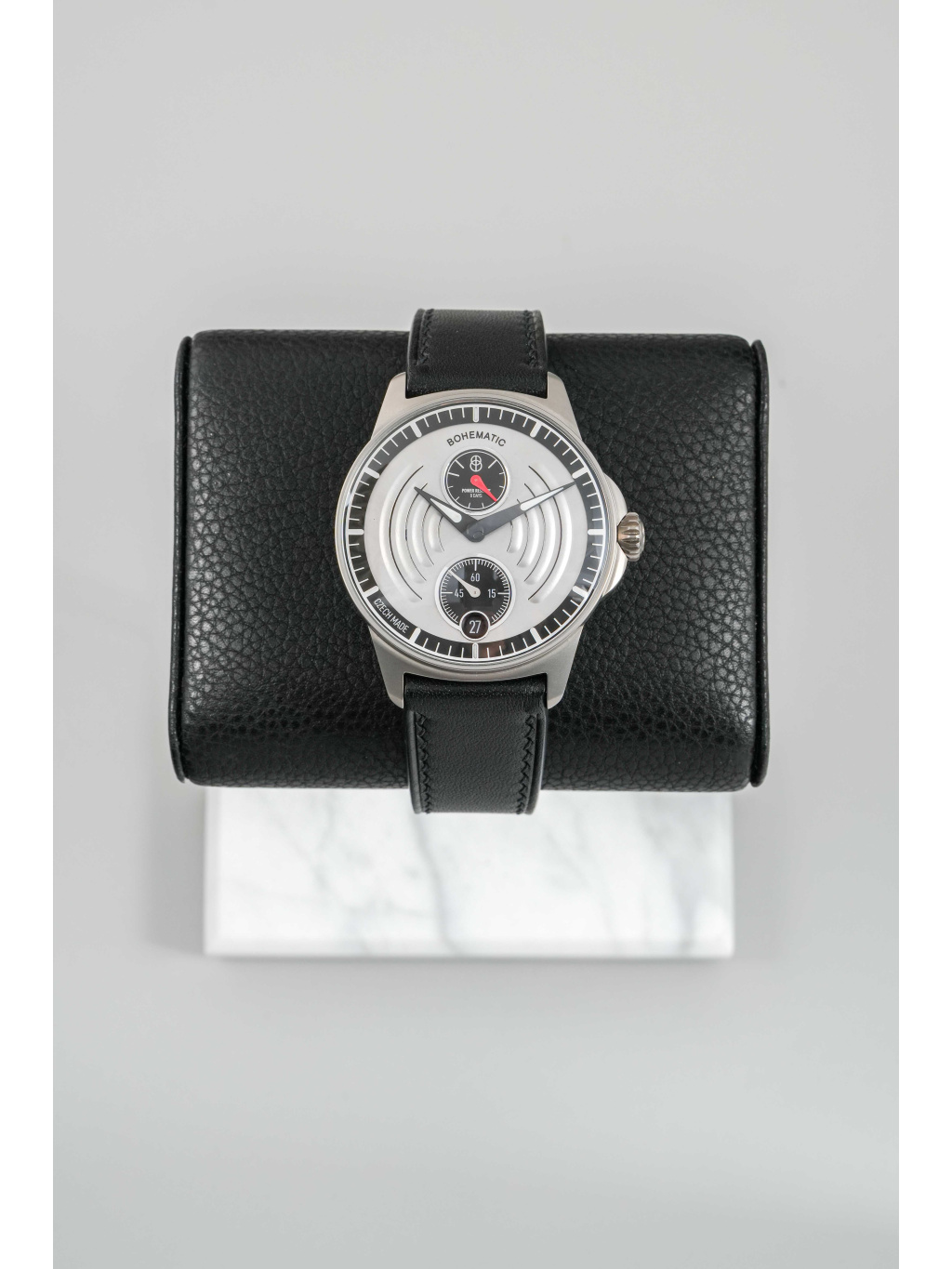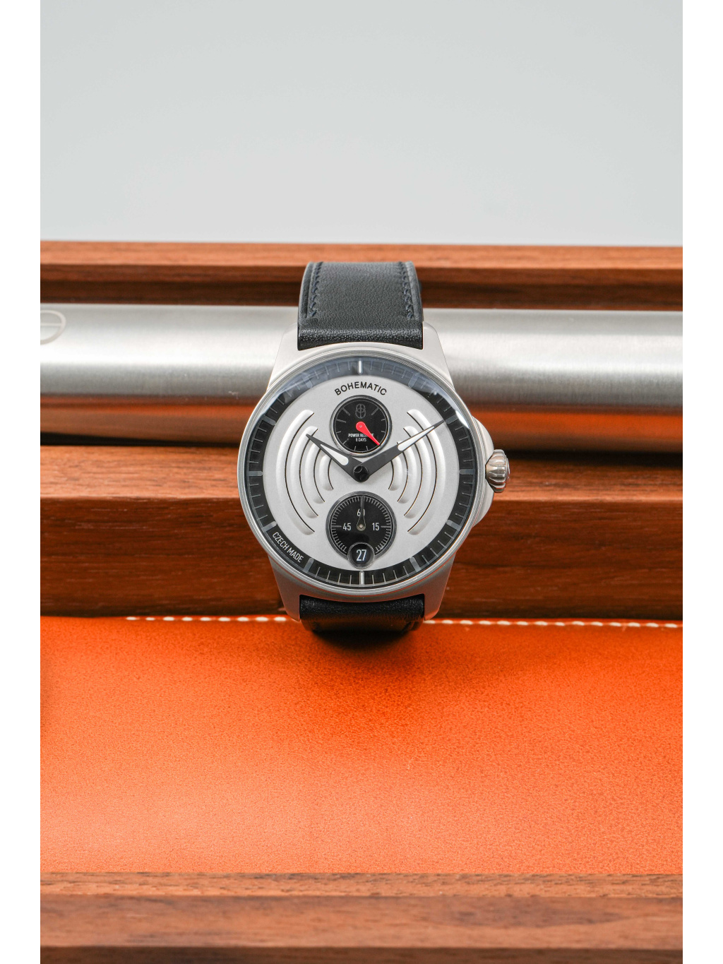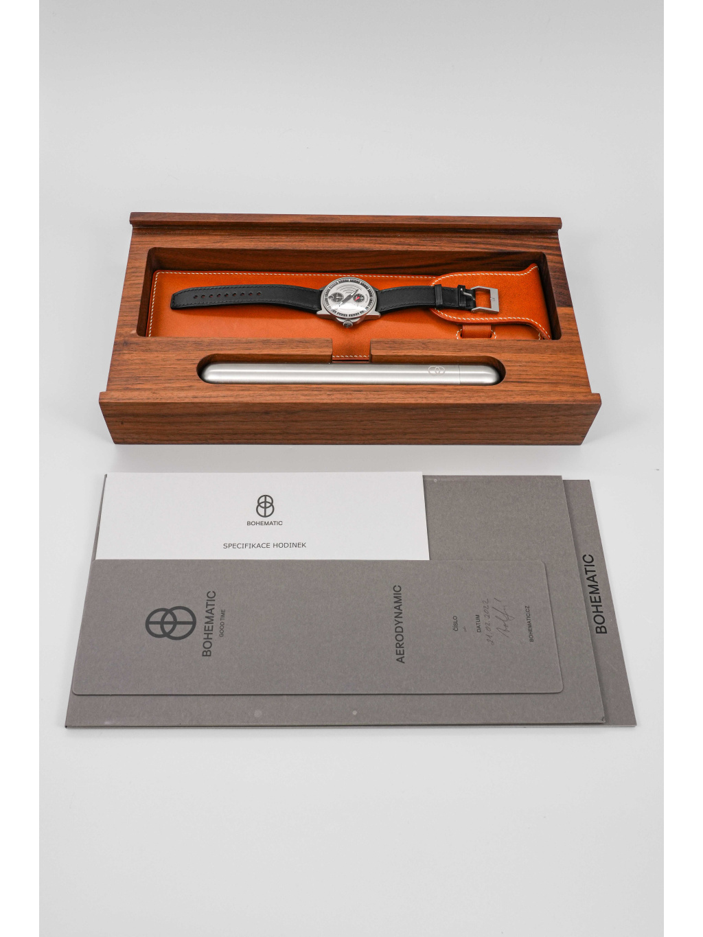 ROBOT Aerodynamic patří mezi nejvýraznější současné české hodinky inspirované funkcionalismem, aerodynamikou a estetikou 30. let. Model v provedení Silver Metallic zaujme čistými liniemi, technickým výrazem a dokonale vyváženými proporcemi. Tento konkrétní kus je navíc výjimečný tím, že pochází z rané produkce značky, kdy hodinky ještě nesly původní jméno BOHEMATIC – detail, který z něj činí sběratelsky zajímavější a dnes již raritní variantu.