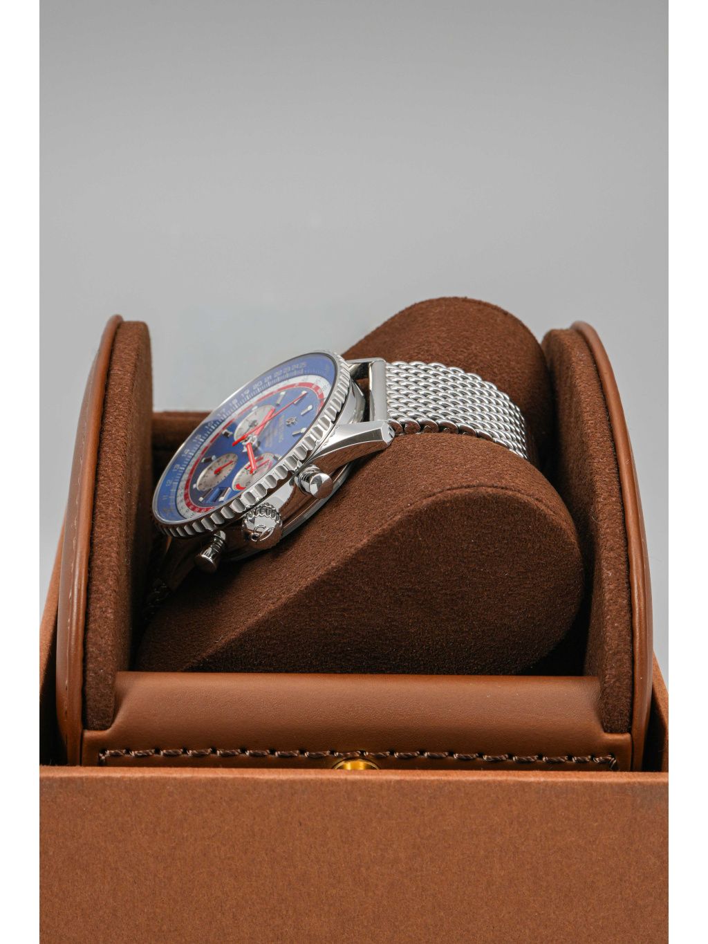 Pouzdro z nerezové oceli má průměr 43 mm a zachovává typickou architekturu Navitimeru s otočnou logaritmickou lunetou, která slouží jako výpočetní nástroj pro piloty. Modrý číselník je doplněn kontrastními subčíselníky chronografu a logem Pan Am, které podtrhuje unikátnost této edice. Aplikované indexy a ručky s luminiscenční výplní zajišťují dobrou čitelnost. Hodinky jsou osazeny ocelovým náramkem s překlápěcí sponou. Voděodolnost činí 30 metrů.