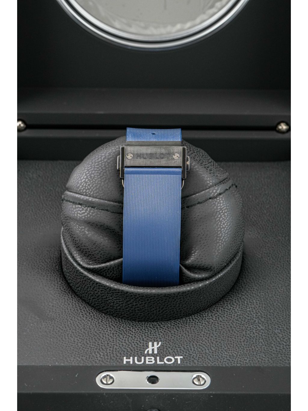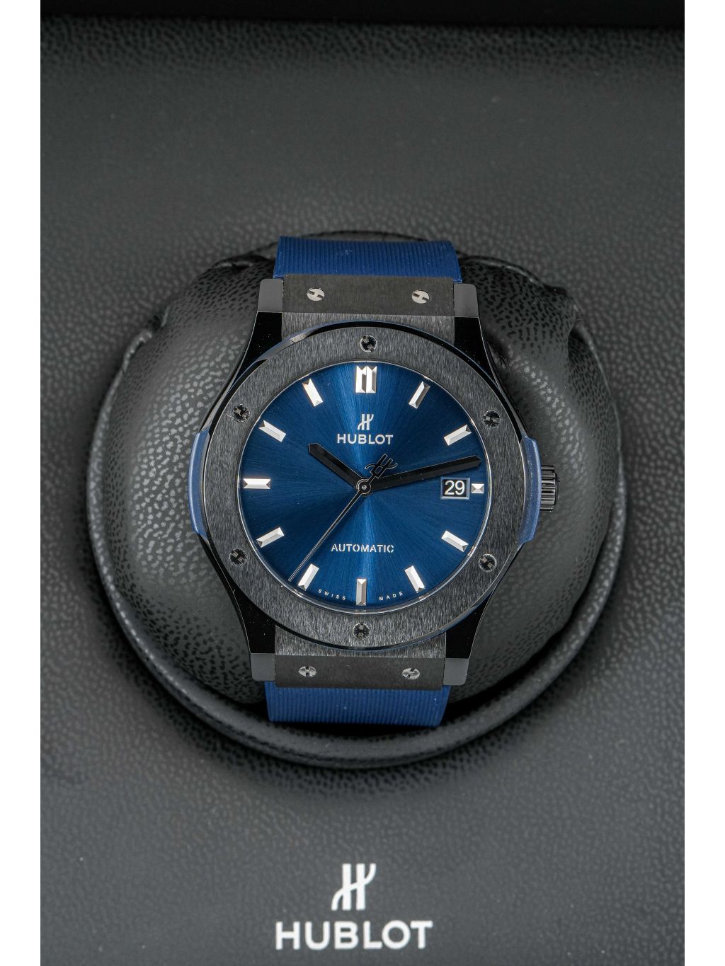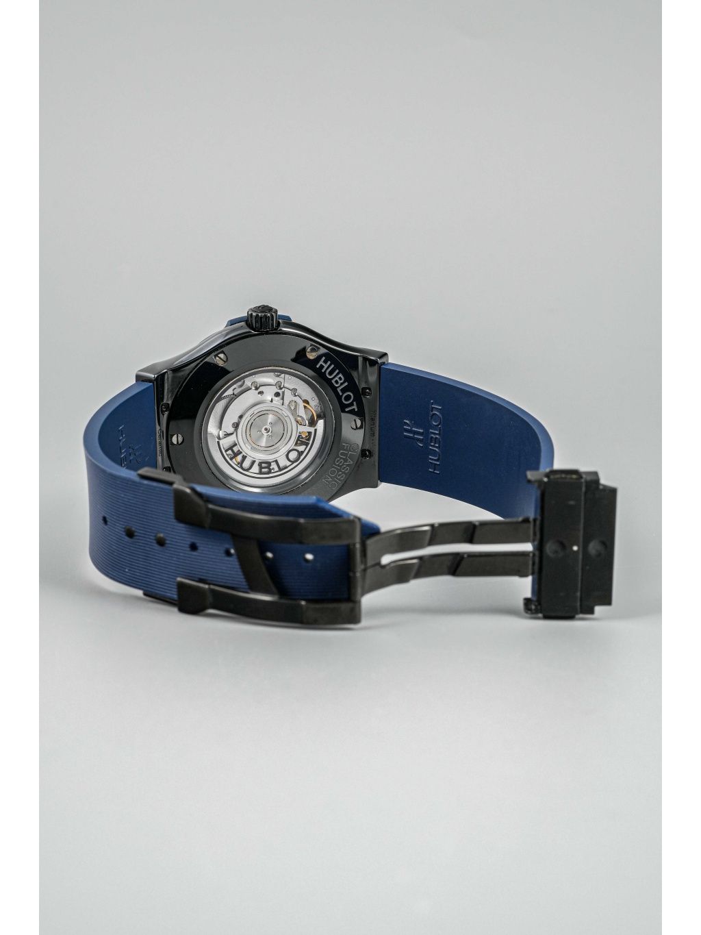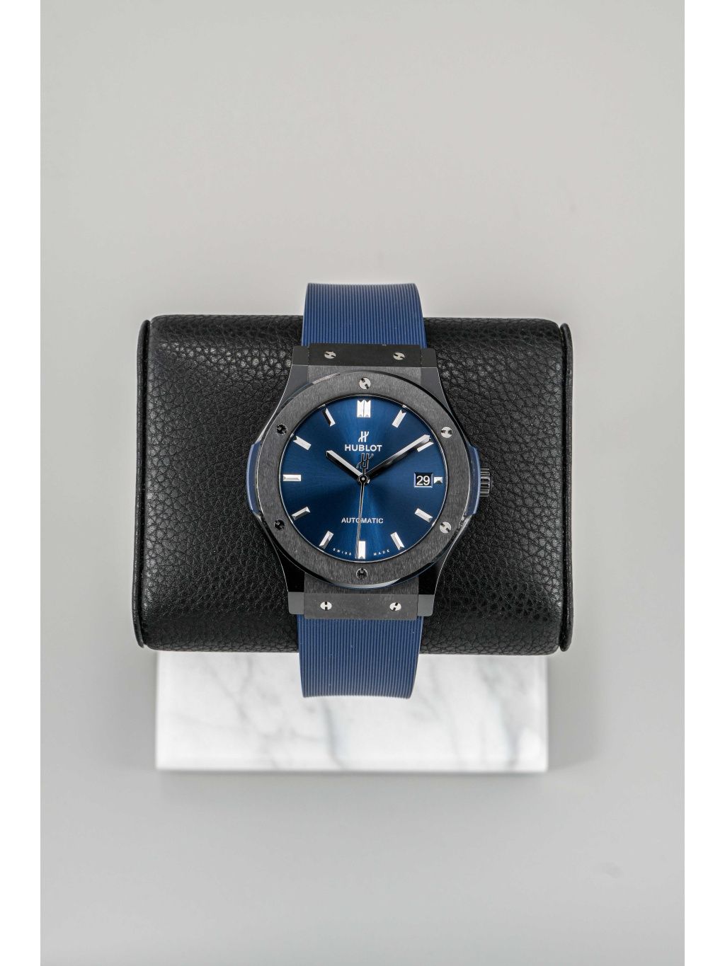 The 45mm black ceramic case features a satin finish that gives it a modern and technical look. The blue dial with a subtle sunburst effect adds depth and an elegant appearance to the watch, while simple hour markers and slender hands ensure excellent readability. The date window is positioned at the 3 o’clock mark. The watch is fitted with a leather strap lined with rubber, a combination typical of Hublot that blends comfort and durability. Water resistance to 50 meters matches its elegantly sporty focus.