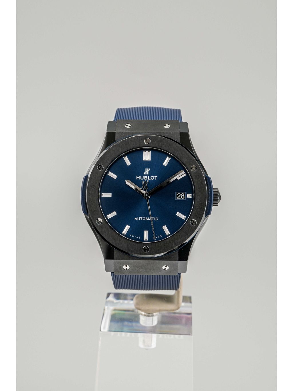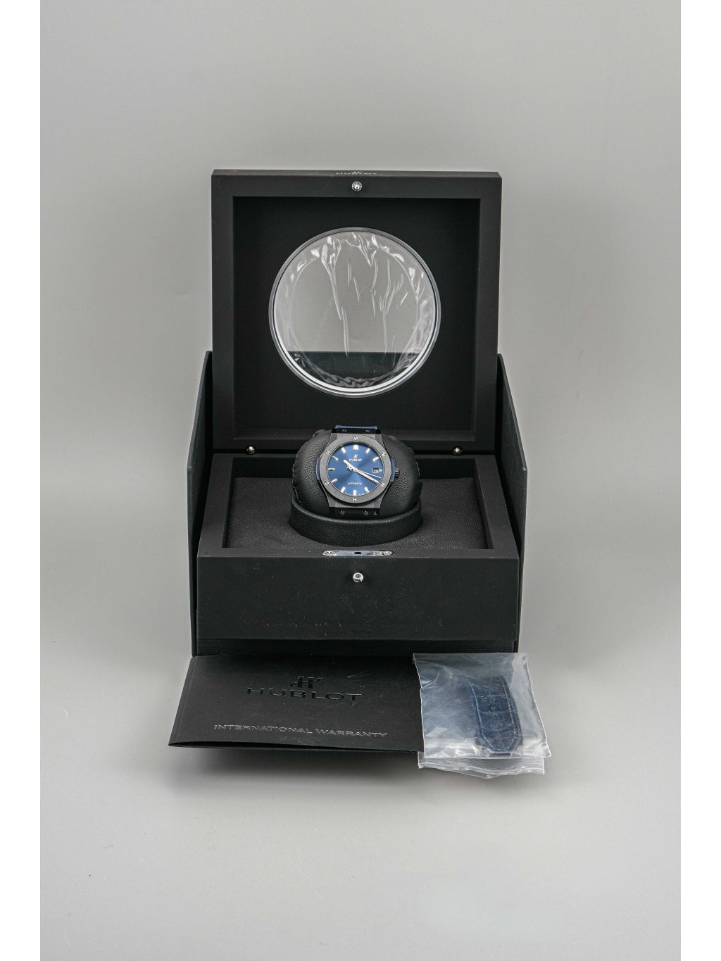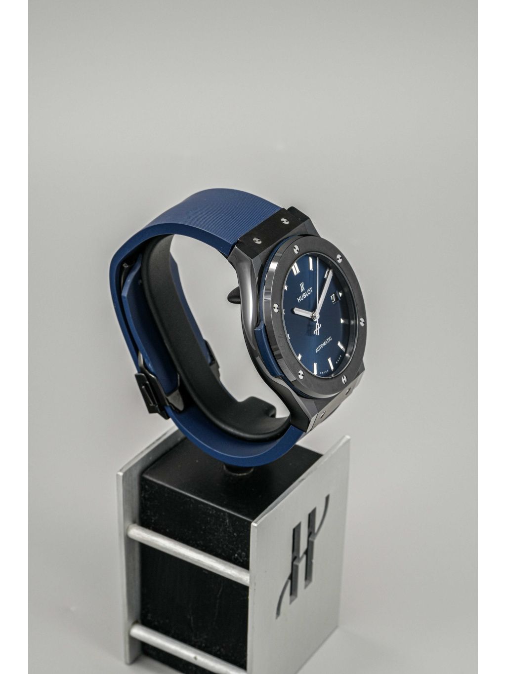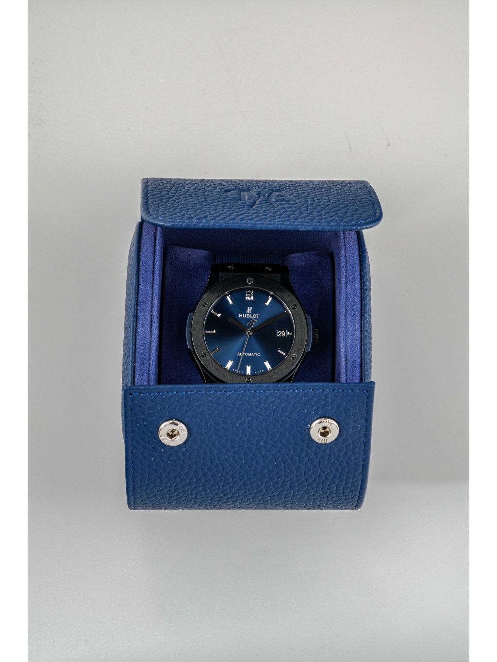 The 45mm black ceramic case features a satin finish that gives it a modern and technical look. The blue dial with a subtle sunburst effect adds depth and an elegant appearance to the watch, while simple hour markers and slender hands ensure excellent readability. The date window is positioned at the 3 o’clock mark. The watch is fitted with a leather strap lined with rubber, a combination typical of Hublot that blends comfort and durability. Water resistance to 50 meters matches its elegantly sporty focus.