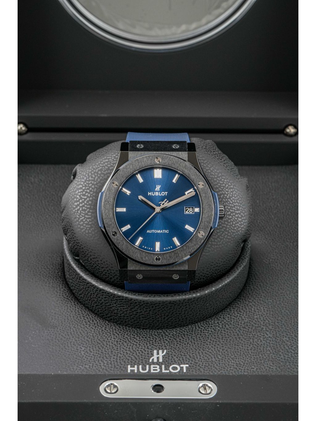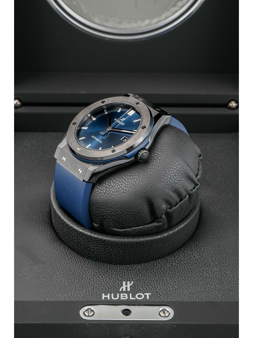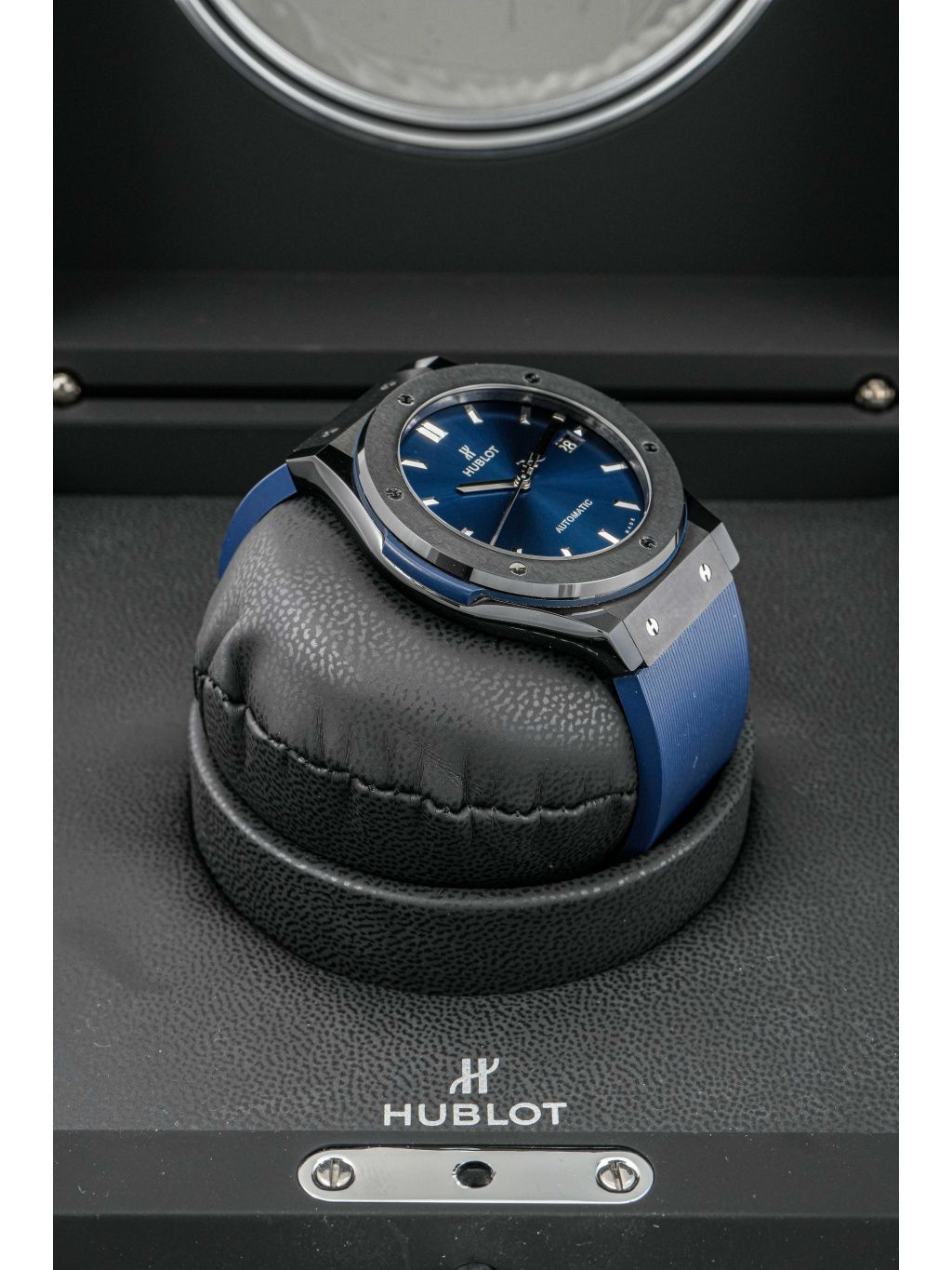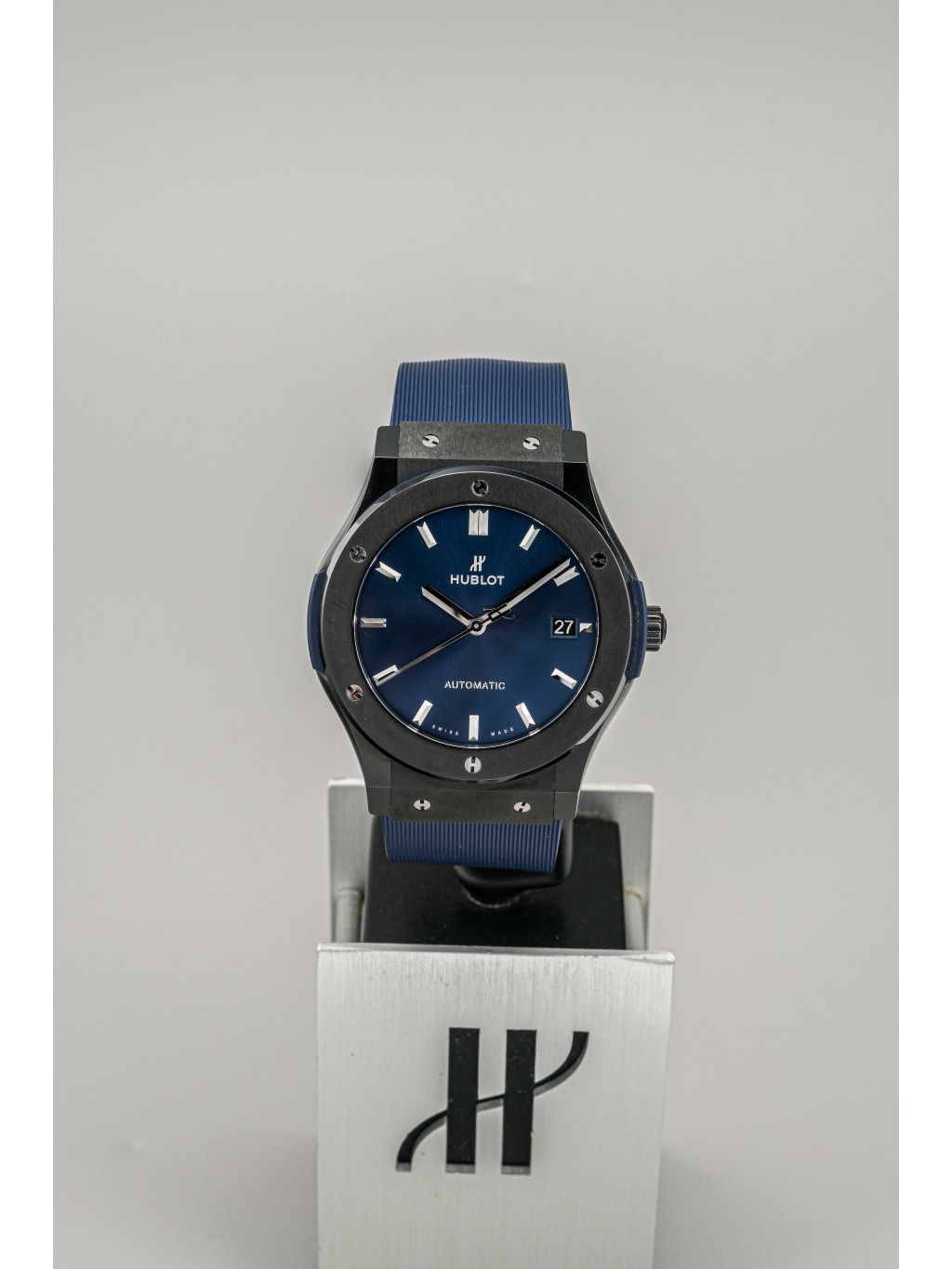 The 45mm black ceramic case features a satin finish that gives it a modern and technical look. The blue dial with a subtle sunburst effect adds depth and an elegant appearance to the watch, while simple hour markers and slender hands ensure excellent readability. The date window is positioned at the 3 o’clock mark. The watch is fitted with a leather strap lined with rubber, a combination typical of Hublot that blends comfort and durability. Water resistance to 50 meters matches its elegantly sporty focus.