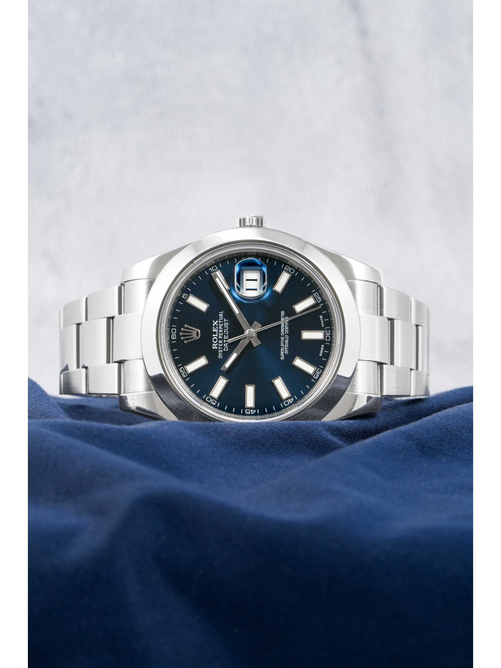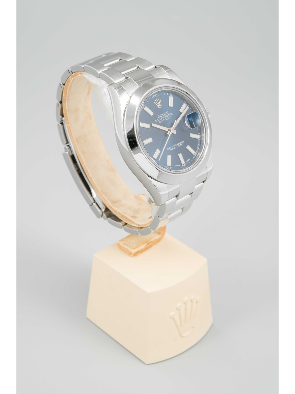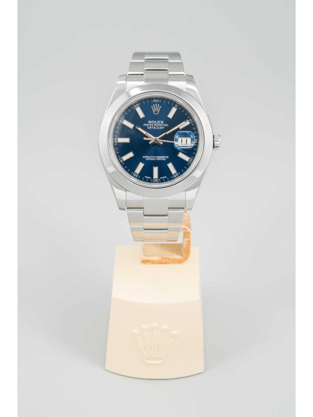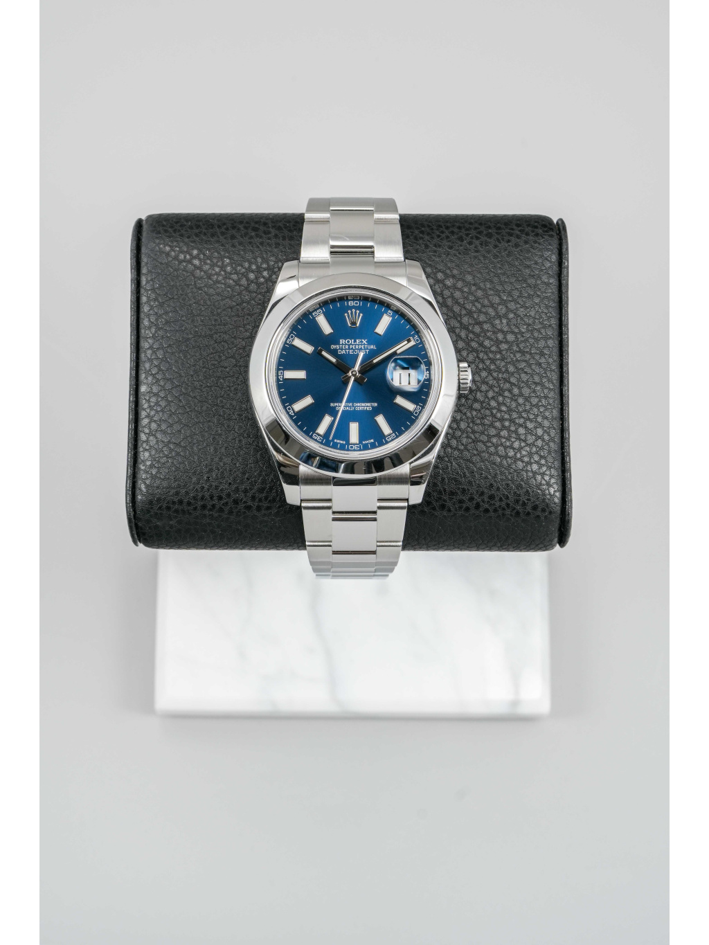 The 41 mm case is made of Oystersteel and complemented by a smooth bezel. The blue dial is decorated with applied indices with luminescent filling, which ensure excellent readability even in low light conditions. Above the date window at 3 o'clock is a Cyclops magnifying lens. It is protected by a scratch-resistant sapphire crystal.