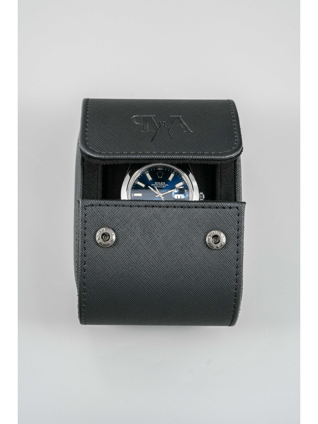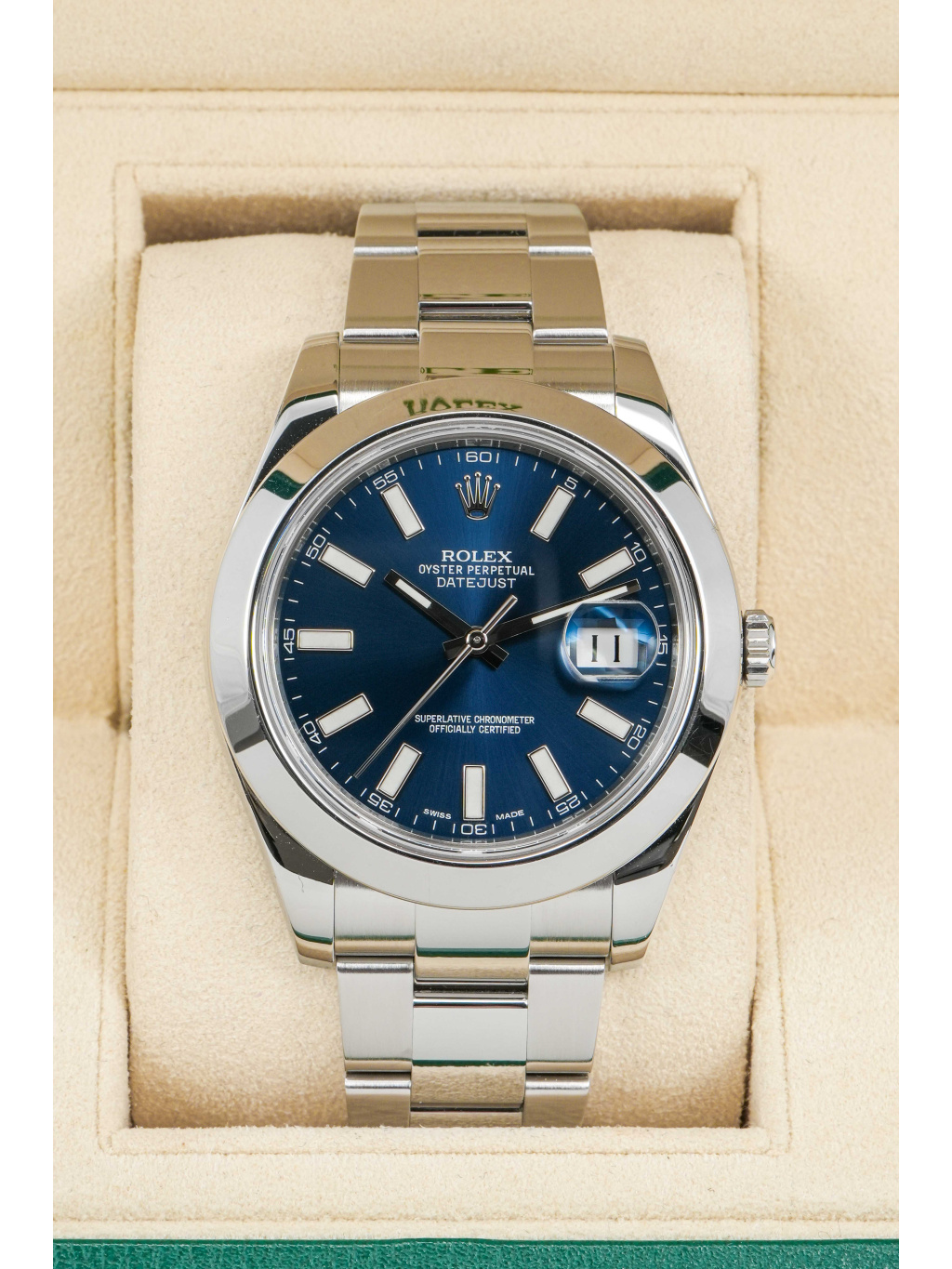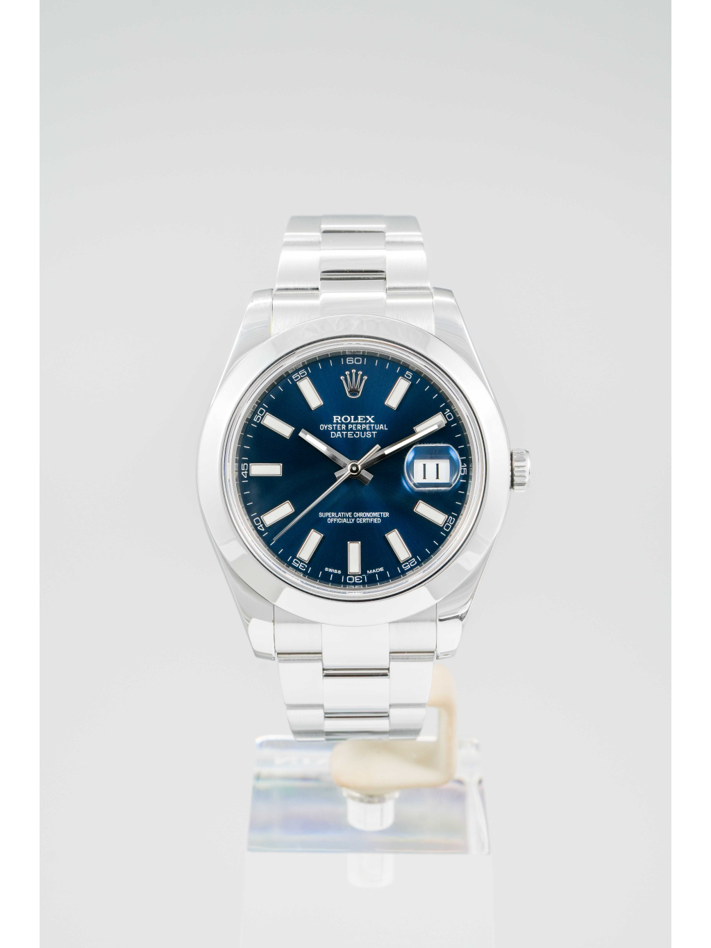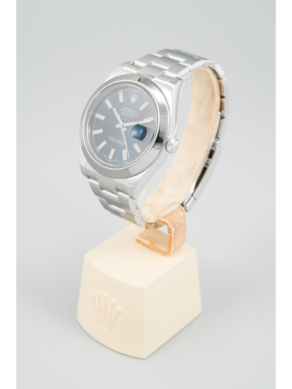 The 41 mm case is made of Oystersteel and complemented by a smooth bezel. The blue dial is decorated with applied indices with luminescent filling, which ensure excellent readability even in low light conditions. Above the date window at 3 o'clock is a Cyclops magnifying lens. It is protected by a scratch-resistant sapphire crystal.