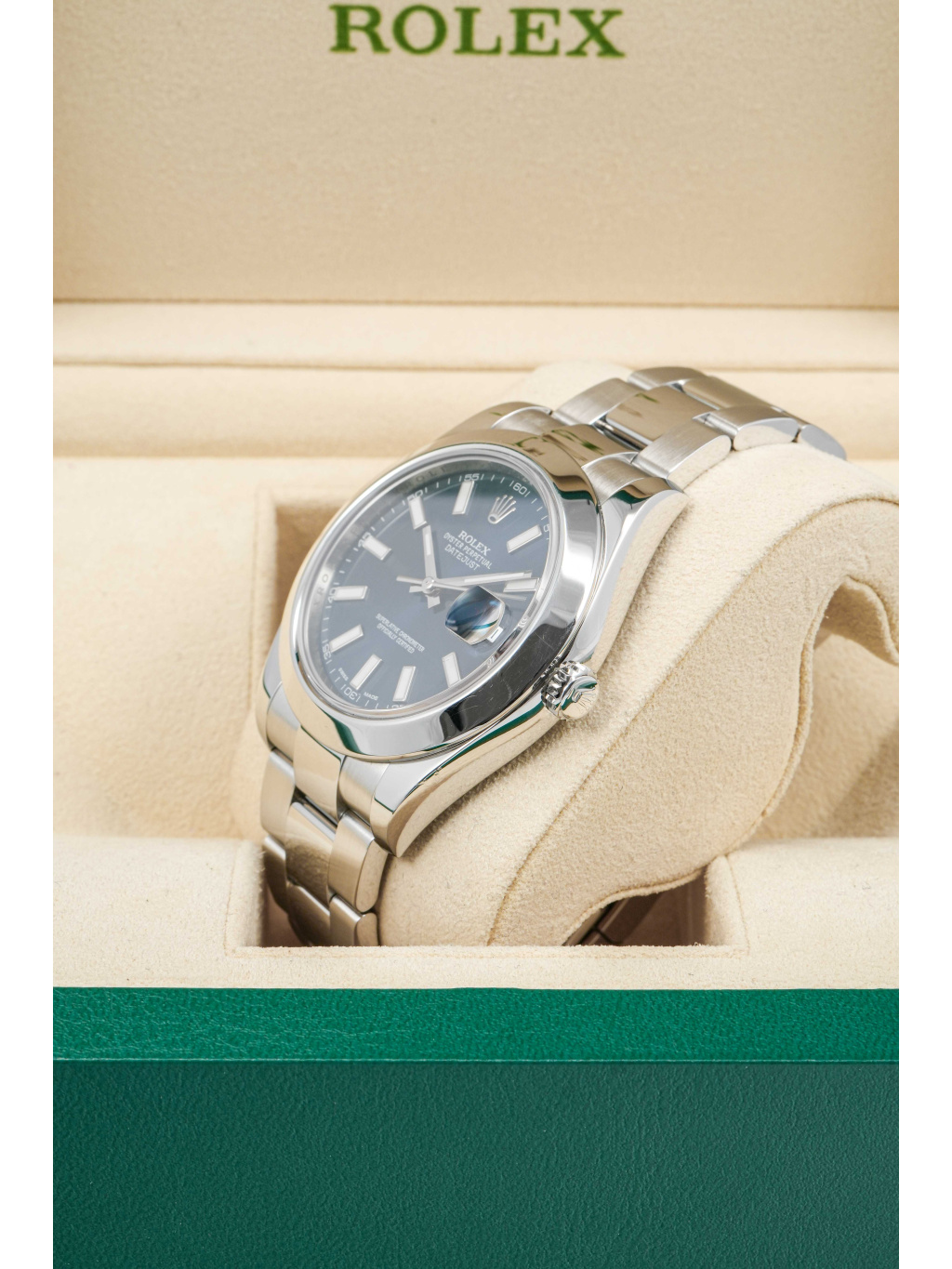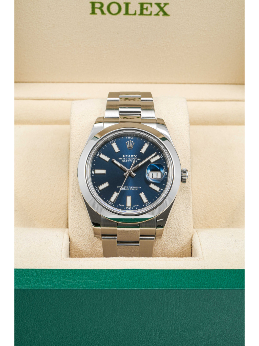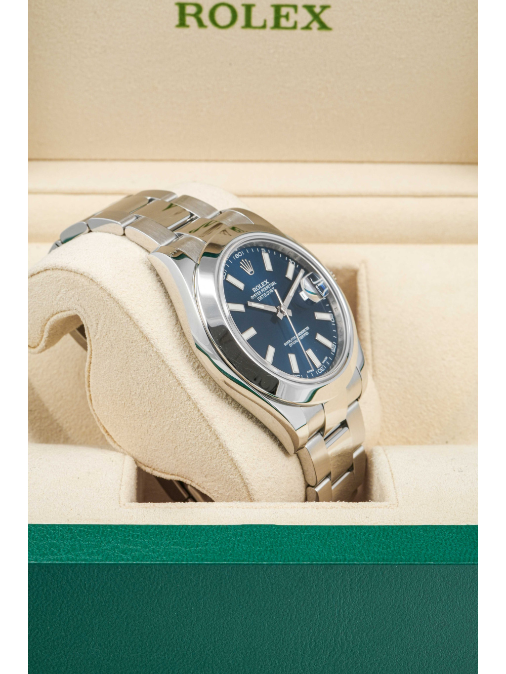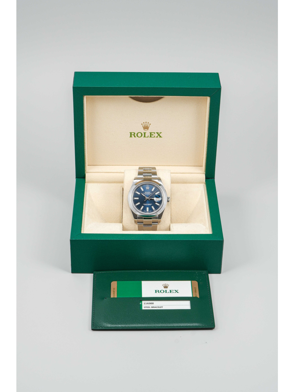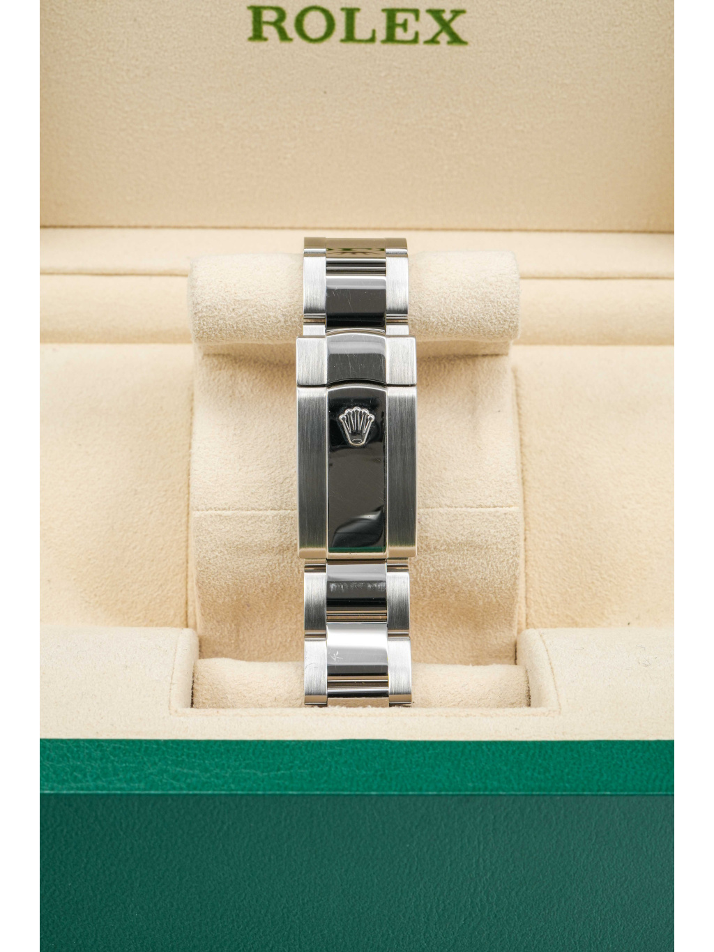 The watch is fitted with an Oyster bracelet with three-piece links and secured with an Oysterclasp with Easylink extension system, which allows for an additional 5 mm for greater comfort. Inside, it is powered by caliber 3136, an automatic movement with quick date setting and a power reserve of approximately 48 hours. Water resistance is set at 100 meters, making the model a reliable companion for everyday wear.