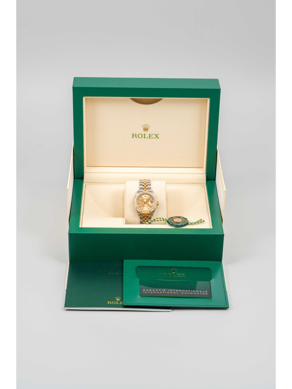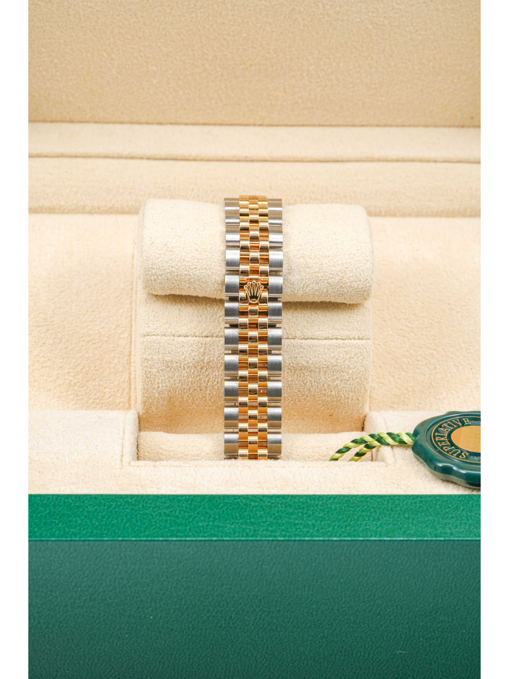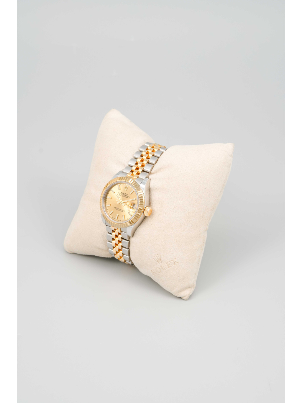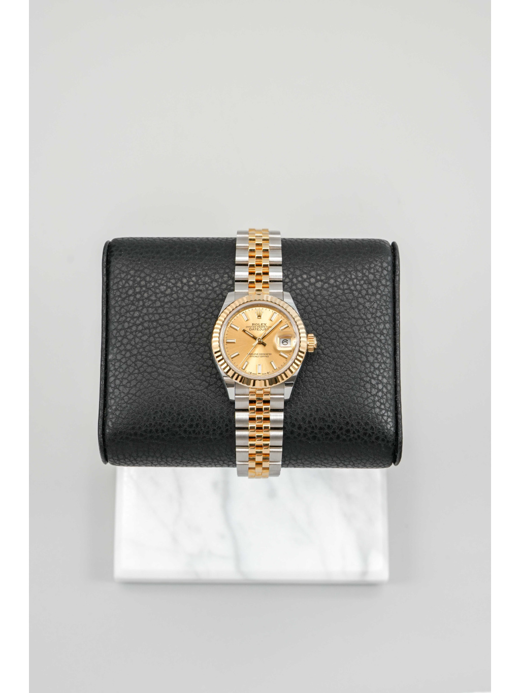 The 28 mm case is made from a combination of Oystersteel and 18 ct yellow gold, which is also used on the iconic fluted bezel. The champagne dial elegantly matches the warm tone of the gold and is set with applied hour markers and hands with Chromalight luminescent filling for good readability. A sapphire crystal with a Cyclops lens above the date is a matter of course. The watch is fitted with an iconic five-piece link Jubilee bracelet, which is extremely comfortable and visually very refined. The clasp is secured by an elegantly concealed Crownclasp. Water resistance is 100 meters.