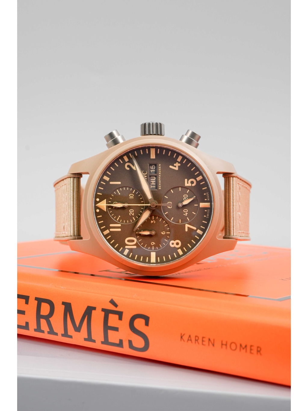 Pouzdro má průměr 41,9 mm a výšku 15,5 mm a je vyrobené z pískově béžové keramické hmoty s matným povrchem. Dýnko je titanové a hodinky chrání vypouklé safírové sklíčko s antireflexní úpravou. Hnědý číselník je přehledný a vysoce kontrastní, s luminiscenčními ručkami a indexy, a nabízí rozložení chronografu se 30minutovým a 12hodinovým sčítačem, malou vteřinovkou a day-date na 3. hodině. Na ruce sedí na béžovém kaučukovém řemínku s textilní vložkou. Voděodolnost činí 100 metrů.