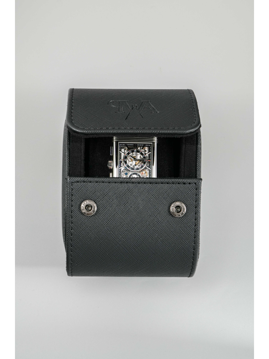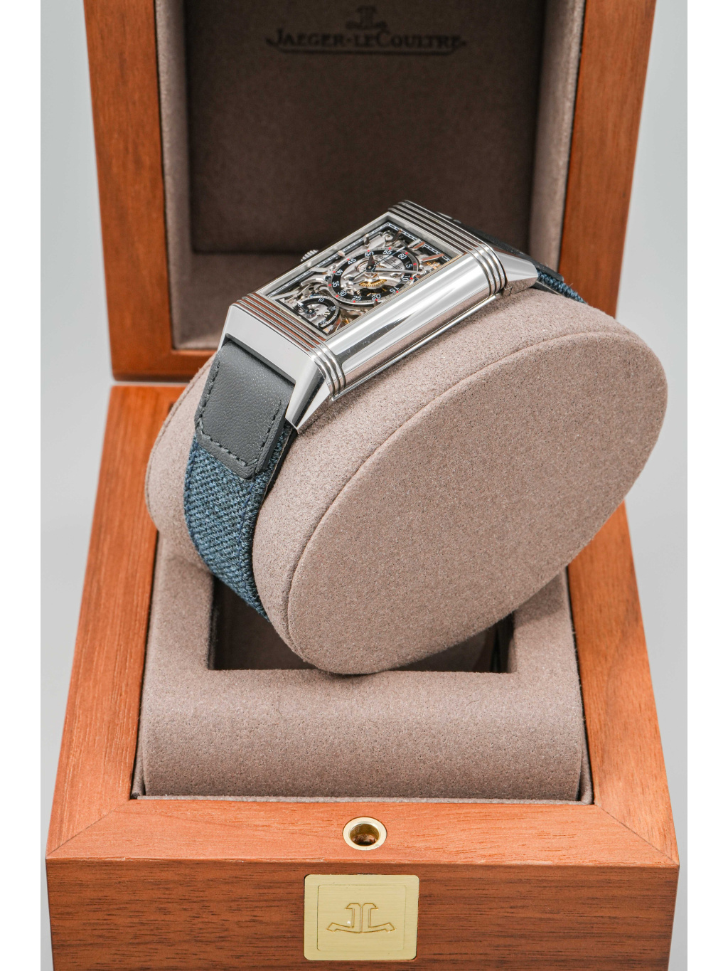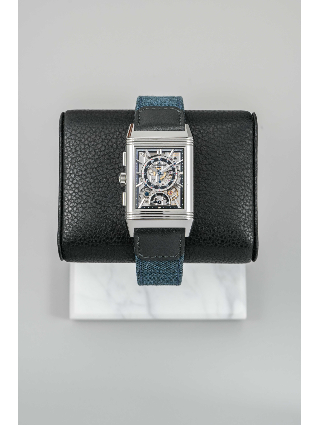 Obdélníkové pouzdro z leštěné nerezové oceli má rozměry 49,4 × 29,9 mm a skrývá dva výrazné světy. Přední strana nabízí čistý modrý číselník s sunburst úpravou, stříbrnými indexy a elegantními ručkami Dauphine. Otočením pouzdra se odhalí otevřený skeletovaný chronograf se stříbrným číselníkem a modrými akcenty, který precizně zobrazuje měření času. Hodinky doplňuje ručně šitý modrý kožený řemínek Casa Fagliano, snadno vyměnitelný díky rychloupínacímu systému.