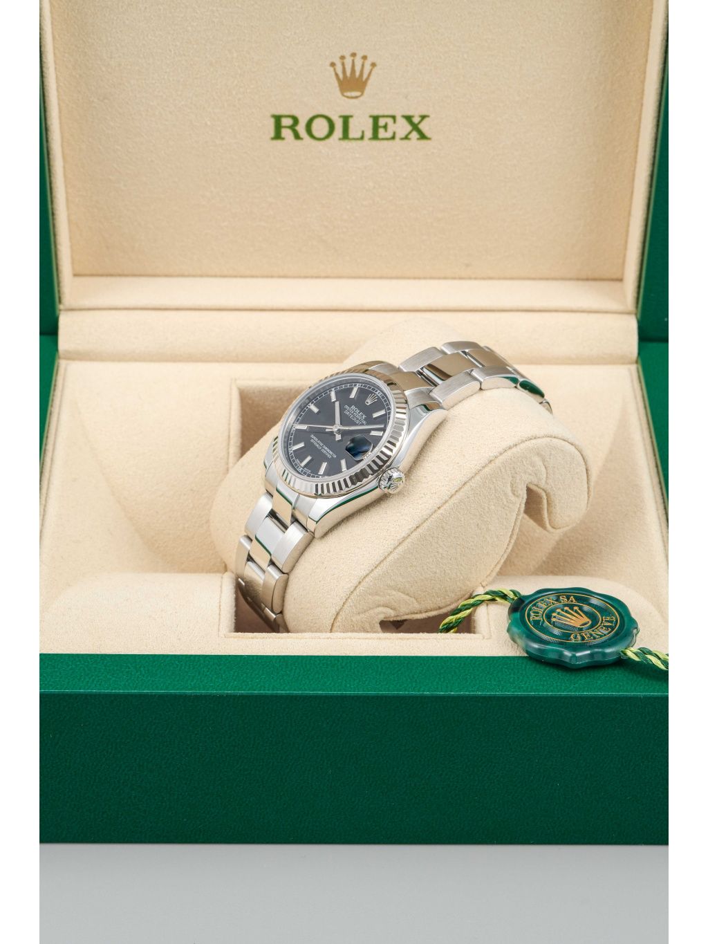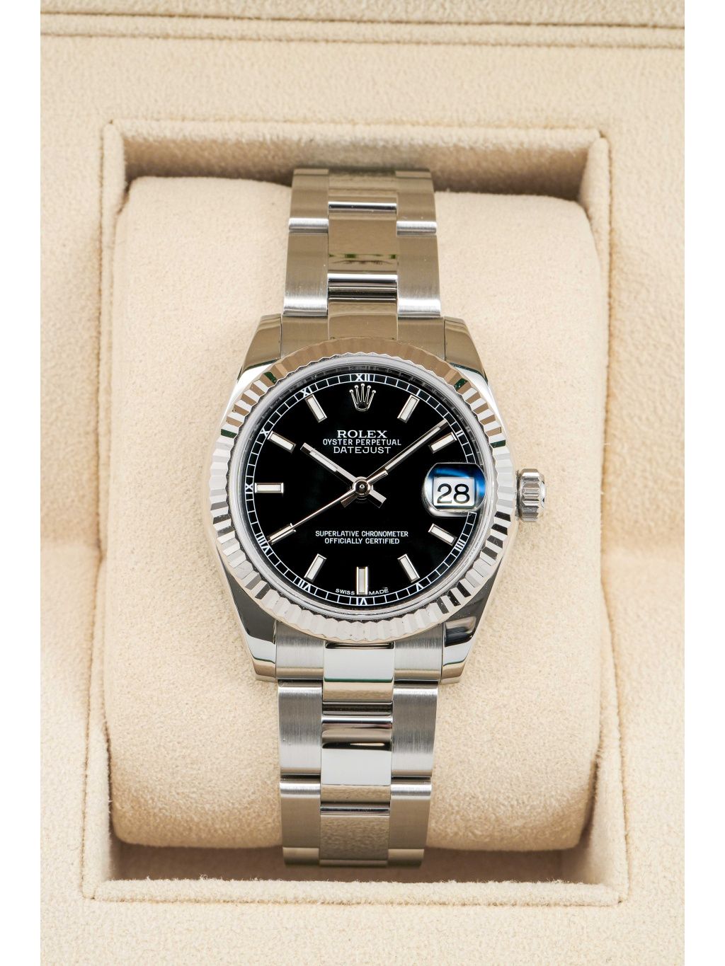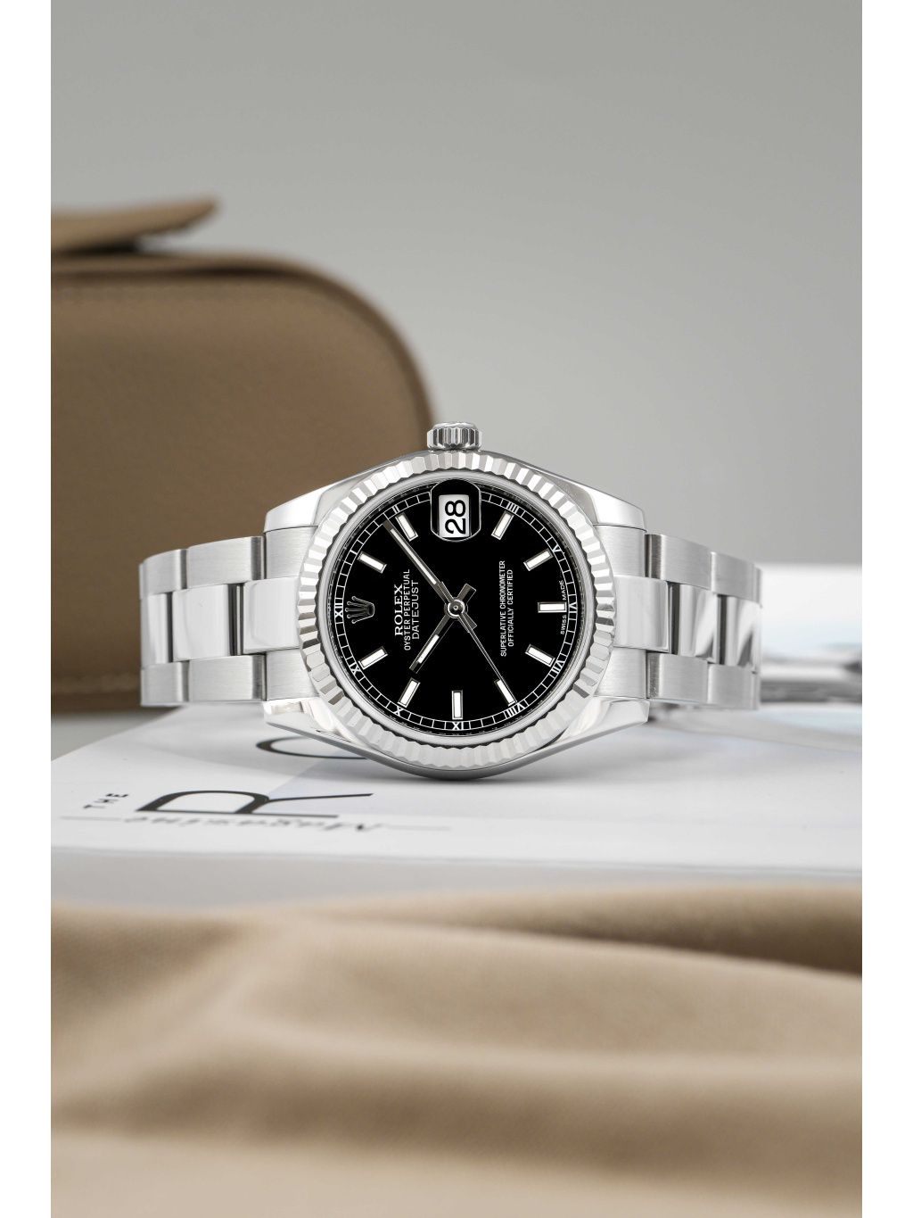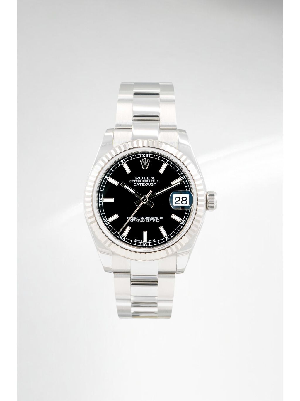 Pouzdro z kombinace oceli Oystersteel a bílého zlata má velikost 31 mm a je doplněno typickou vroubkovanou lunetou z bílého zlata, která dodává hodinkám charakteristický lesk. Černý číselník nabízí čistý a dobře čitelný vzhled, doplněný aplikovanými indexy a ručkami s luminiscenční výplní. Datum na pozici třetí hodiny je zvýrazněno ikonickou lupou Cyclops. Hodinky jsou osazeny ocelovým náramkem Oyster, který podtrhuje jejich sportovně-elegantní charakter. Vodotěsnost 100 metrů zajišťuje bezproblémové každodenní použití.