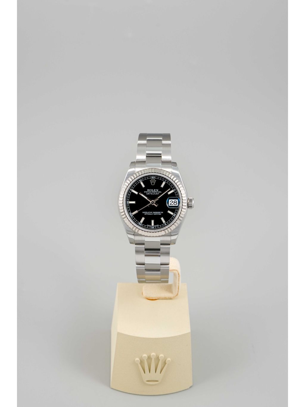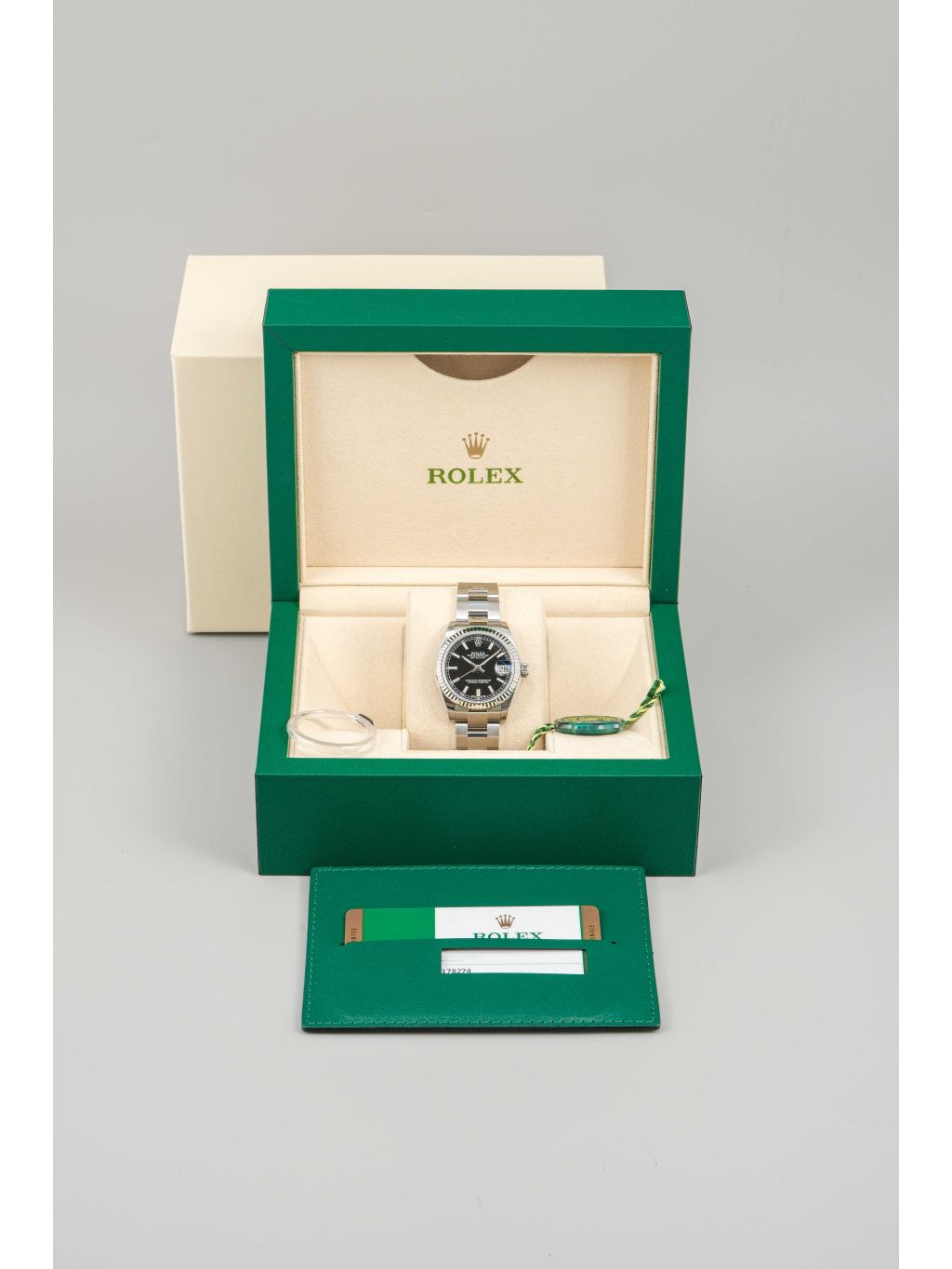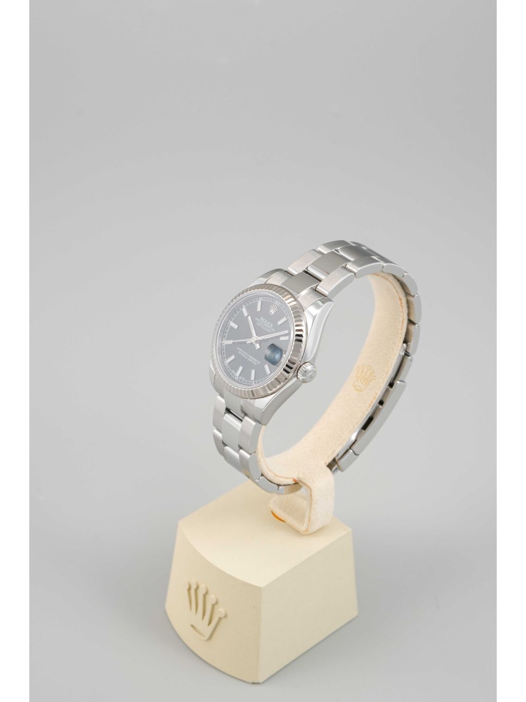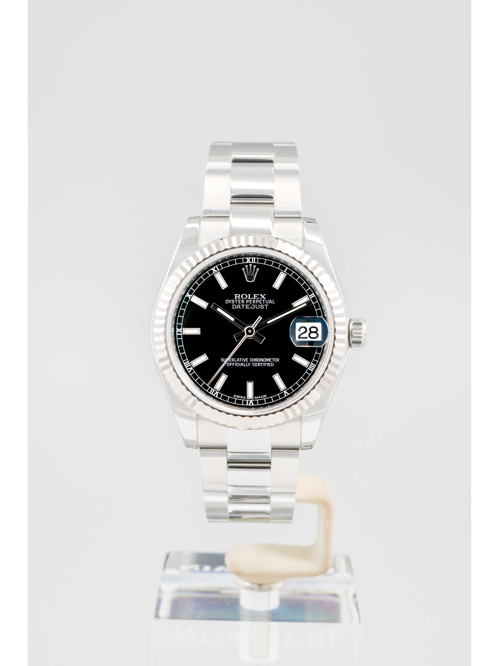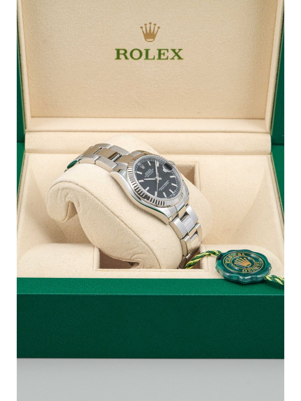Pouzdro z kombinace oceli Oystersteel a bílého zlata má velikost 31 mm a je doplněno typickou vroubkovanou lunetou z bílého zlata, která dodává hodinkám charakteristický lesk. Černý číselník nabízí čistý a dobře čitelný vzhled, doplněný aplikovanými indexy a ručkami s luminiscenční výplní. Datum na pozici třetí hodiny je zvýrazněno ikonickou lupou Cyclops. Hodinky jsou osazeny ocelovým náramkem Oyster, který podtrhuje jejich sportovně-elegantní charakter. Vodotěsnost 100 metrů zajišťuje bezproblémové každodenní použití.
