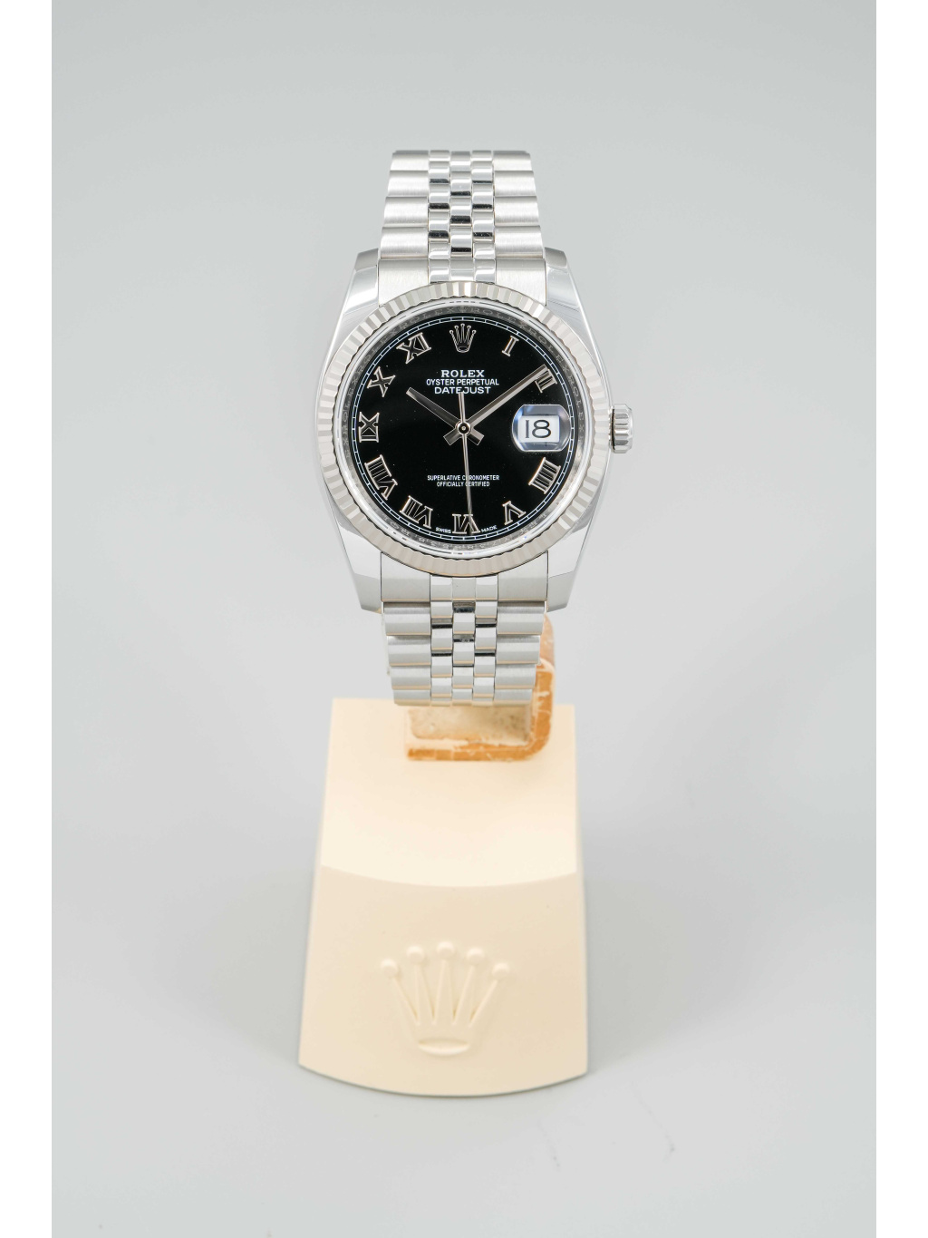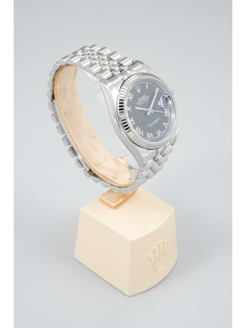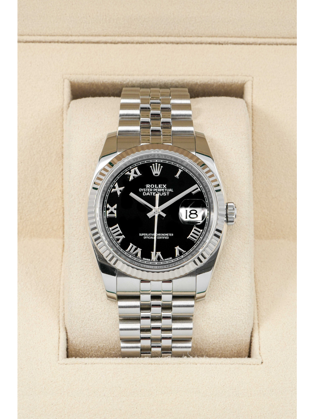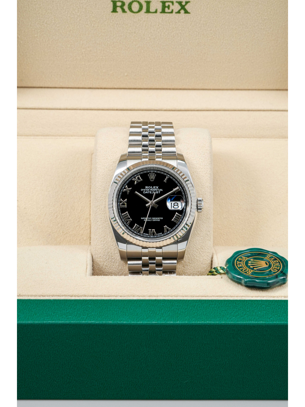 Pouzdro o velikosti 36 mm chrání safírové sklíčko s čočkou Cyclops nad datem. Černý číselník doplňují leštěné ručky a výrazné římské číslice, které modelu dodávají noblesní vzhled. Díky luminiscenčním bodům jsou hodinky dobře čitelné i za zhoršených světelných podmínek. Elegantní Jubilee náramek s pětidílnými články a Oysterclasp sponou zajišťuje mimořádný komfort při nošení i vizuální lehkost.