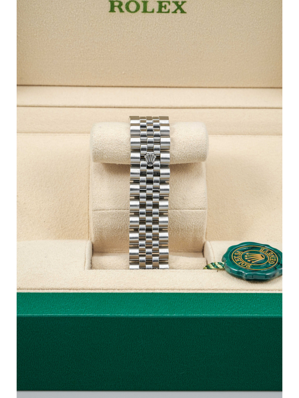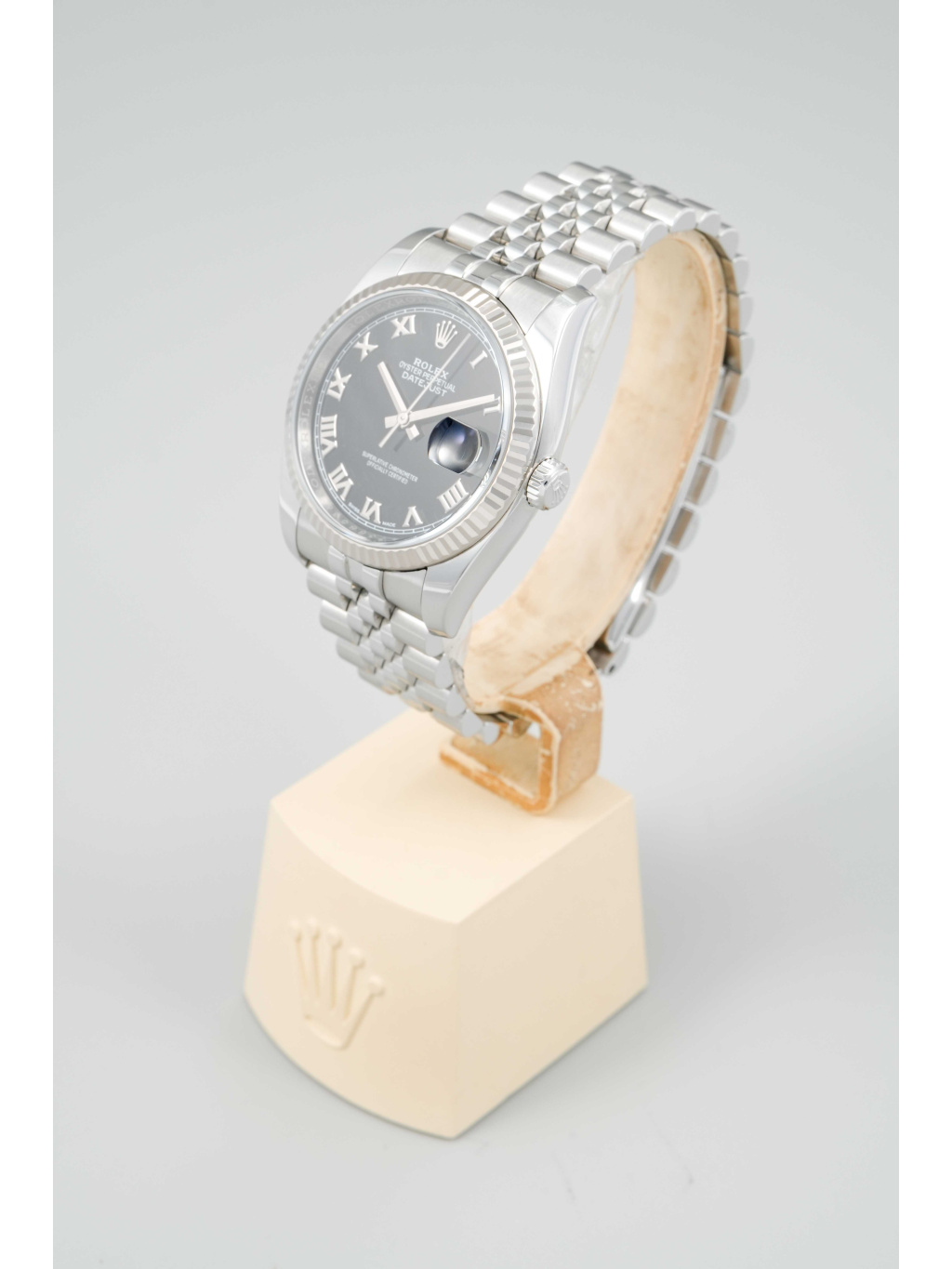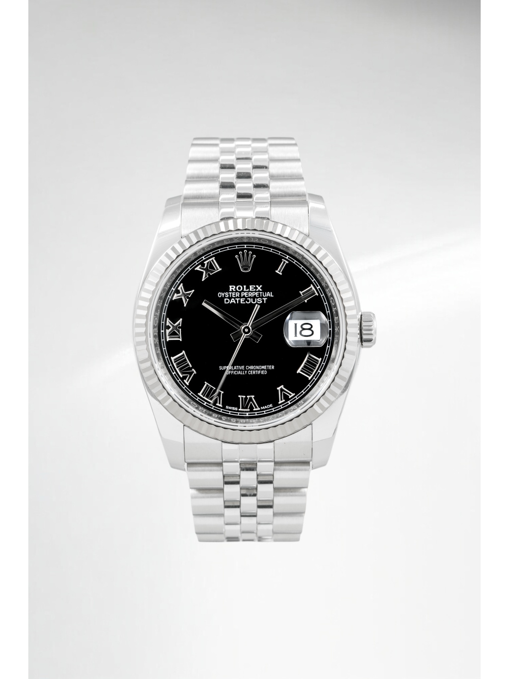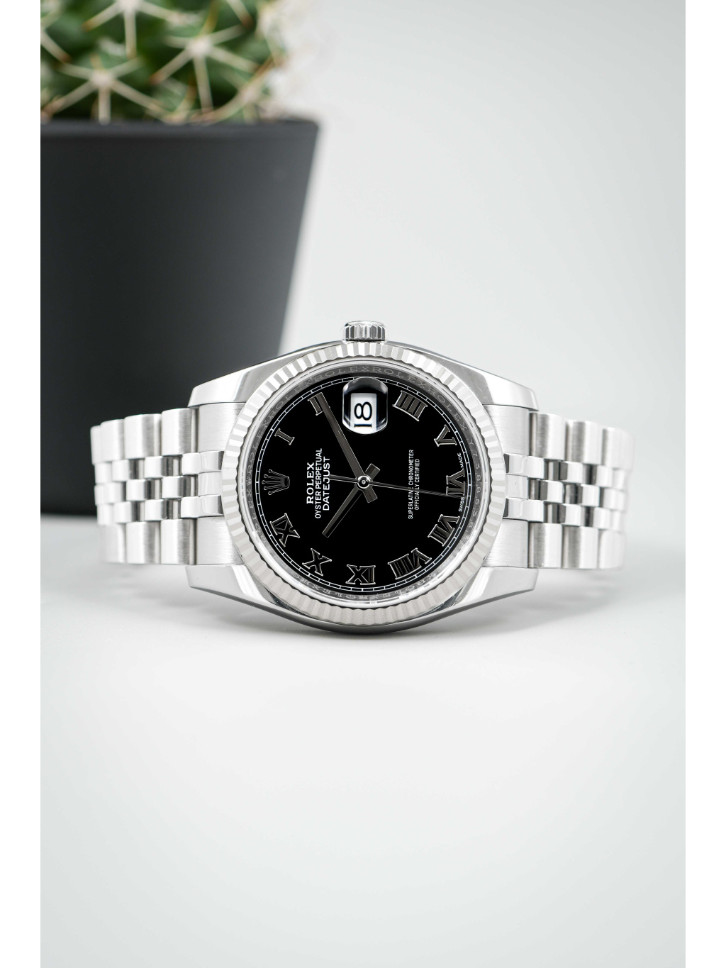 Pouzdro o velikosti 36 mm chrání safírové sklíčko s čočkou Cyclops nad datem. Černý číselník doplňují leštěné ručky a výrazné římské číslice, které modelu dodávají noblesní vzhled. Díky luminiscenčním bodům jsou hodinky dobře čitelné i za zhoršených světelných podmínek. Elegantní Jubilee náramek s pětidílnými články a Oysterclasp sponou zajišťuje mimořádný komfort při nošení i vizuální lehkost.