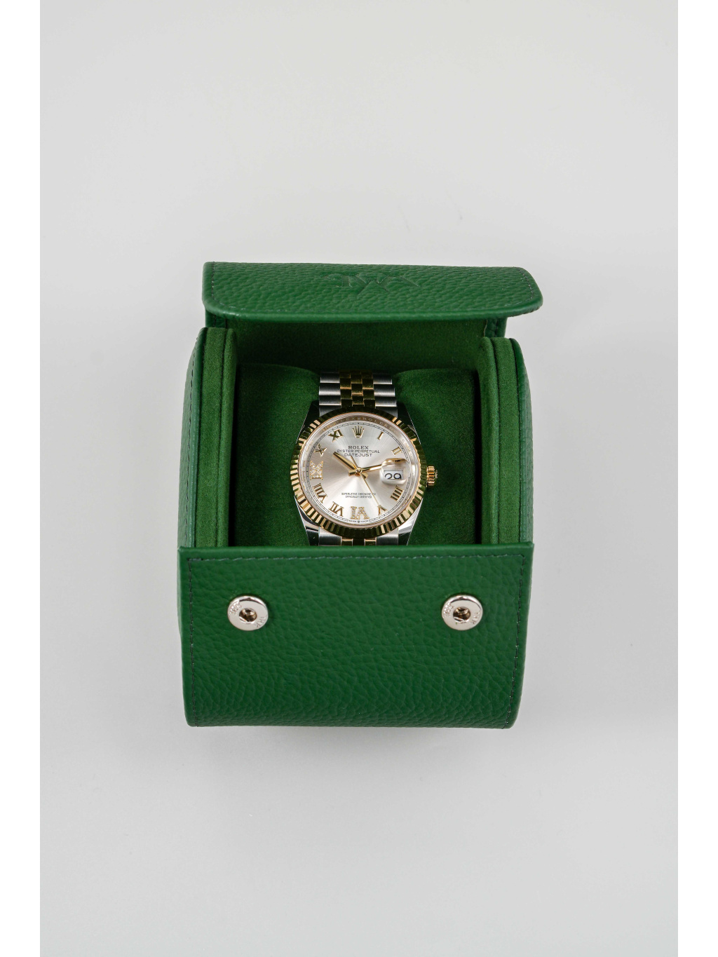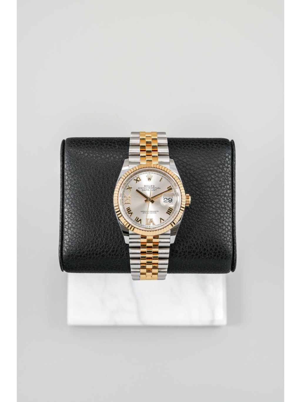 Rolex Datejust 36 v dvoutónovém provedení oceli Oystersteel a 18kt žlutého zlata představuje nadčasovou kombinaci elegance a luxusu. Varianta se stříbrným číselníkem osazeným diamanty působí sofistikovaně a velmi vyváženě – decentní třpyt drahokamů dodává hodinkám reprezentativní charakter, aniž by narušoval jejich klasický vzhled.