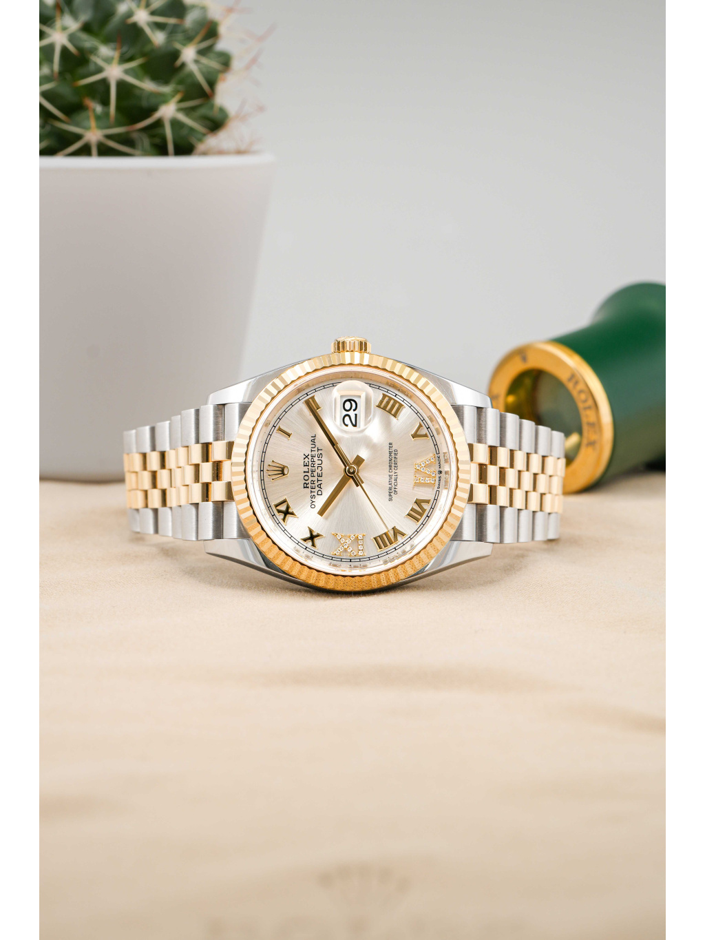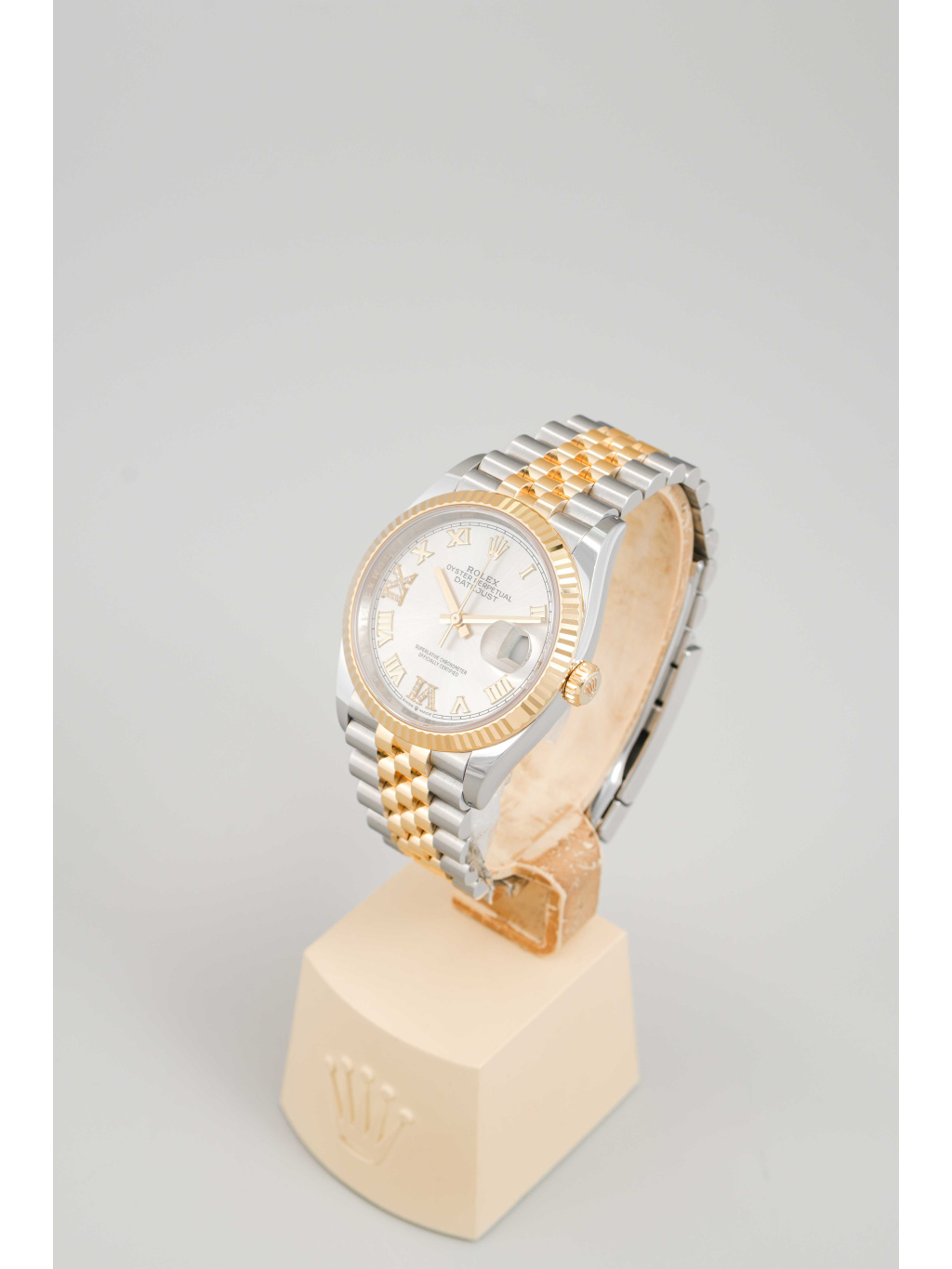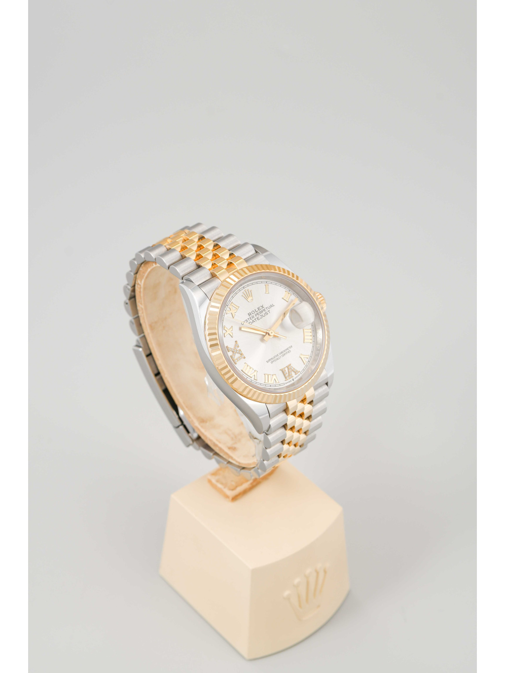 Pouzdro o průměru 36 mm je doplněno ikonickou vroubkovanou lunetou ze žlutého zlata, která je jedním z nejtypičtějších znaků modelu Datejust. Stříbrný číselník s jemným sunburst efektem je osazen diamantovými hodinovými indexy a zlatými ručkami s luminiscenční výplní Chromalight pro dobrou čitelnost. Safírové sklíčko s čočkou Cyclops nad datem je samozřejmostí. Hodinky jsou osazeny elegantním jubilee náramkem s pětidílnými články, který nabízí vysoký komfort a kultivovaný vzhled. Zapínání zajišťuje spona Oysterclasp. Voděodolnost činí 100 metrů.