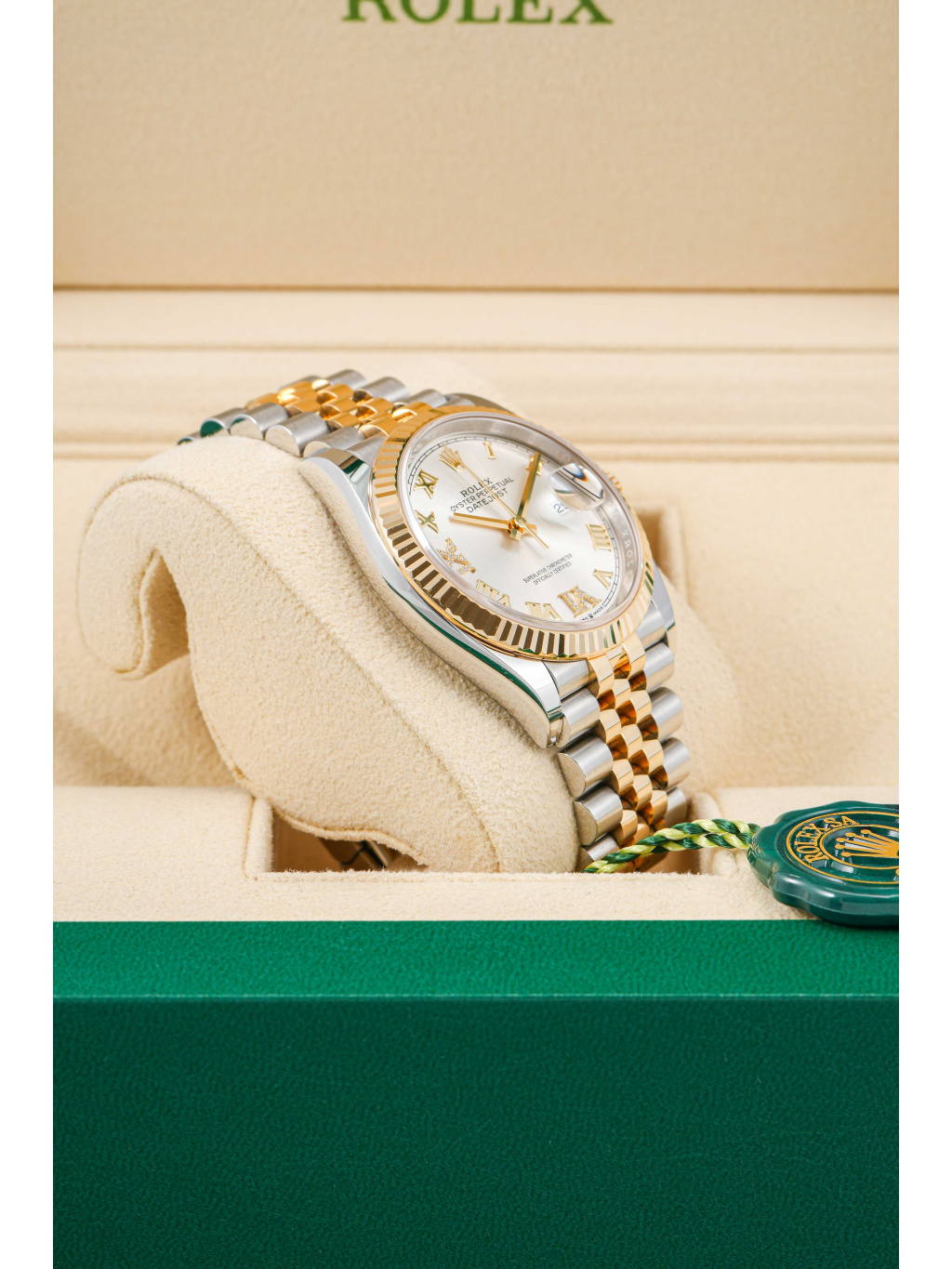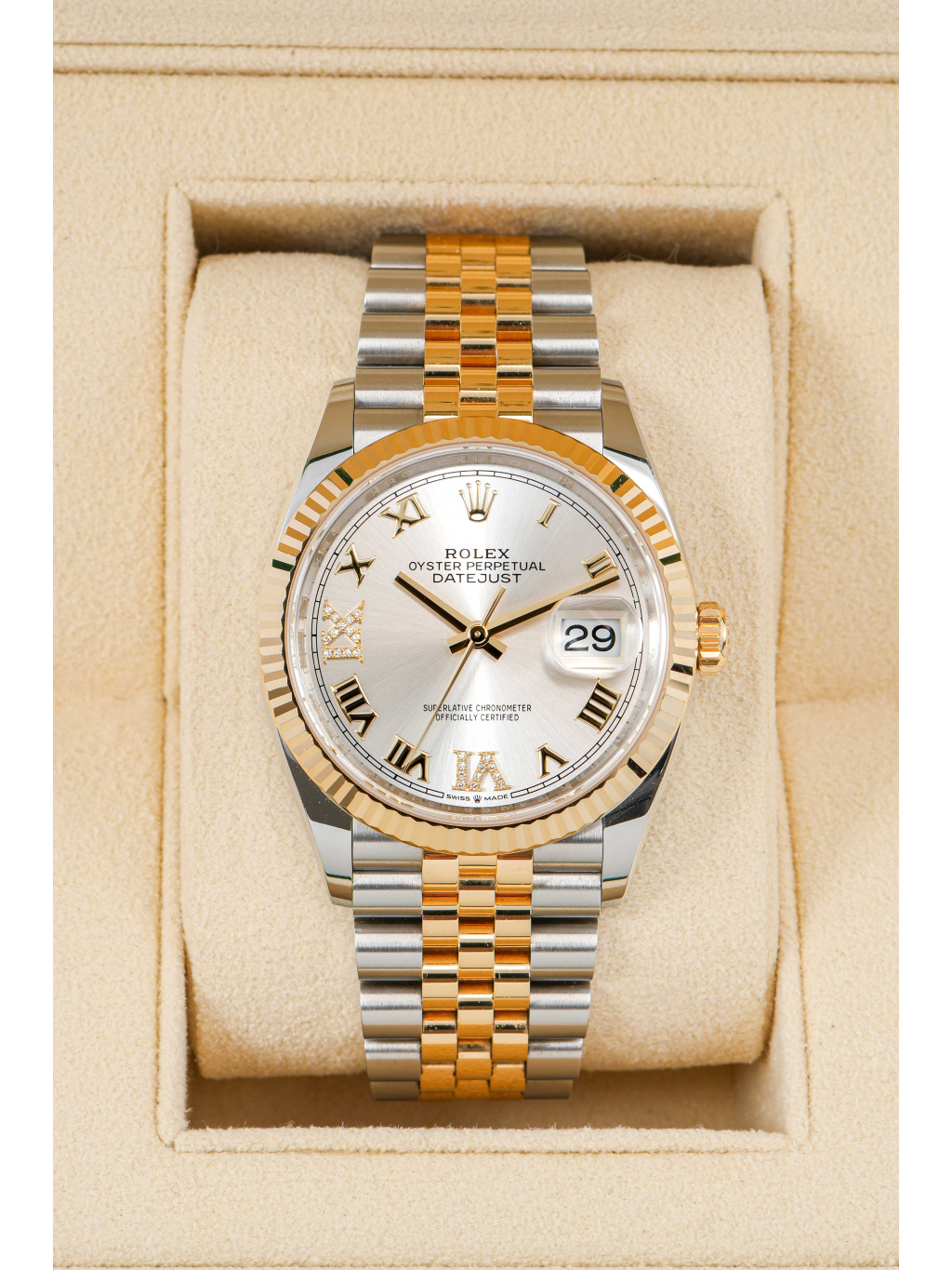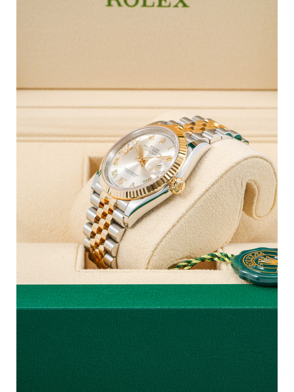 Pouzdro o průměru 36 mm je doplněno ikonickou vroubkovanou lunetou ze žlutého zlata, která je jedním z nejtypičtějších znaků modelu Datejust. Stříbrný číselník s jemným sunburst efektem je osazen diamantovými hodinovými indexy a zlatými ručkami s luminiscenční výplní Chromalight pro dobrou čitelnost. Safírové sklíčko s čočkou Cyclops nad datem je samozřejmostí. Hodinky jsou osazeny elegantním jubilee náramkem s pětidílnými články, který nabízí vysoký komfort a kultivovaný vzhled. Zapínání zajišťuje spona Oysterclasp. Voděodolnost činí 100 metrů.
