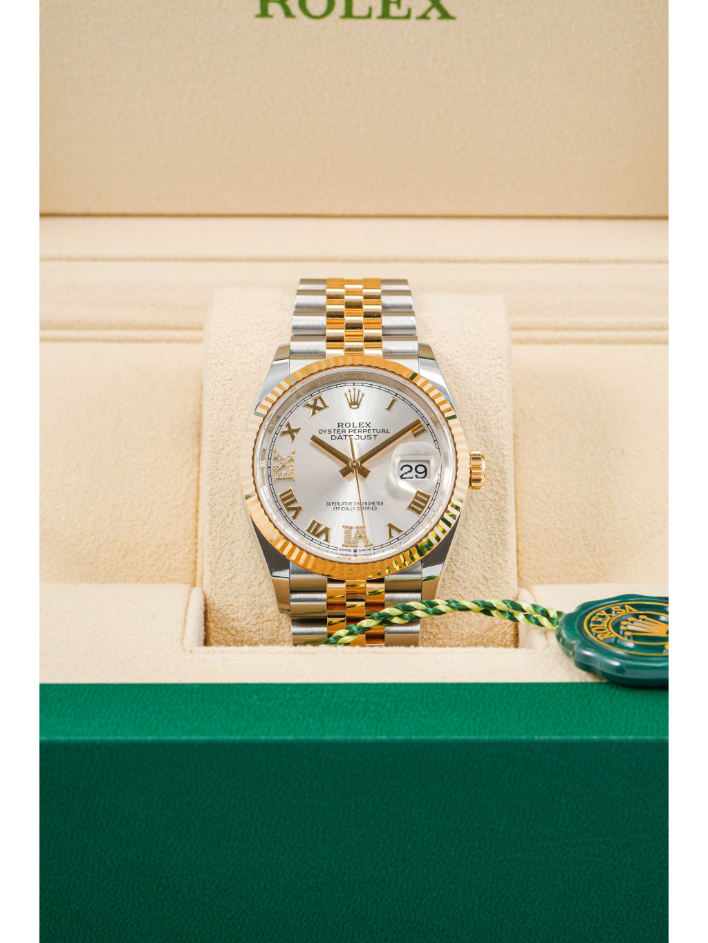 Rolex Datejust 36 se stříbrným diamantovým číselníkem a jubilee náramkem je ideální volbou pro ty, kteří hledají klasický Rolex s luxusním detailem a nadčasovou hodnotou.
