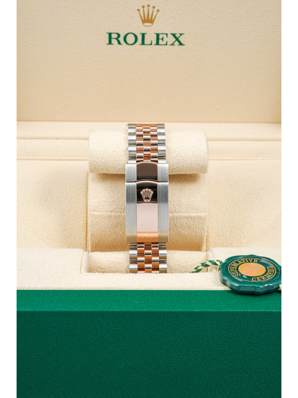 Rolex Datejust 41 v kombinaci oceli Oystersteel a 18kt růžového zlata Everose představuje harmonii luxusu a elegance. Tato varianta s čokoládově hnědým číselníkem a jubilee náramkem působí teple, sofistikovaně a mimořádně stylově. Vroubkovaná luneta z růžového zlata odráží světlo s jemným leskem a podtrhuje charakteristický vzhled jedné z nejikoničtějších řad značky Rolex.