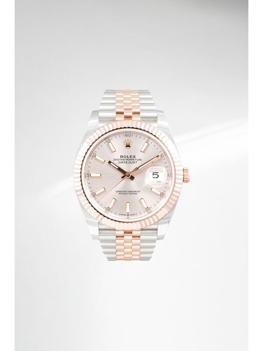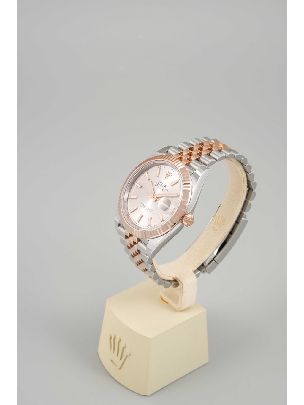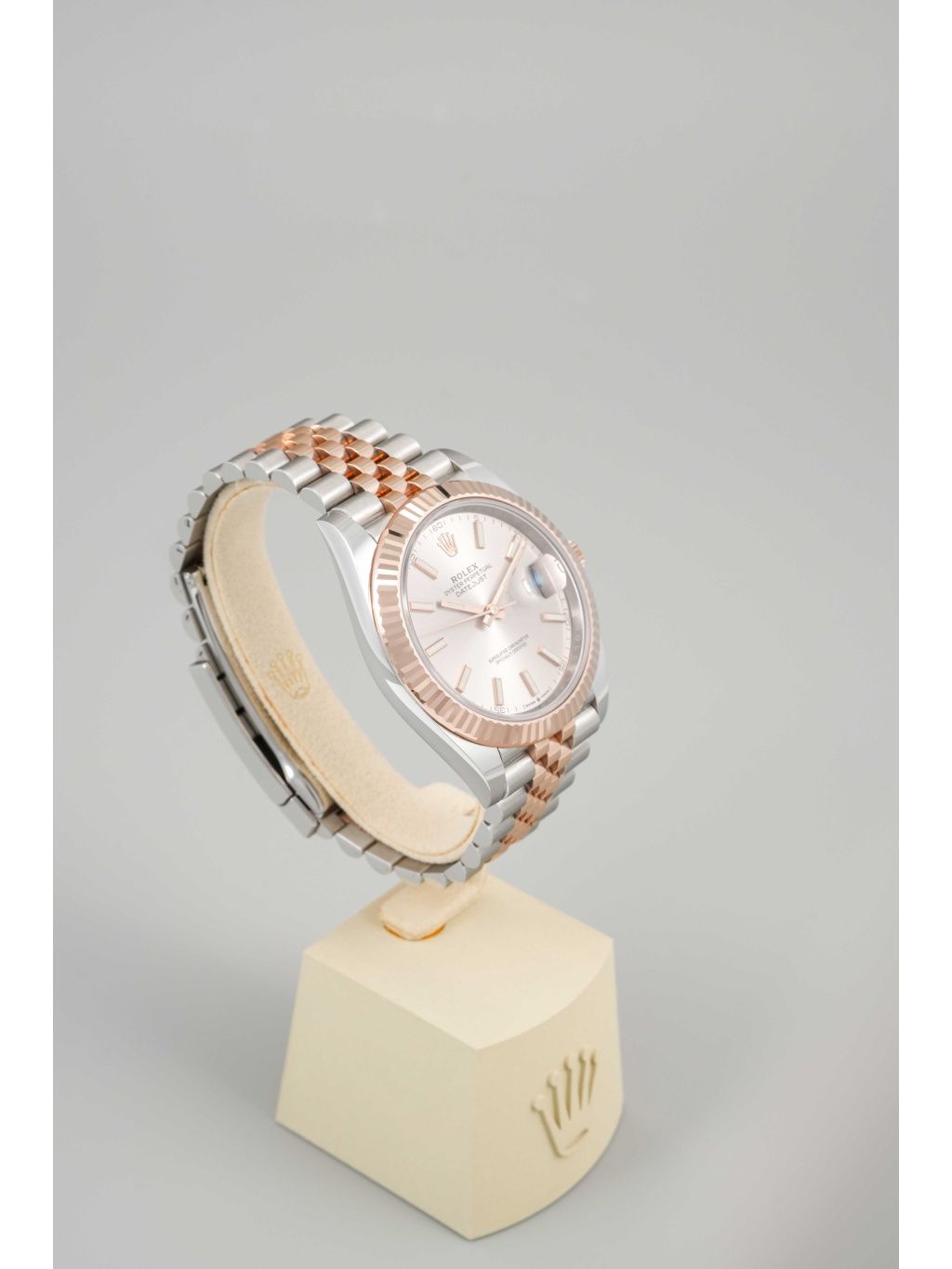 Pouzdro z kombinace oceli Oystersteel a Everose zlata má velikost 41 mm a je doplněno typickou vroubkovanou lunetou z růžového zlata, která dodává hodinkám výrazný lesk. Sundust číselník v teplém tónu růžového zlata vytváří jemnou hru světla a perfektně ladí s celkovým barevným provedením. Aplikované indexy a ručky s luminiscenční výplní zajišťují výbornou čitelnost. Datum na pozici třetí hodiny je doplněno lupou Cyclops. Hodinky jsou osazeny náramkem Jubilee, který podtrhuje jejich elegantní charakter a zároveň nabízí vysoký komfort při nošení. Vodotěsnost 100 metrů odpovídá každodennímu využití.