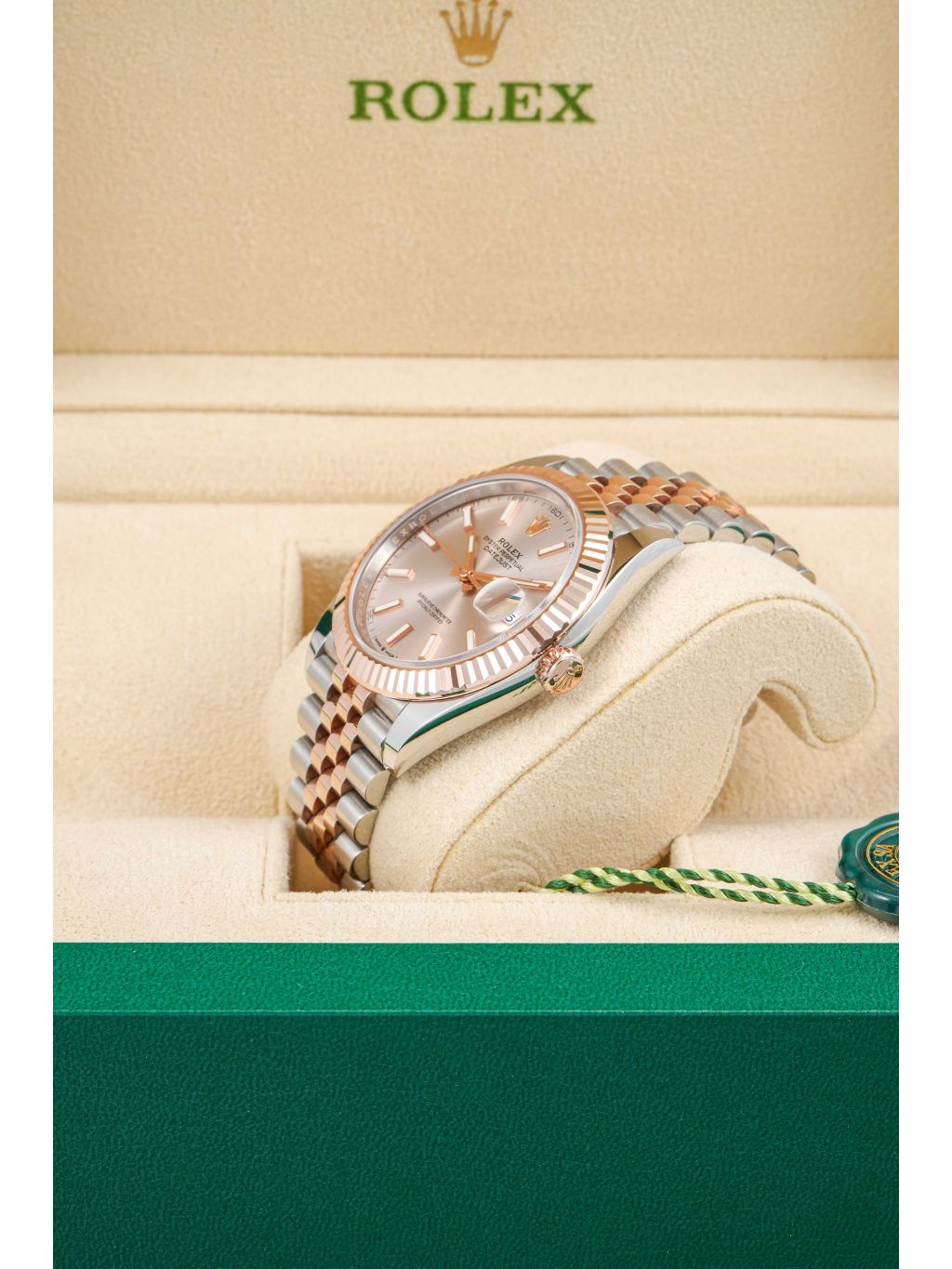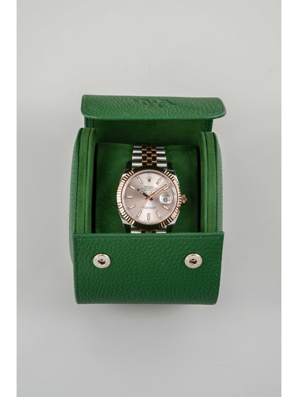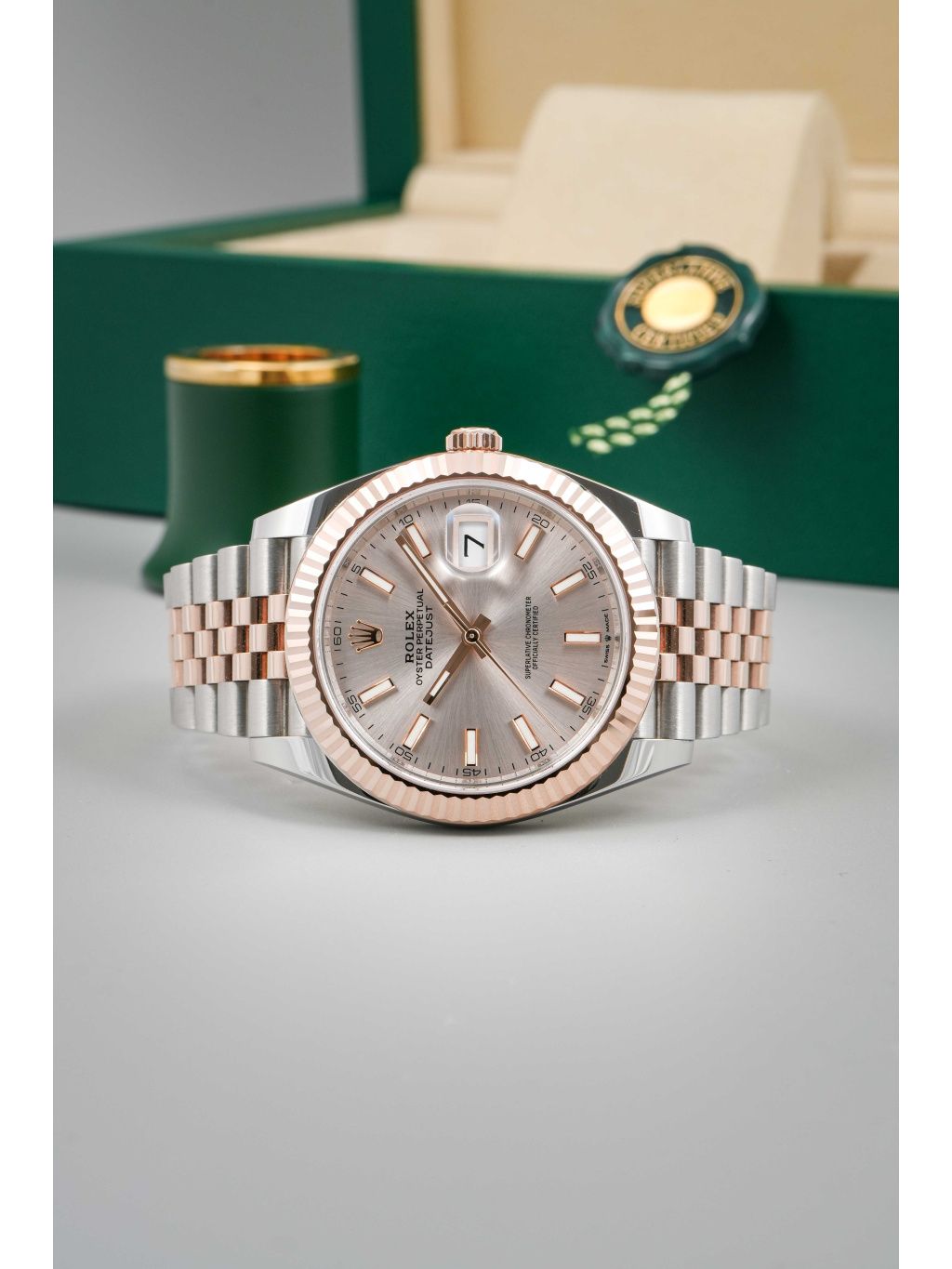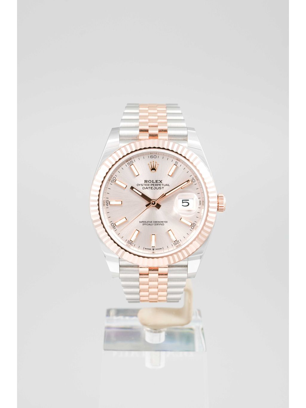 Pouzdro z kombinace oceli Oystersteel a Everose zlata má velikost 41 mm a je doplněno typickou vroubkovanou lunetou z růžového zlata, která dodává hodinkám výrazný lesk. Sundust číselník v teplém tónu růžového zlata vytváří jemnou hru světla a perfektně ladí s celkovým barevným provedením. Aplikované indexy a ručky s luminiscenční výplní zajišťují výbornou čitelnost. Datum na pozici třetí hodiny je doplněno lupou Cyclops. Hodinky jsou osazeny náramkem Jubilee, který podtrhuje jejich elegantní charakter a zároveň nabízí vysoký komfort při nošení. Vodotěsnost 100 metrů odpovídá každodennímu využití.