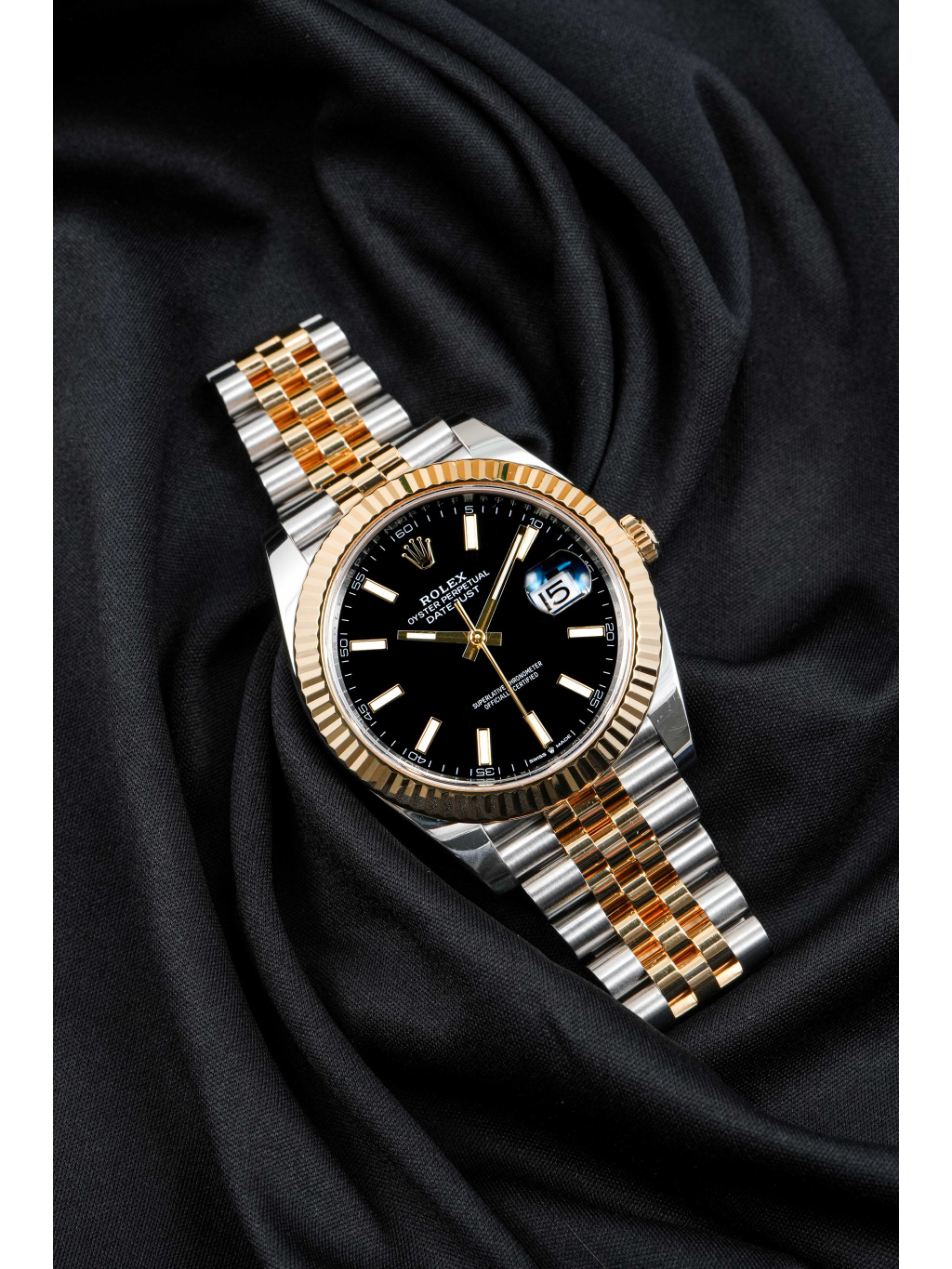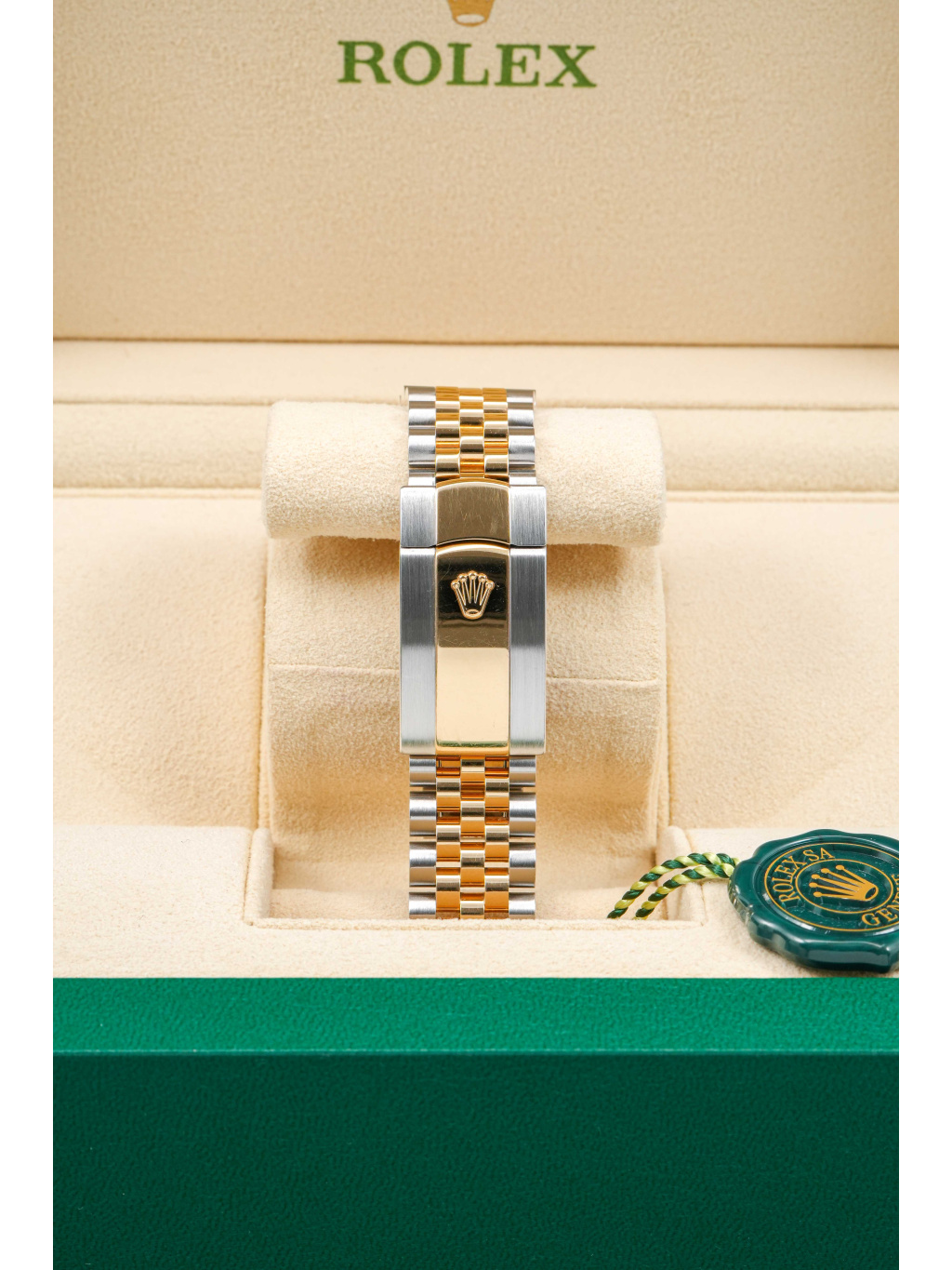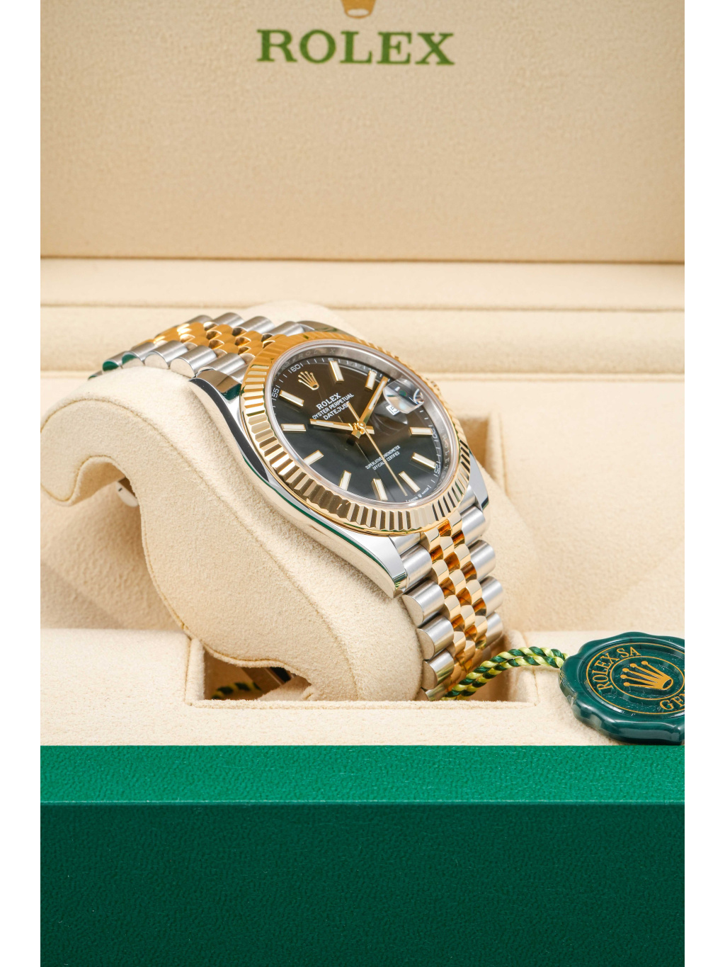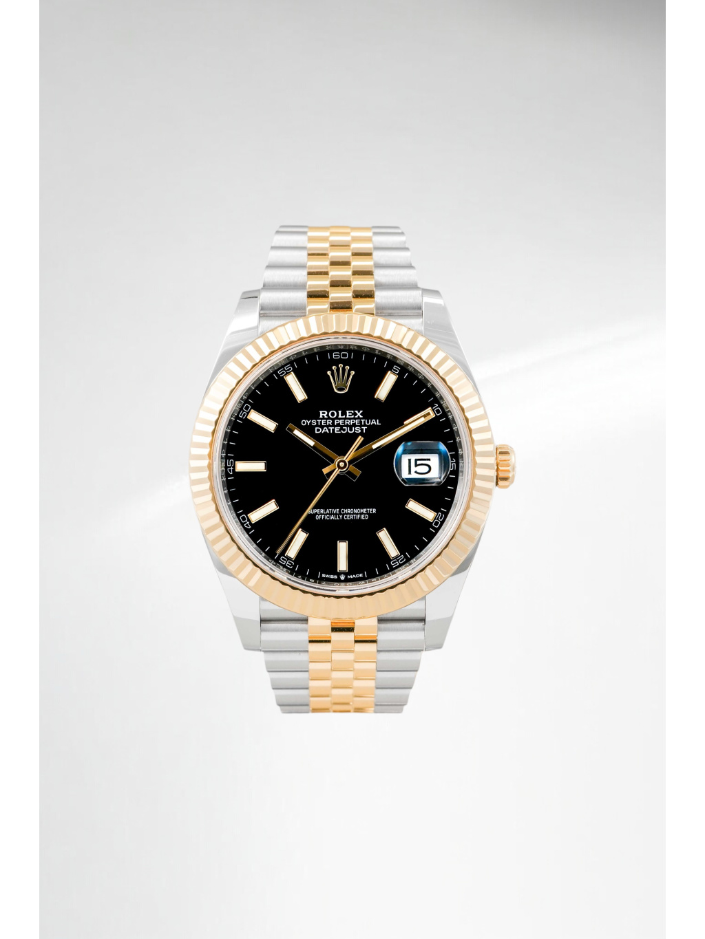 Rolex Datejust 41 v dvoutónovém provedení oceli Oystersteel a 18kt žlutého zlata patří mezi nejklasičtější a zároveň nejvýraznější konfigurace této ikonické kolekce. Varianta s černým číselníkem působí nadčasově, elegantně a velmi univerzálně. Kombinace tmavého ciferníku, zlatých detailů a jubilee náramku vytváří harmonický celek s výrazným luxusním charakterem.
