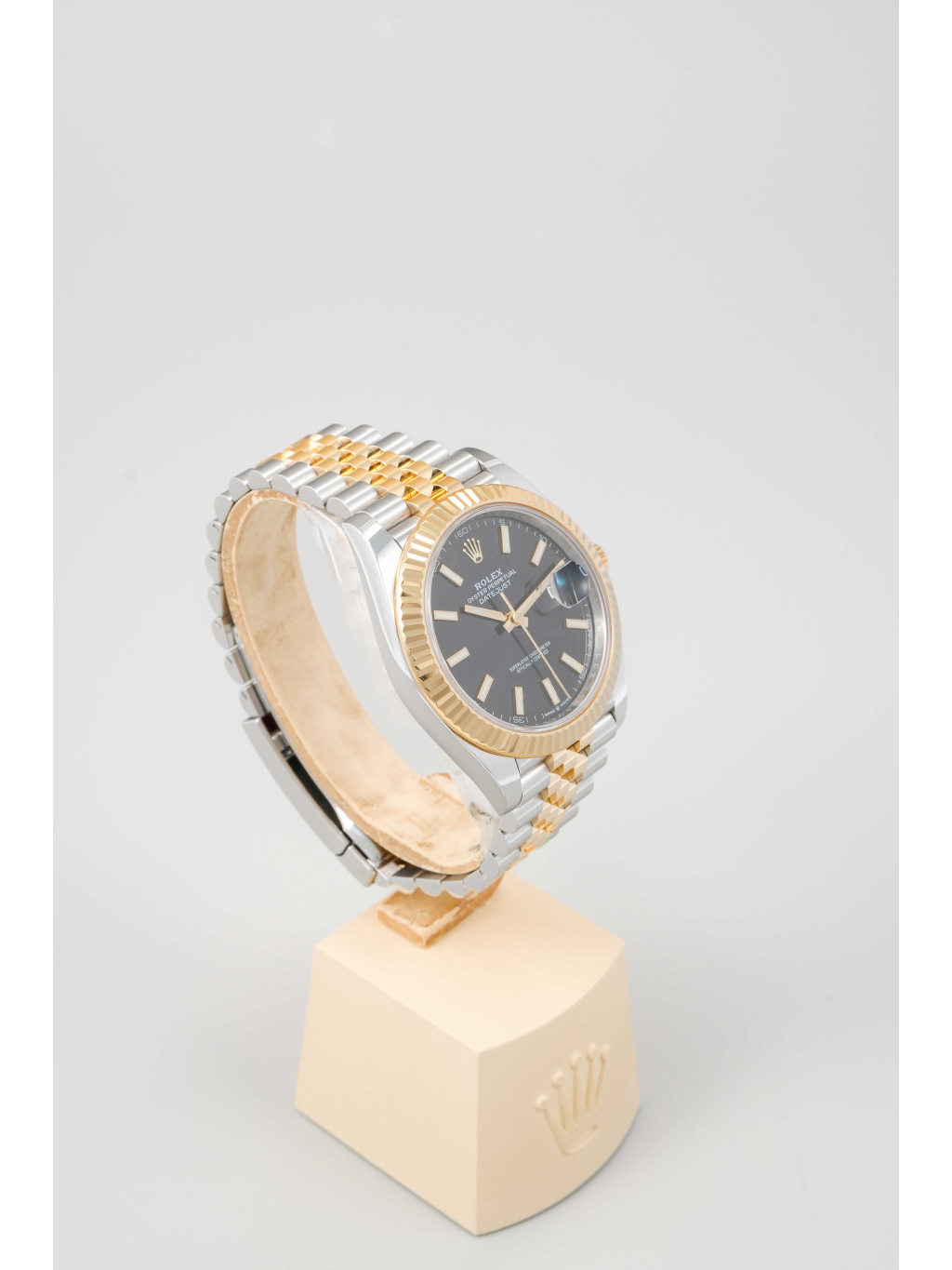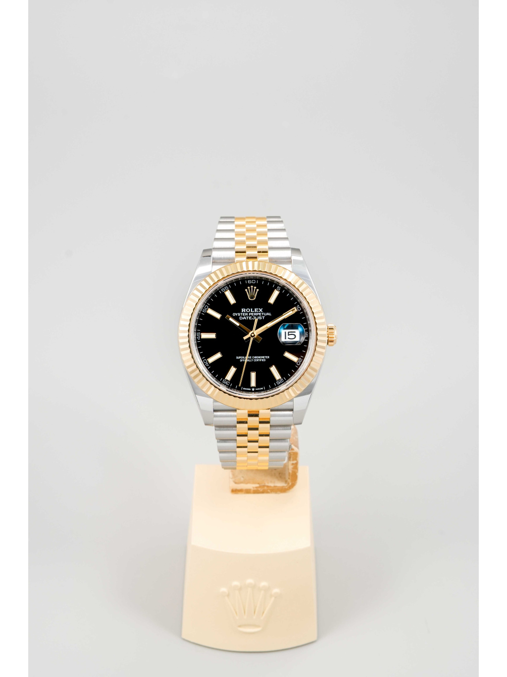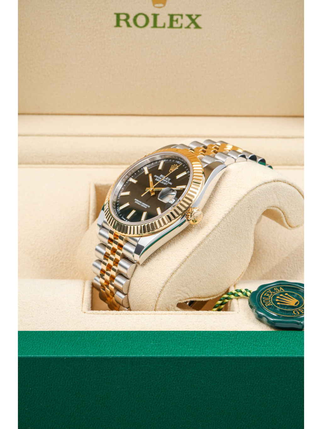 Rolex Datejust 41 v dvoutónovém provedení oceli Oystersteel a 18kt žlutého zlata patří mezi nejklasičtější a zároveň nejvýraznější konfigurace této ikonické kolekce. Varianta s černým číselníkem působí nadčasově, elegantně a velmi univerzálně. Kombinace tmavého ciferníku, zlatých detailů a jubilee náramku vytváří harmonický celek s výrazným luxusním charakterem.