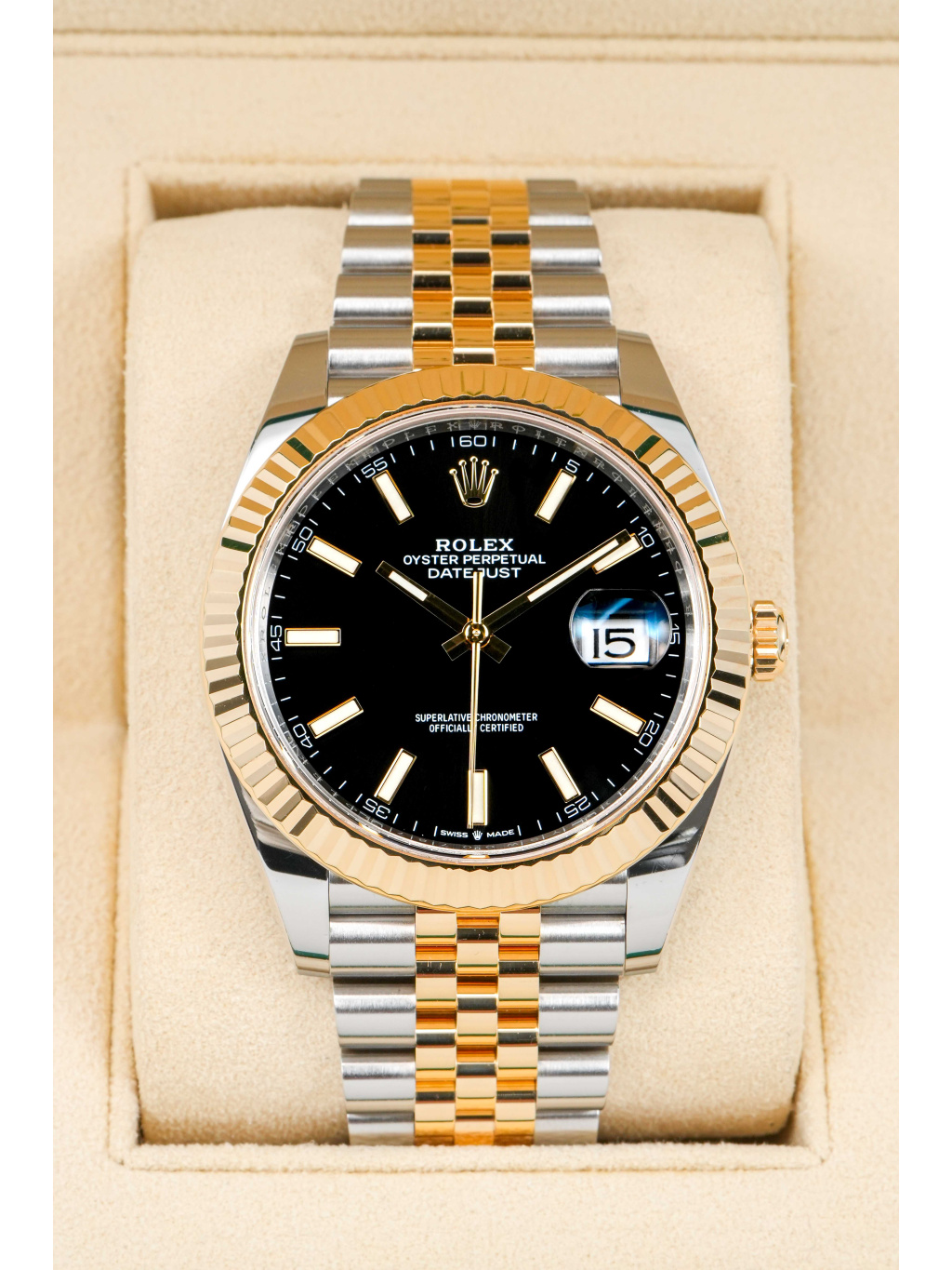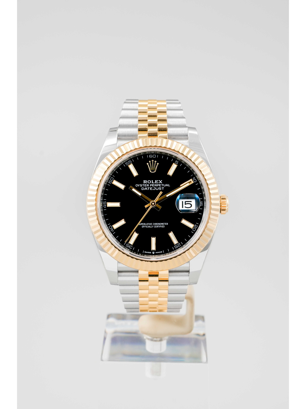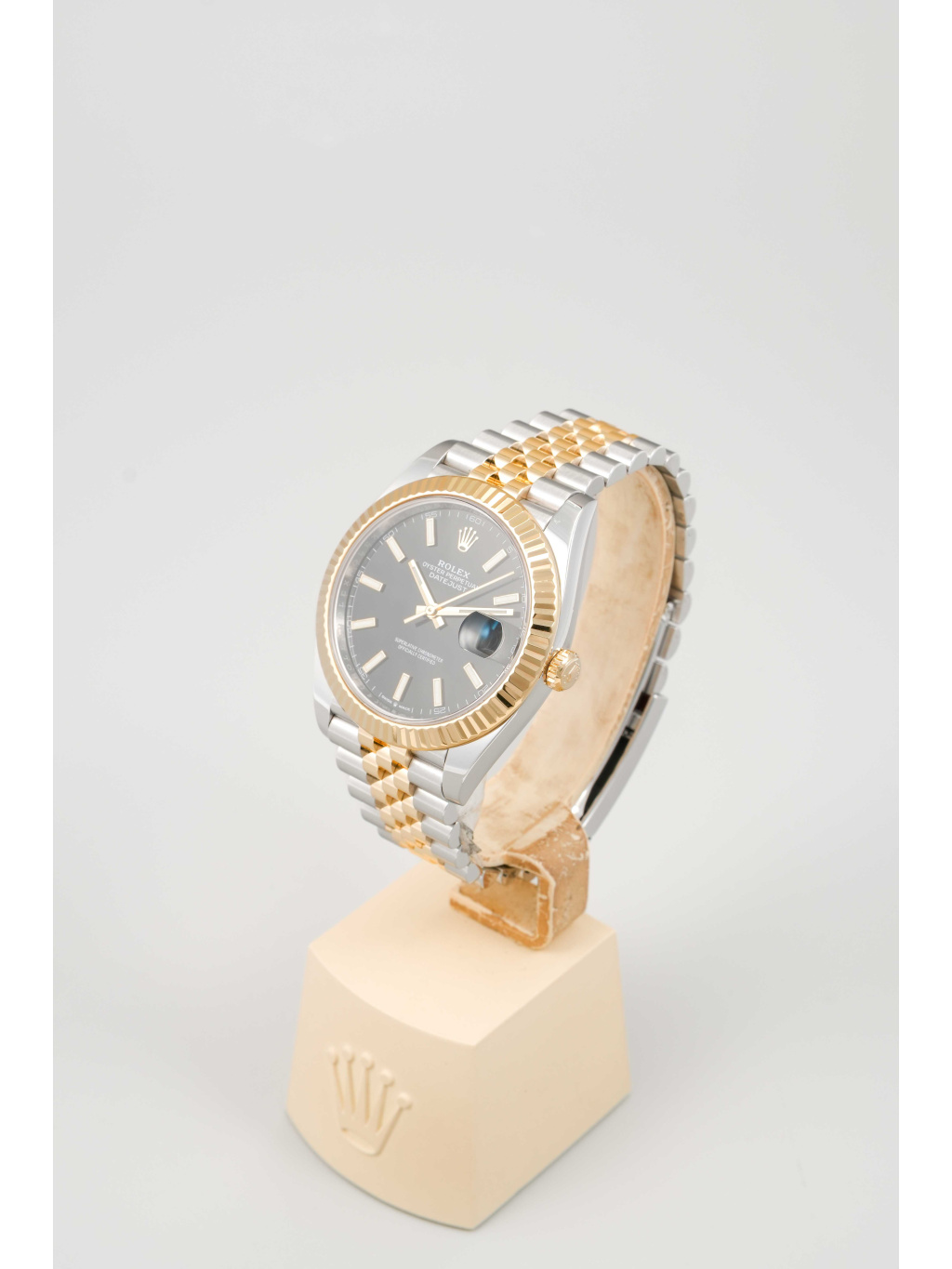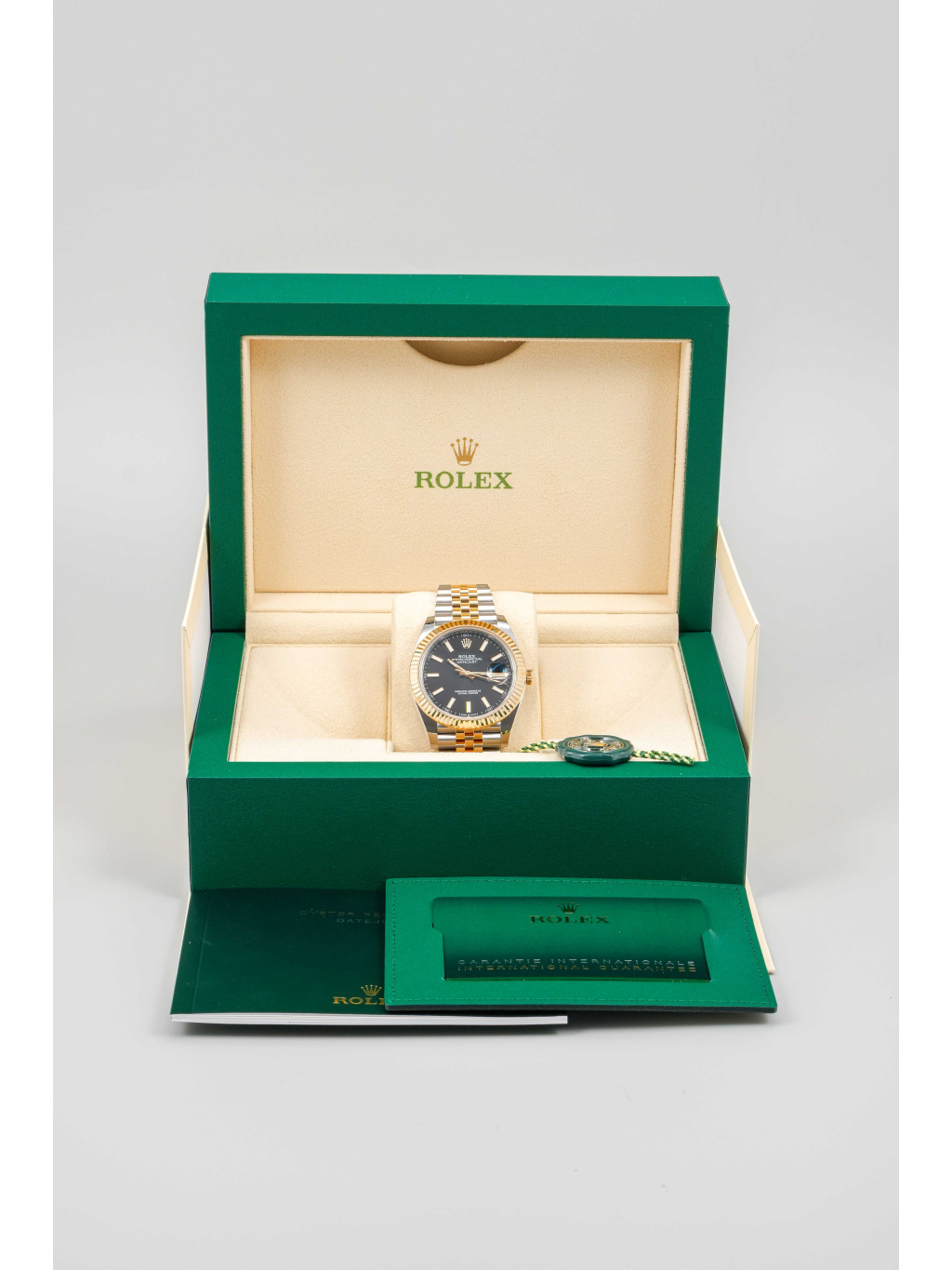 Rolex Datejust 41 v dvoutónovém provedení oceli Oystersteel a 18kt žlutého zlata patří mezi nejklasičtější a zároveň nejvýraznější konfigurace této ikonické kolekce. Varianta s černým číselníkem působí nadčasově, elegantně a velmi univerzálně. Kombinace tmavého ciferníku, zlatých detailů a jubilee náramku vytváří harmonický celek s výrazným luxusním charakterem.