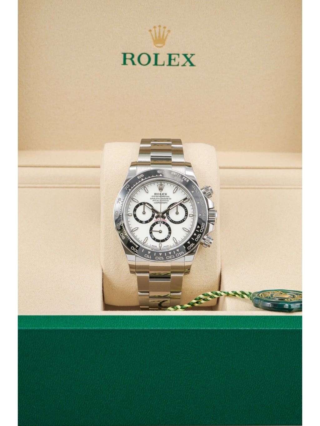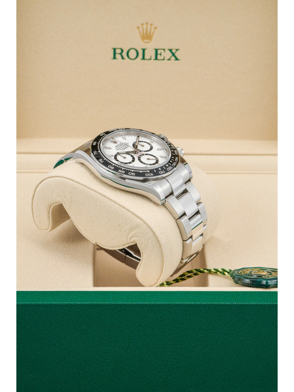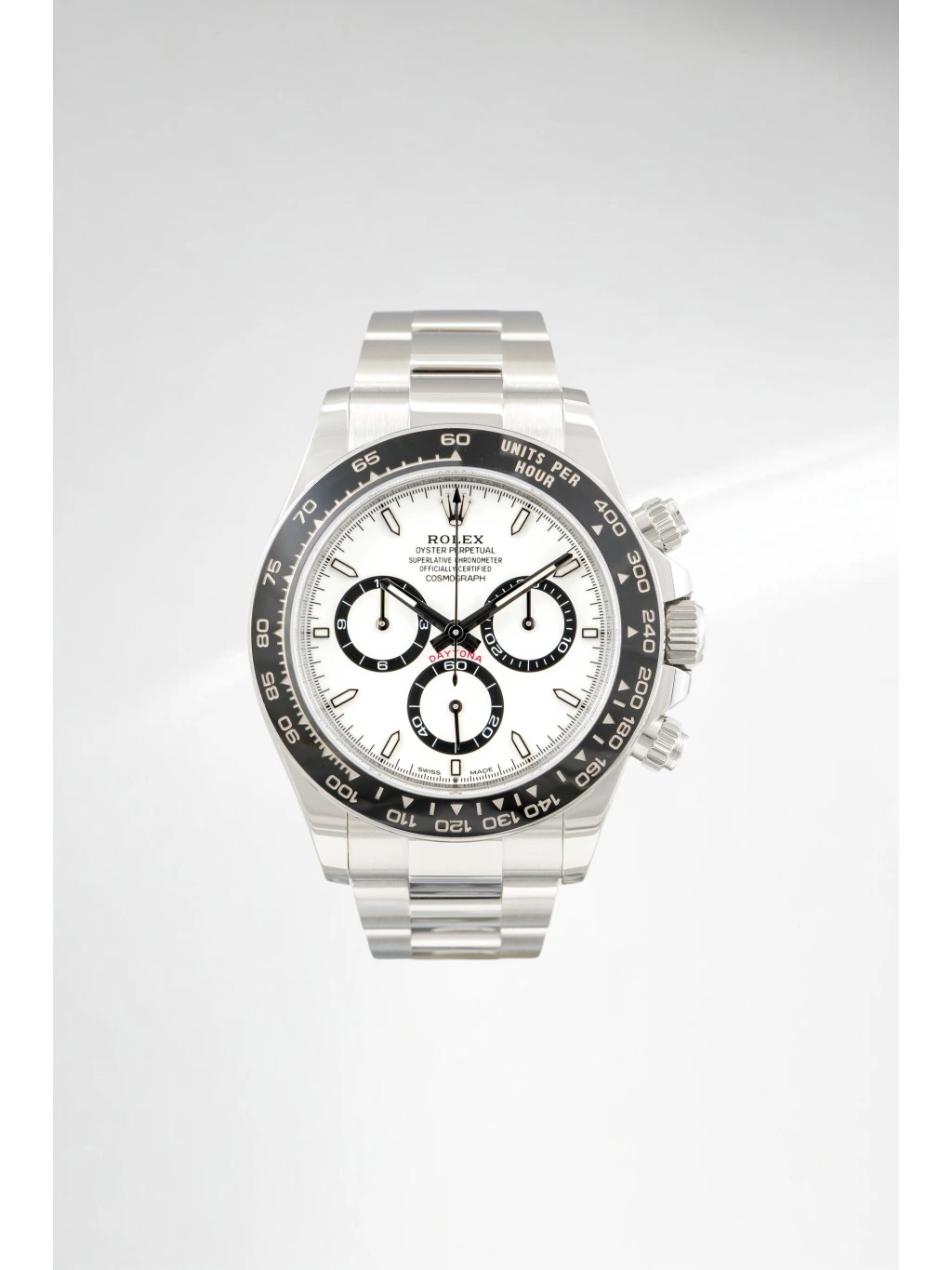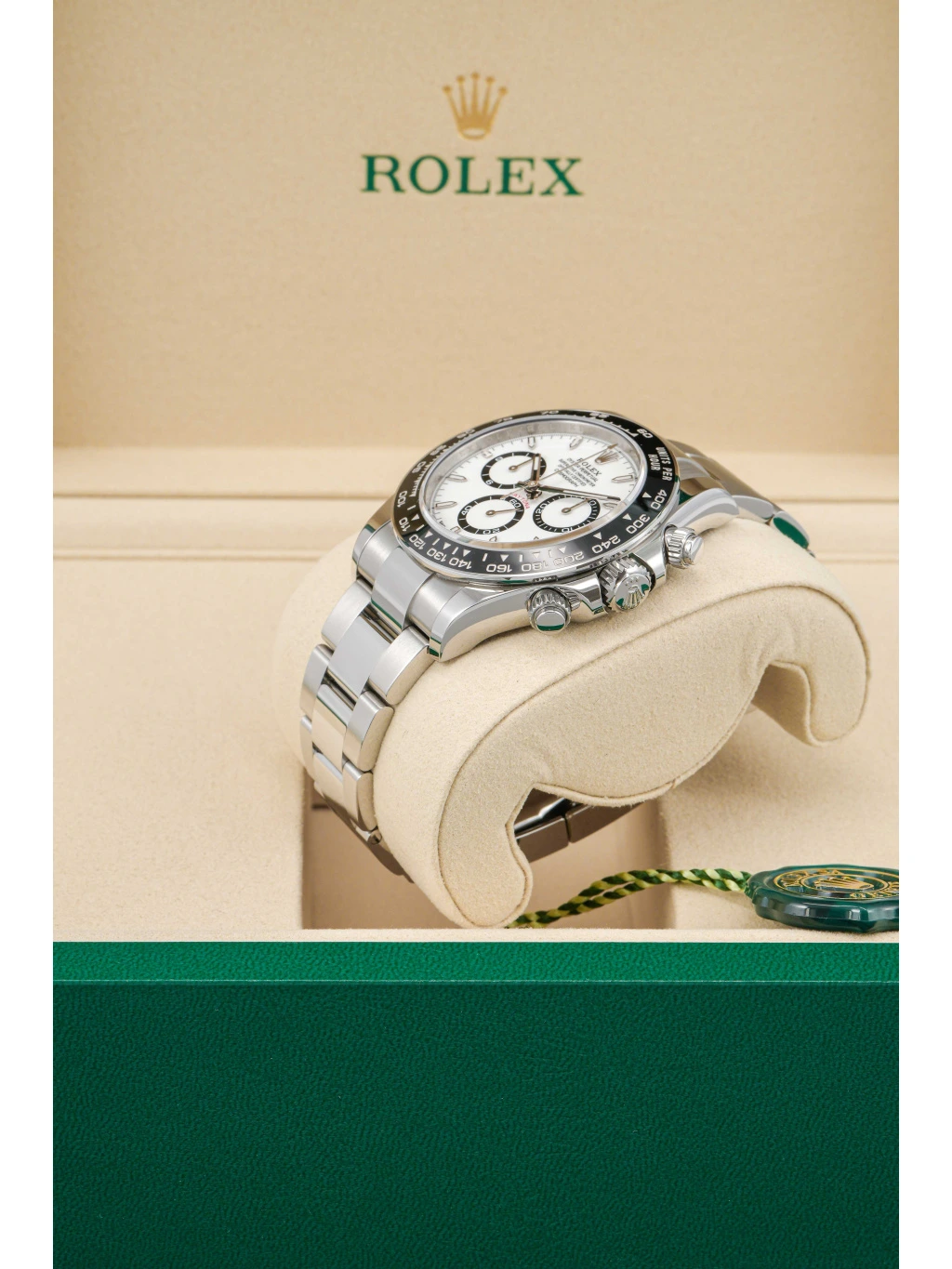 Rolex Cosmograph Daytona v aktuální generaci patří mezi nejžádanější chronografy na světě a varianta „Panda“ s bílým číselníkem je jednou z nejikoničtějších konfigurací vůbec. Moderní provedení přináší jemně upravené detaily, které posouvají design směrem k větší čistotě a eleganci, aniž by ztratil svůj sportovní charakter.