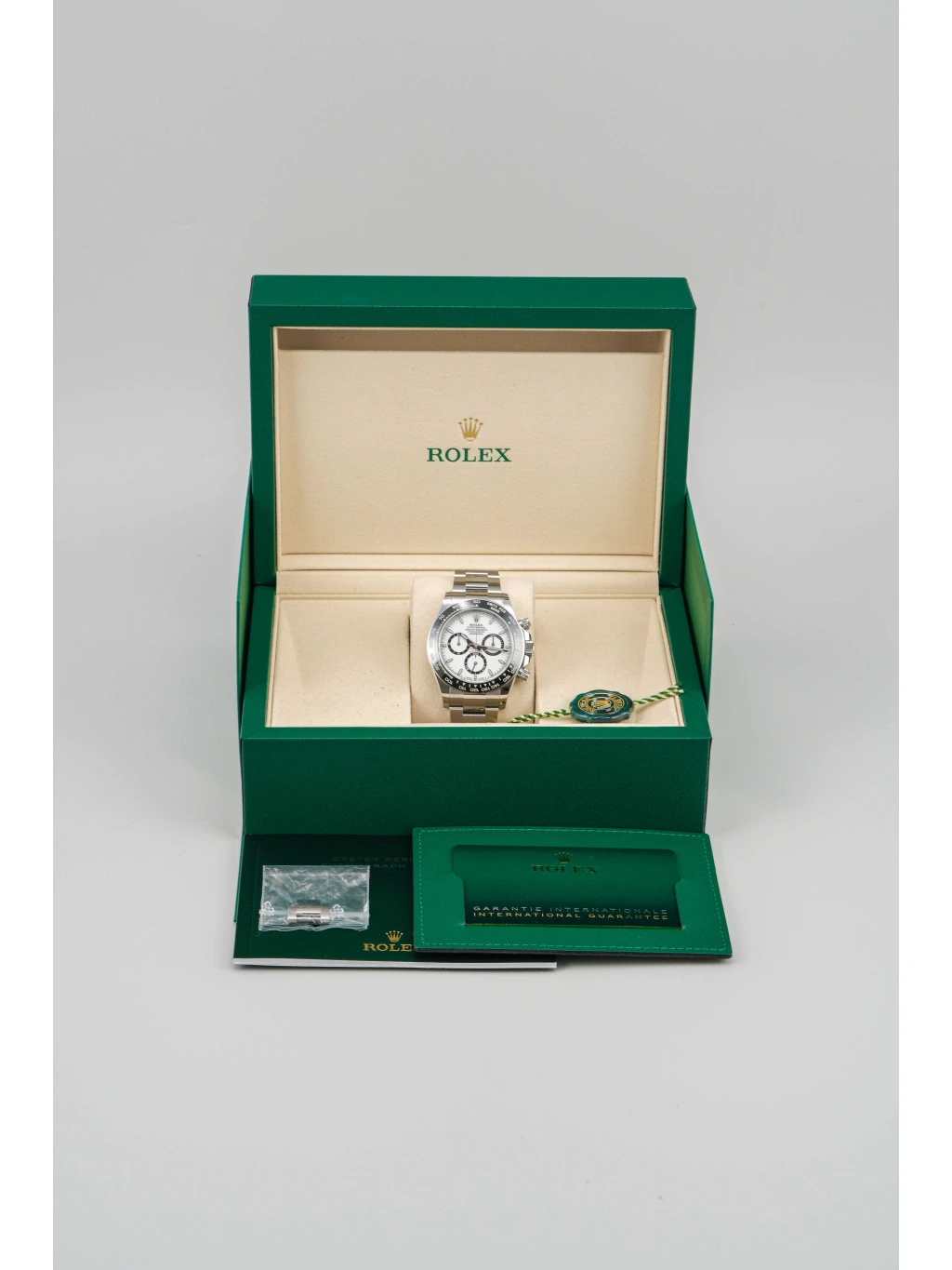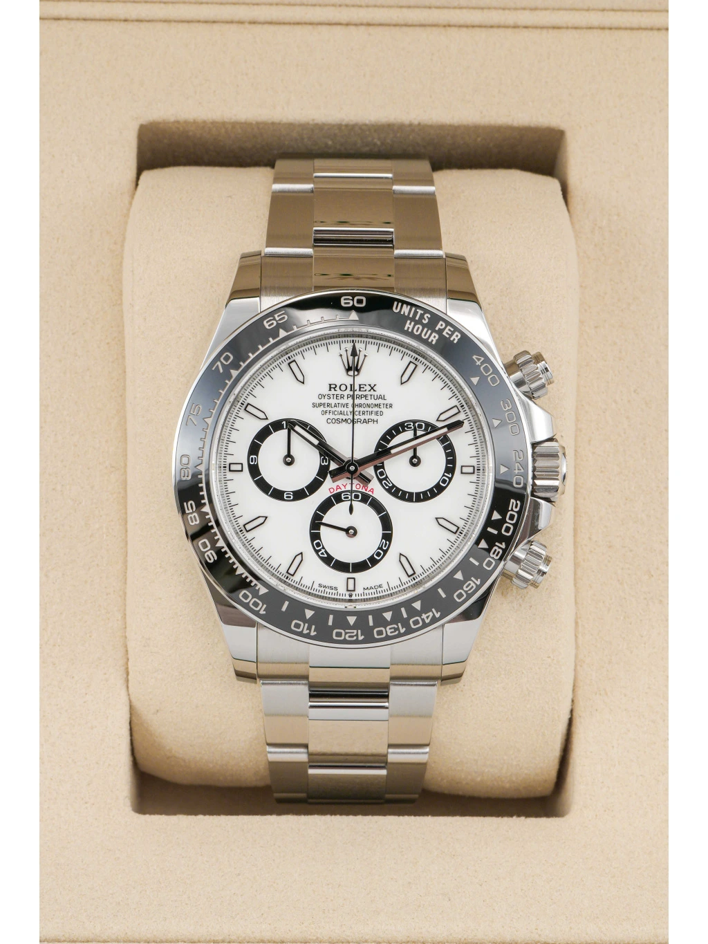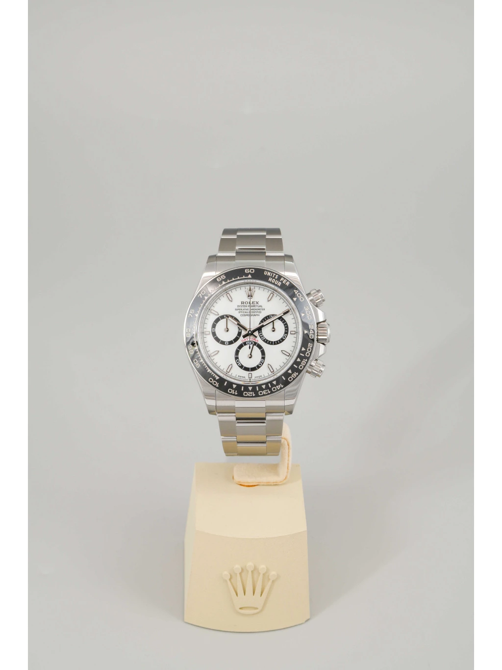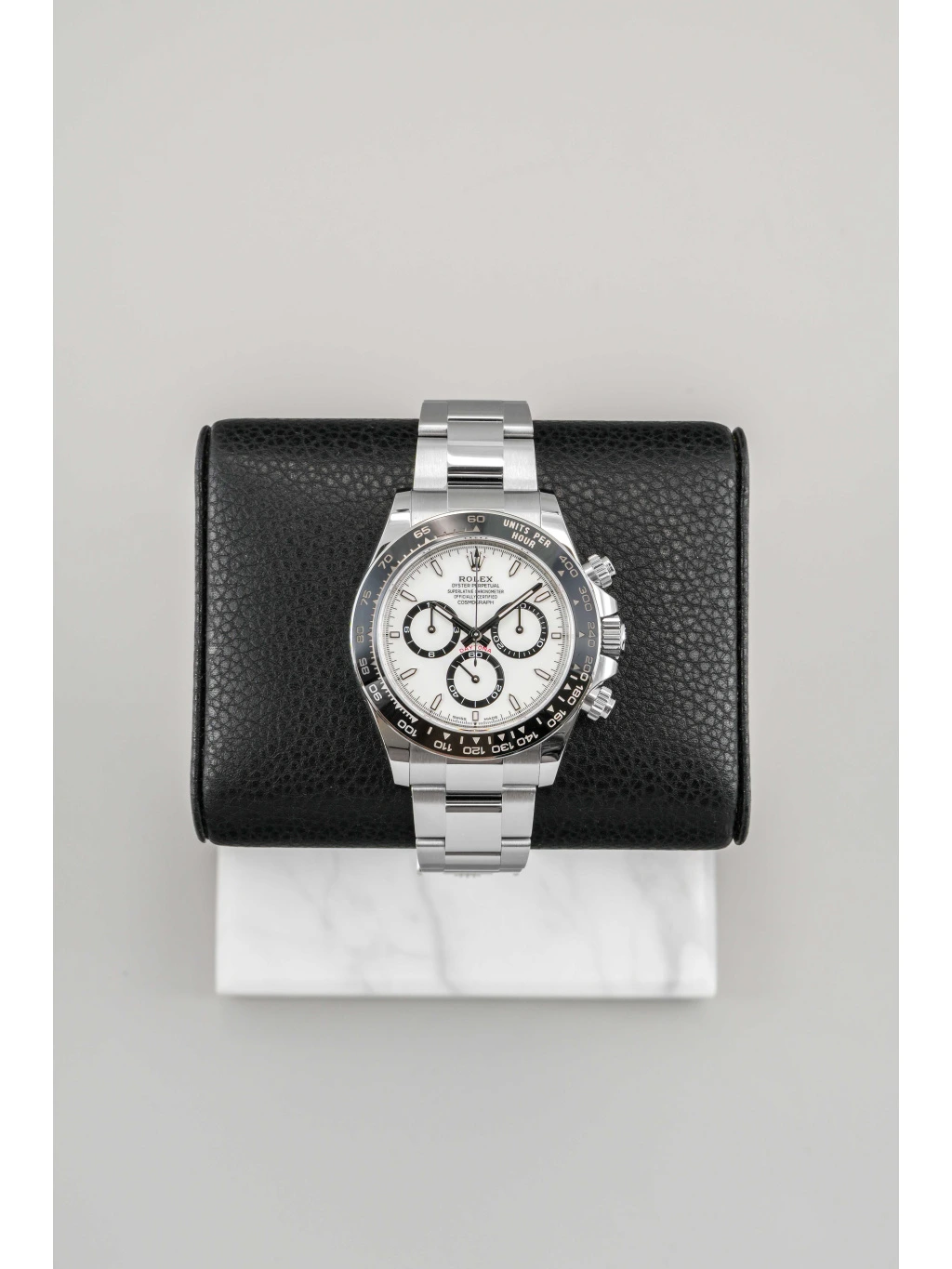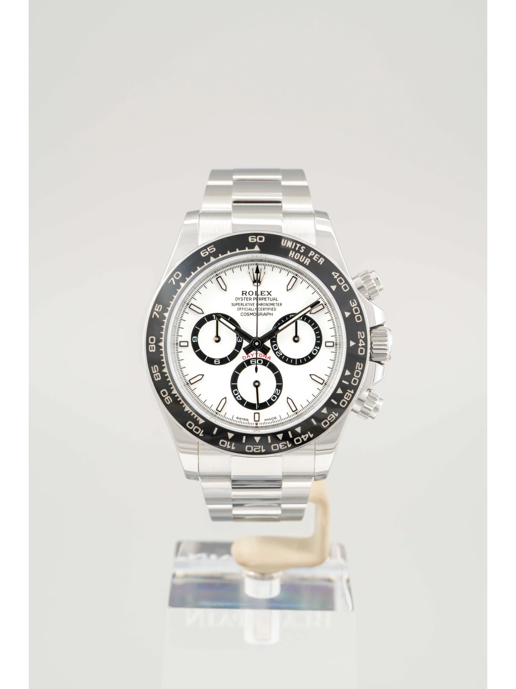 Rolex Cosmograph Daytona v aktuální generaci patří mezi nejžádanější chronografy na světě a varianta „Panda“ s bílým číselníkem je jednou z nejikoničtějších konfigurací vůbec. Moderní provedení přináší jemně upravené detaily, které posouvají design směrem k větší čistotě a eleganci, aniž by ztratil svůj sportovní charakter.