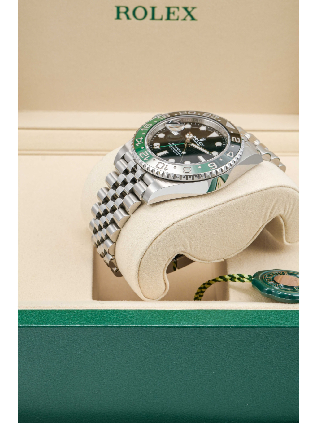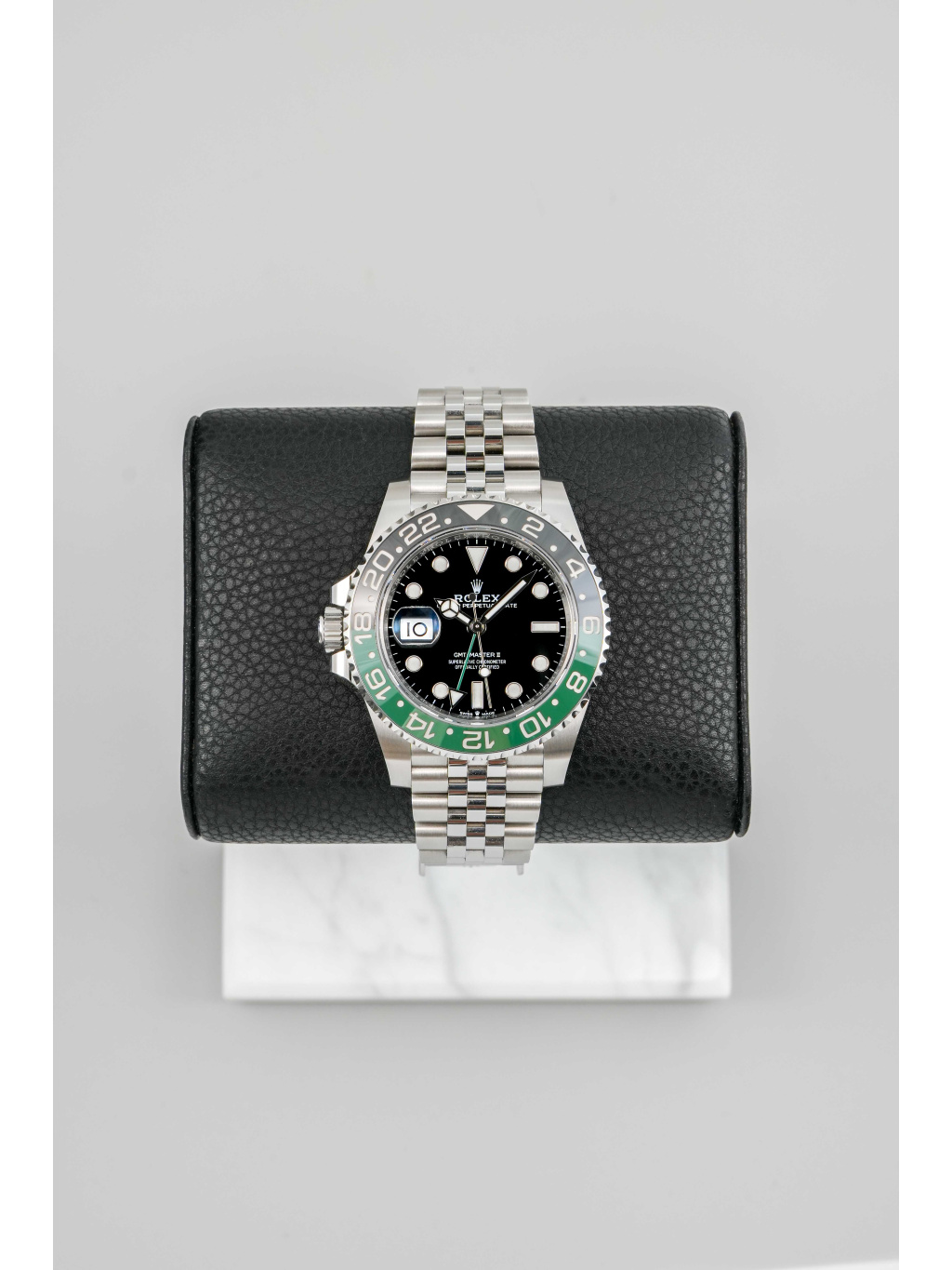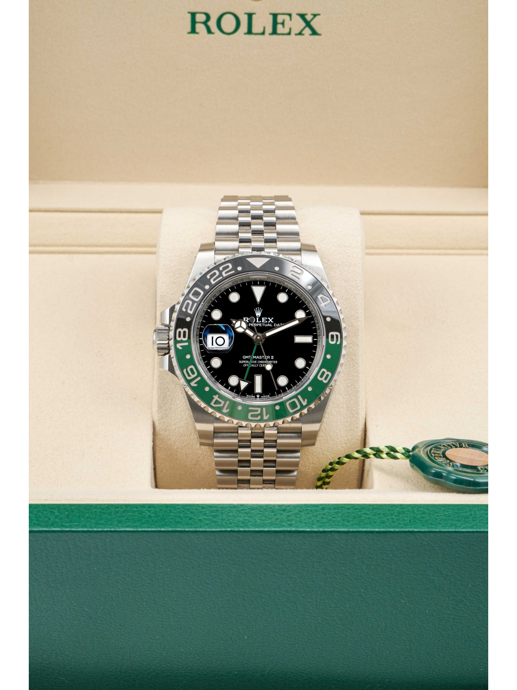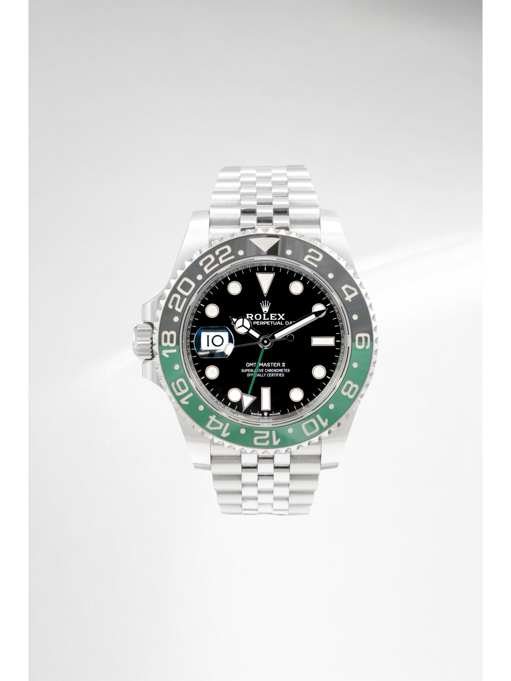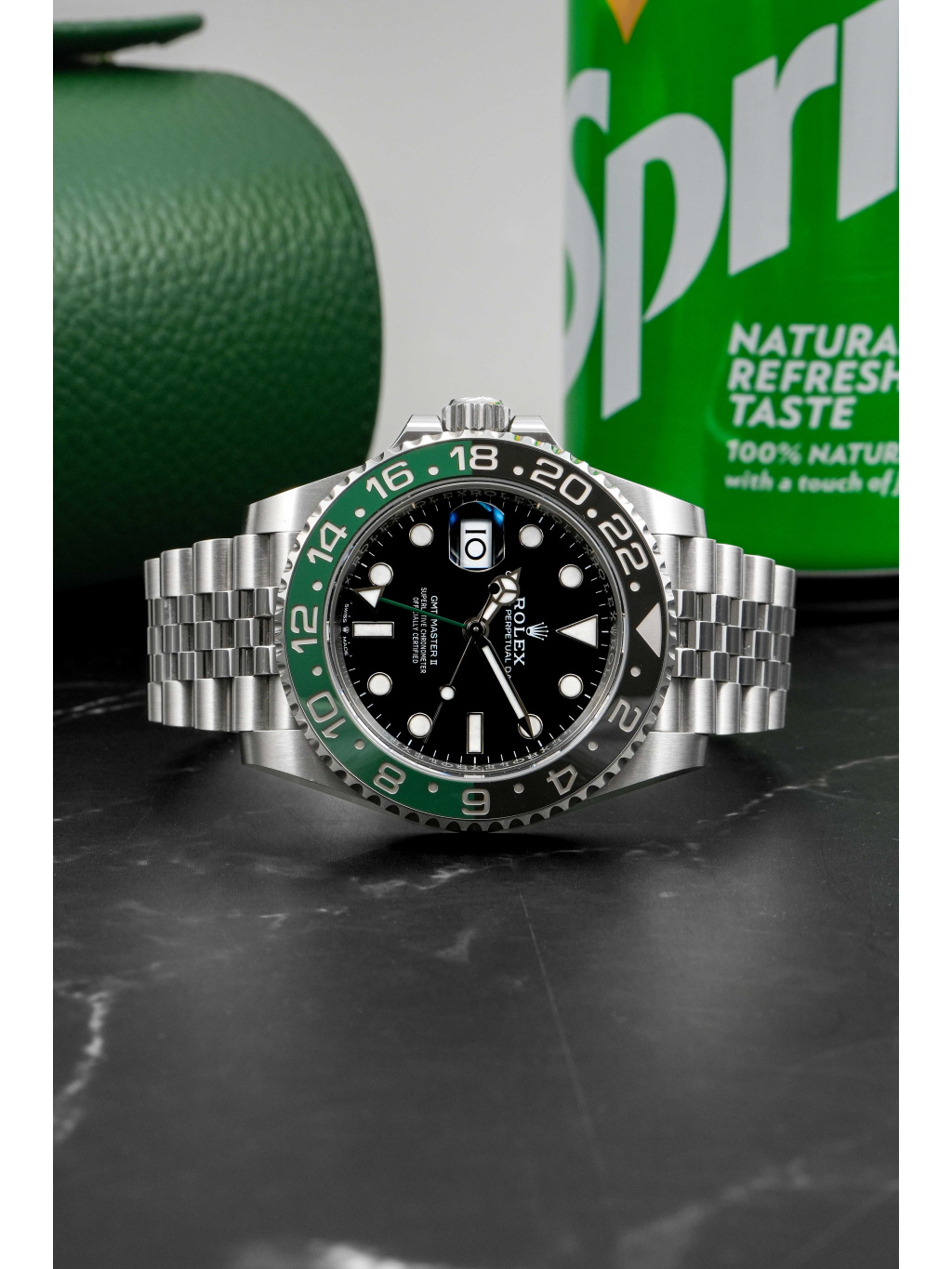 Model přezdívaný „Sprite“ – Rolex GMT-Master II – je jedním z nejdiskutovanějších přírůstků do řady GMT. Jako první GMT-Master v historii přináší levostranně umístěnou korunku, čímž zaujme nejen leváky, ale i sběratele, kteří hledají výjimečnost. K tomu se přidává výrazná dvoubarevná luneta Cerachrom v kombinaci černé a zelené, která podtrhuje jedinečný charakter tohoto modelu.