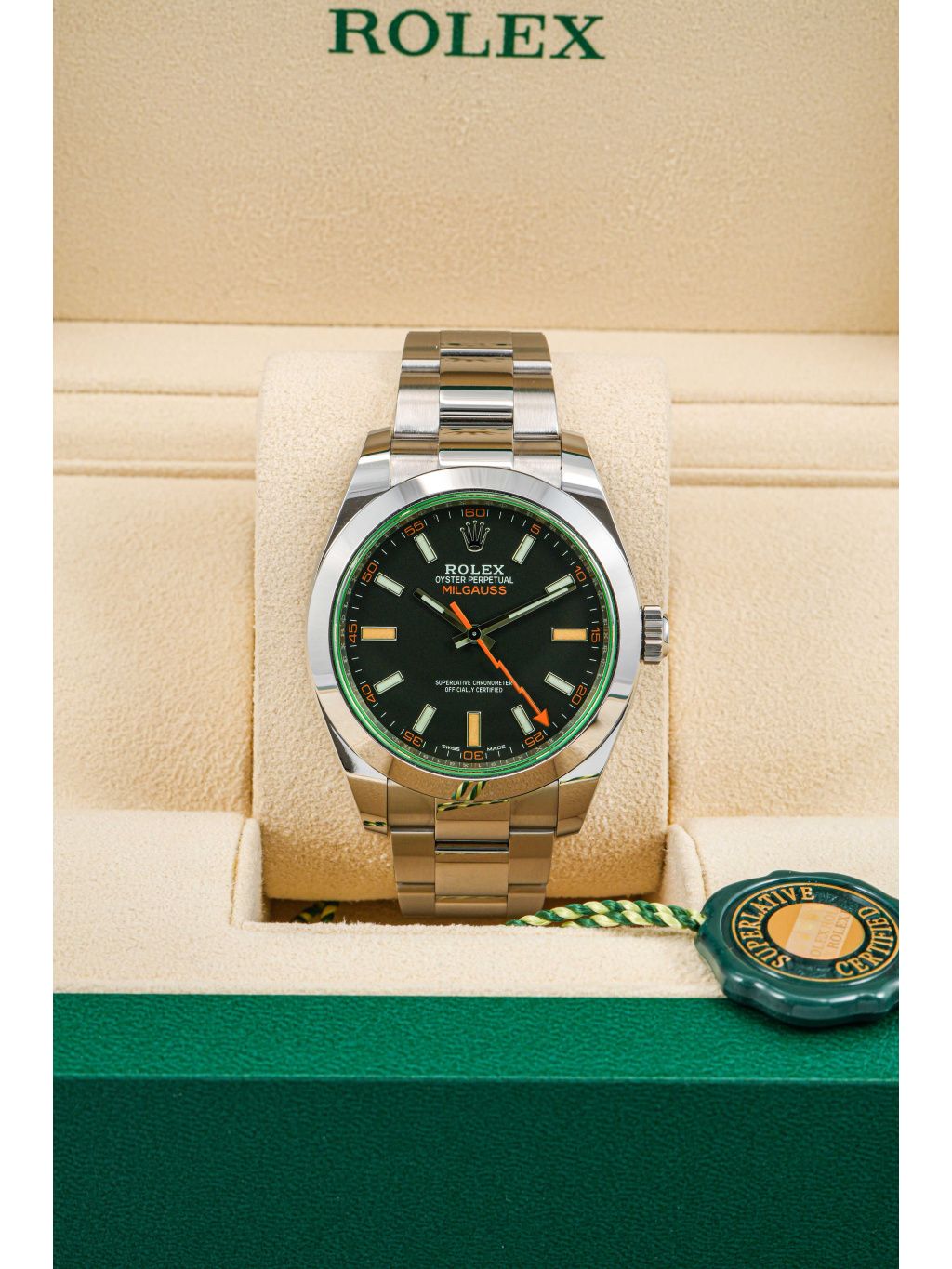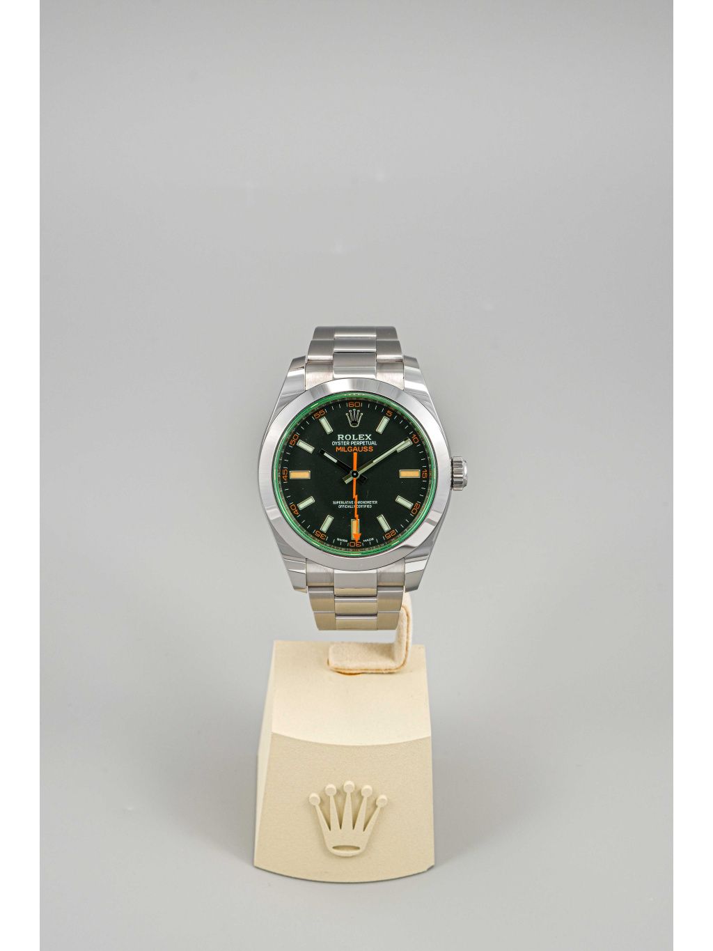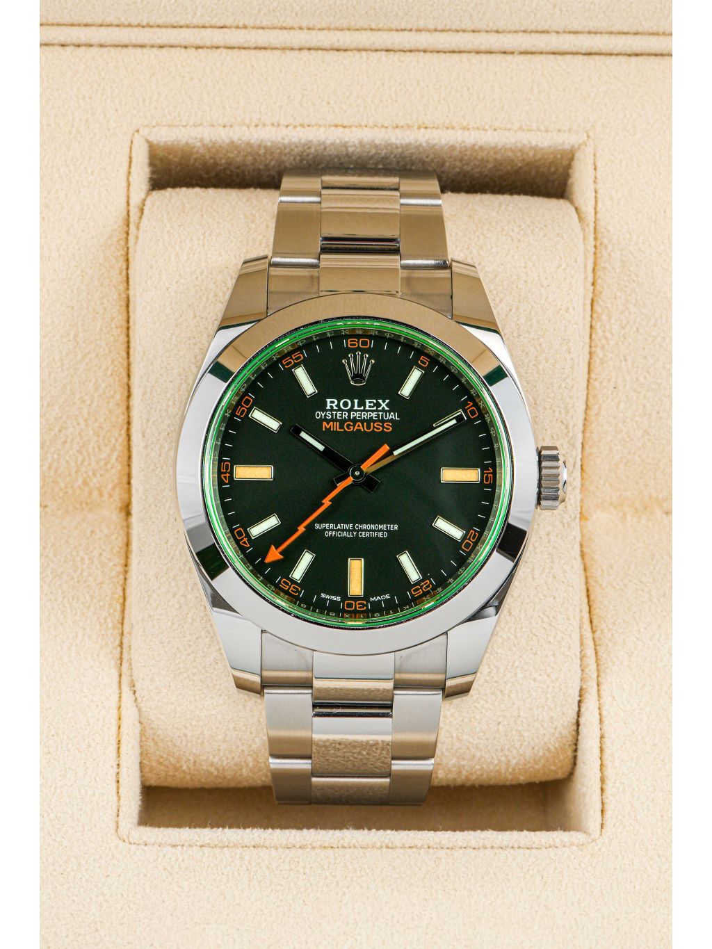 Pouzdro z oceli Oystersteel má velikost 40 mm a doplňuje jej hladká luneta, která podtrhuje čistý a technický vzhled hodinek. Černý číselník je doplněn výraznými luminiscenčními indexy a typickou oranžovou sekundovou ručkou ve tvaru blesku, která je jedním z poznávacích znaků modelu Milgauss. Charakteristickým prvkem této reference je také lehce nazelenalé safírové sklíčko. Hodinky jsou osazeny ocelovým náramkem Oyster, který zajišťuje komfort i odolnost při každodenním nošení. Vodotěsnost 100 metrů odpovídá standardu Oyster pouzdra.