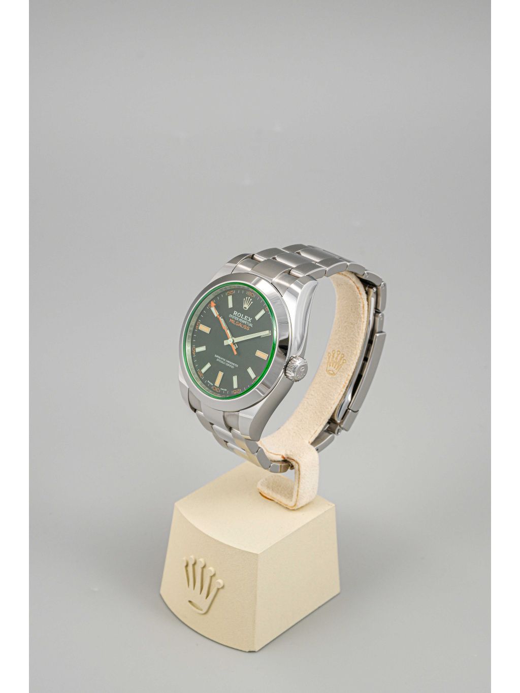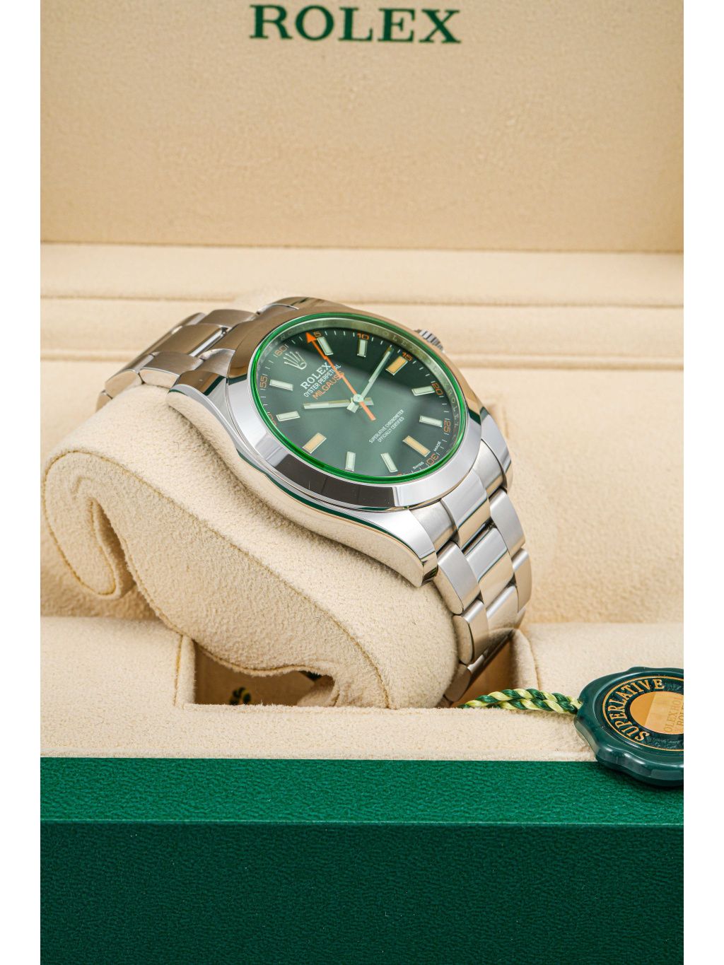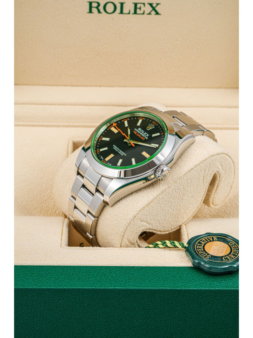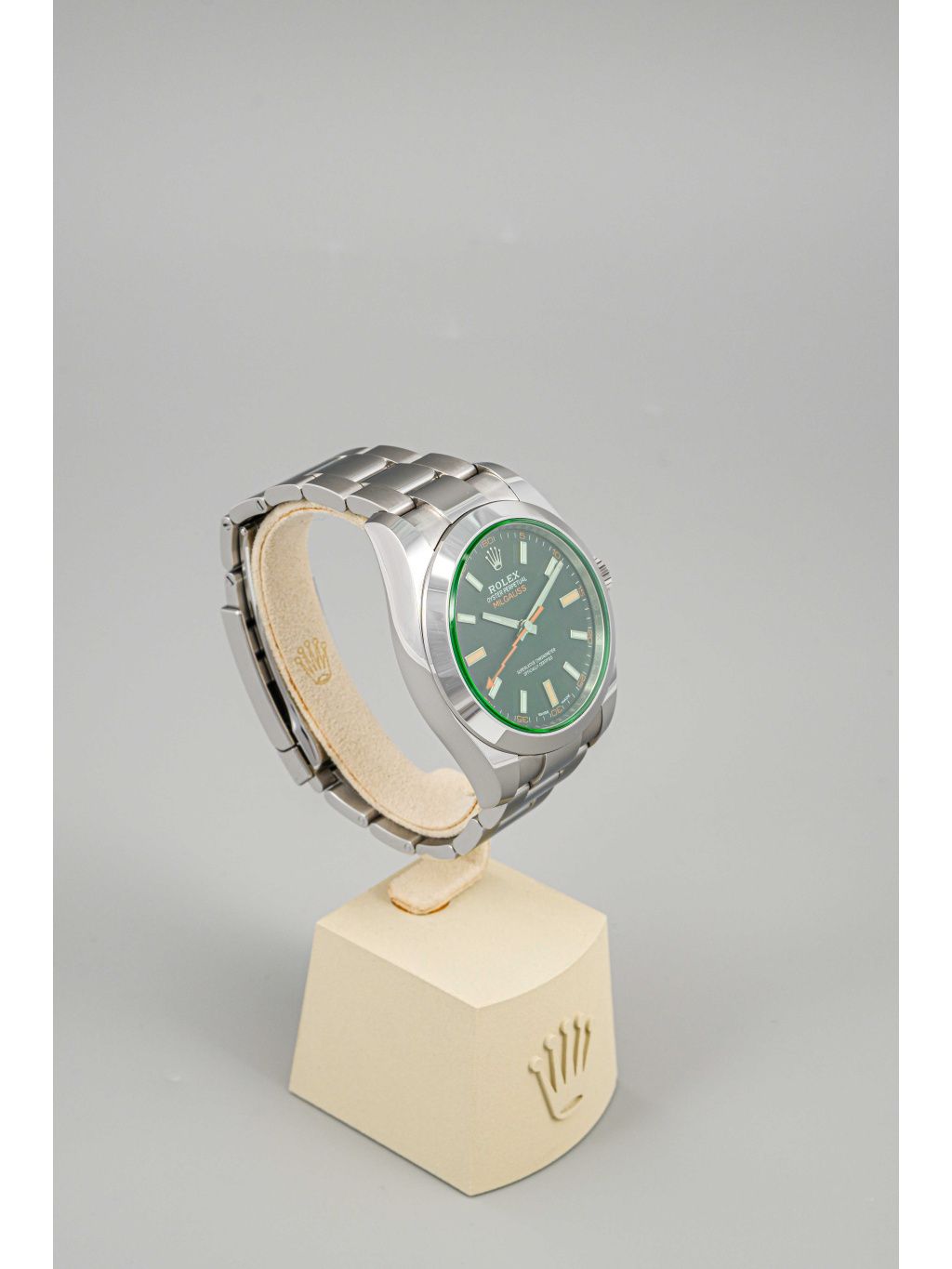Pouzdro z oceli Oystersteel má velikost 40 mm a doplňuje jej hladká luneta, která podtrhuje čistý a technický vzhled hodinek. Černý číselník je doplněn výraznými luminiscenčními indexy a typickou oranžovou sekundovou ručkou ve tvaru blesku, která je jedním z poznávacích znaků modelu Milgauss. Charakteristickým prvkem této reference je také lehce nazelenalé safírové sklíčko. Hodinky jsou osazeny ocelovým náramkem Oyster, který zajišťuje komfort i odolnost při každodenním nošení. Vodotěsnost 100 metrů odpovídá standardu Oyster pouzdra.
