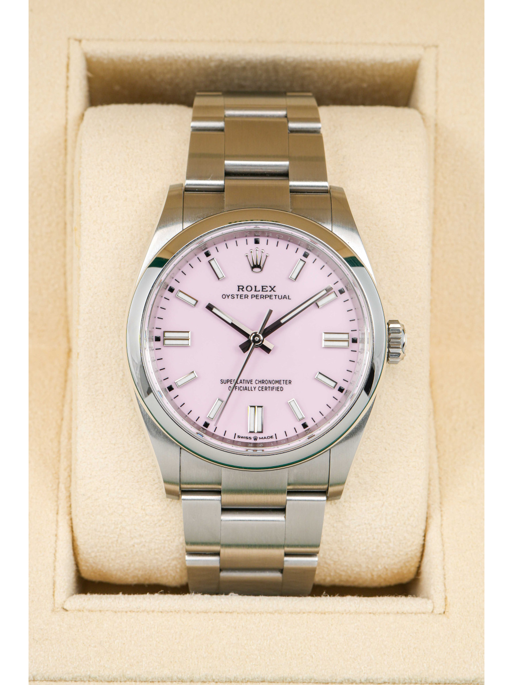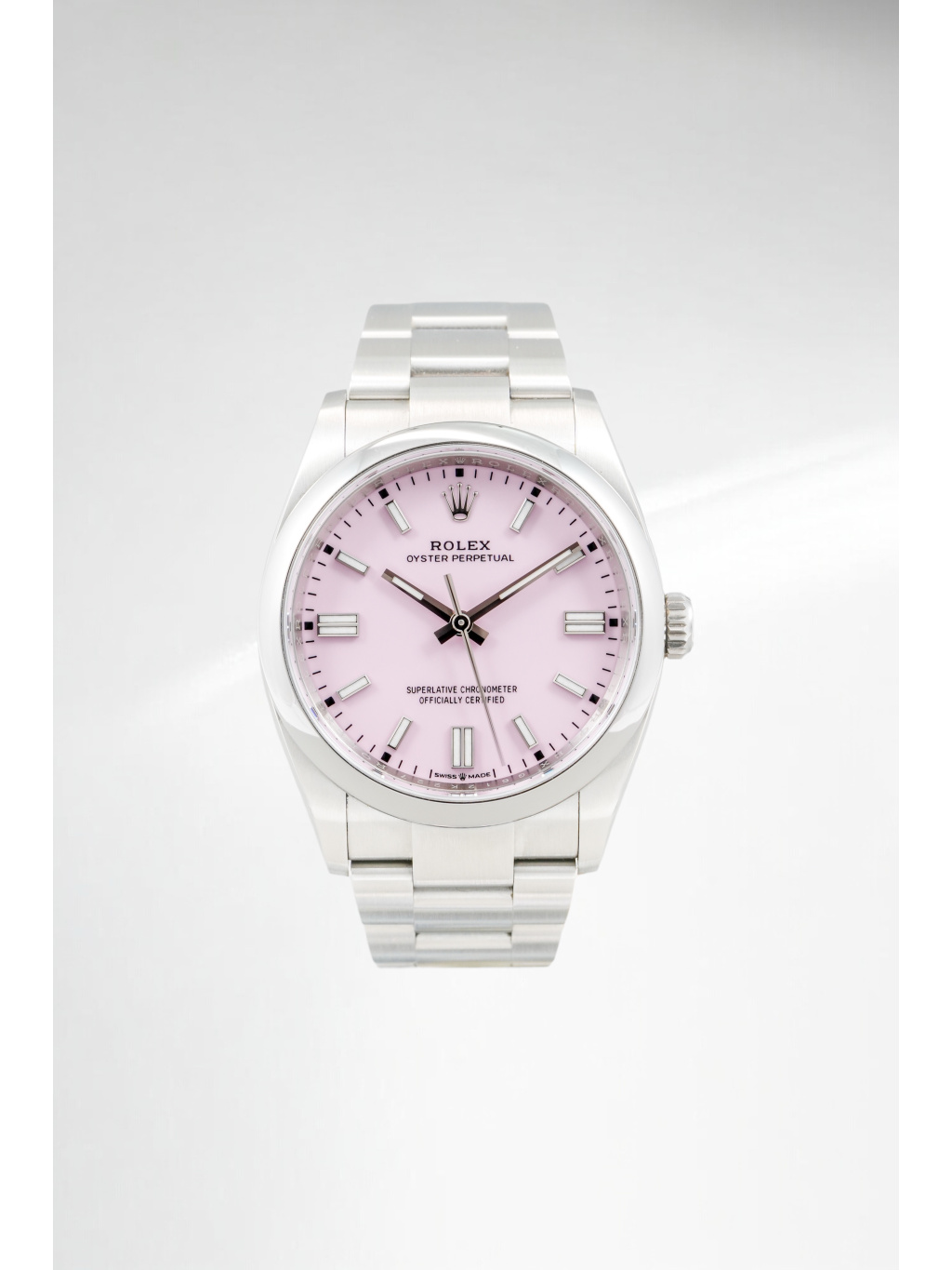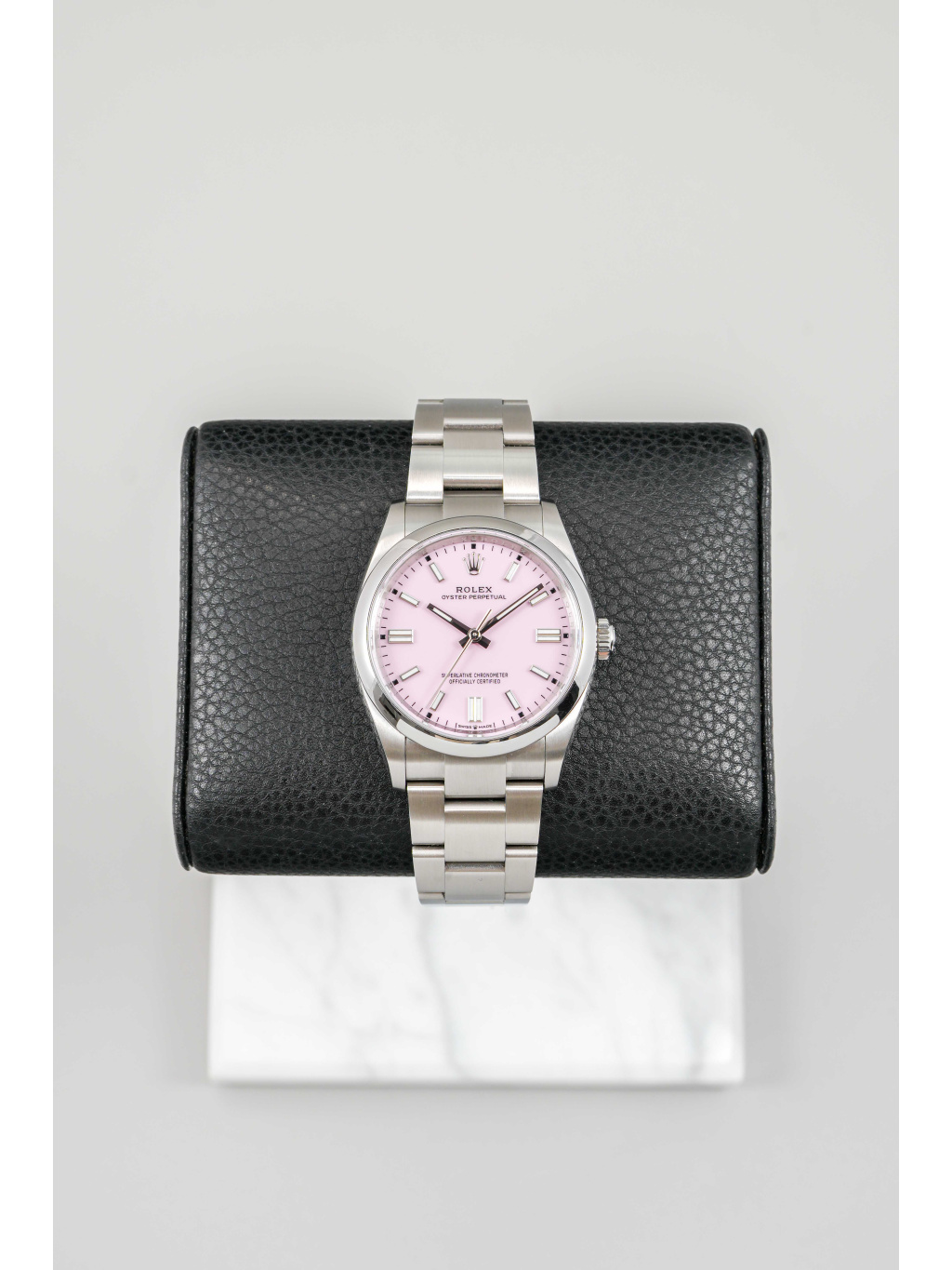 Rolex Oyster Perpetual 36 patří mezi nejčistší a nejautentičtější modely značky Rolex. Varianta s candy pink číselníkem přináší hravý, moderní akcent, který výrazně oživuje jinak minimalistický design. Jemný růžový odstín působí svěže a sebevědomě, přičemž si zachovává nadčasový charakter typický pro řadu Oyster Perpetual.