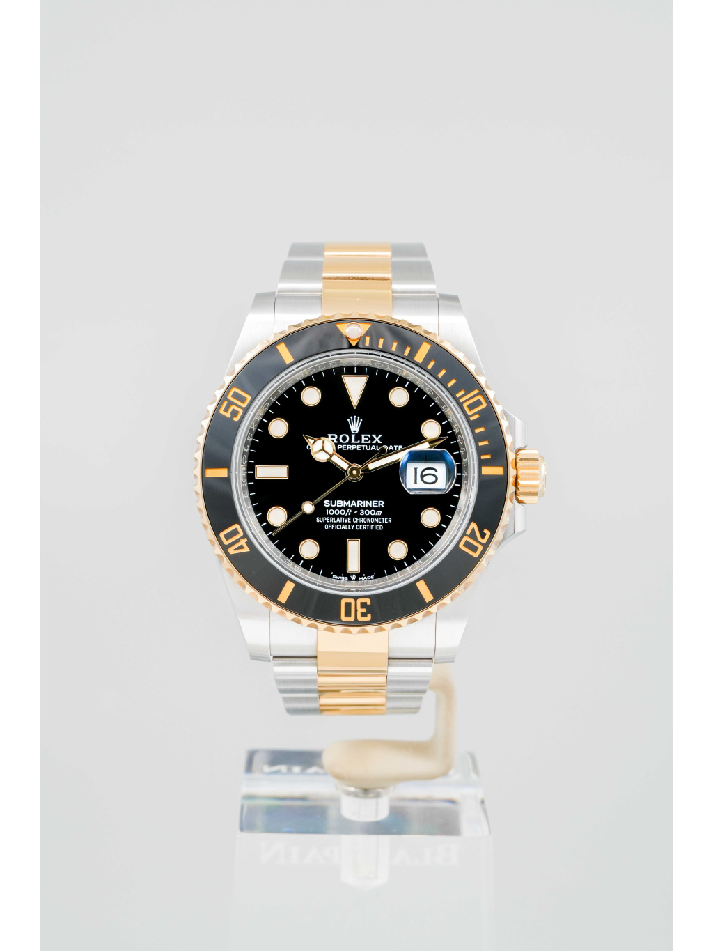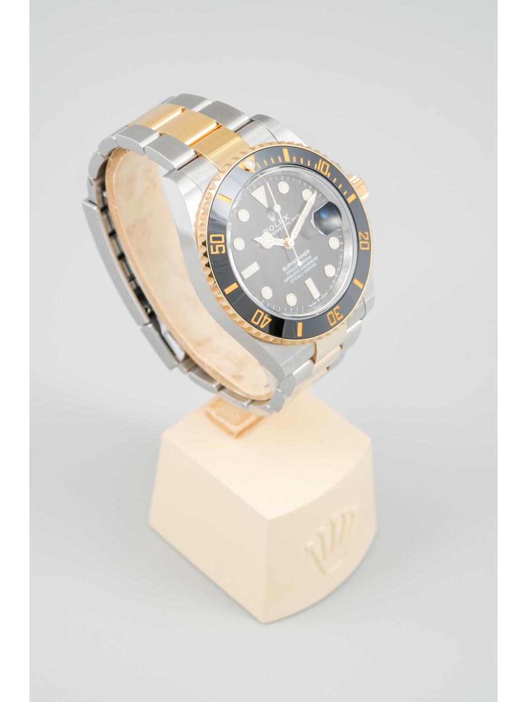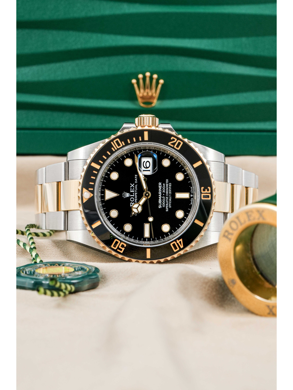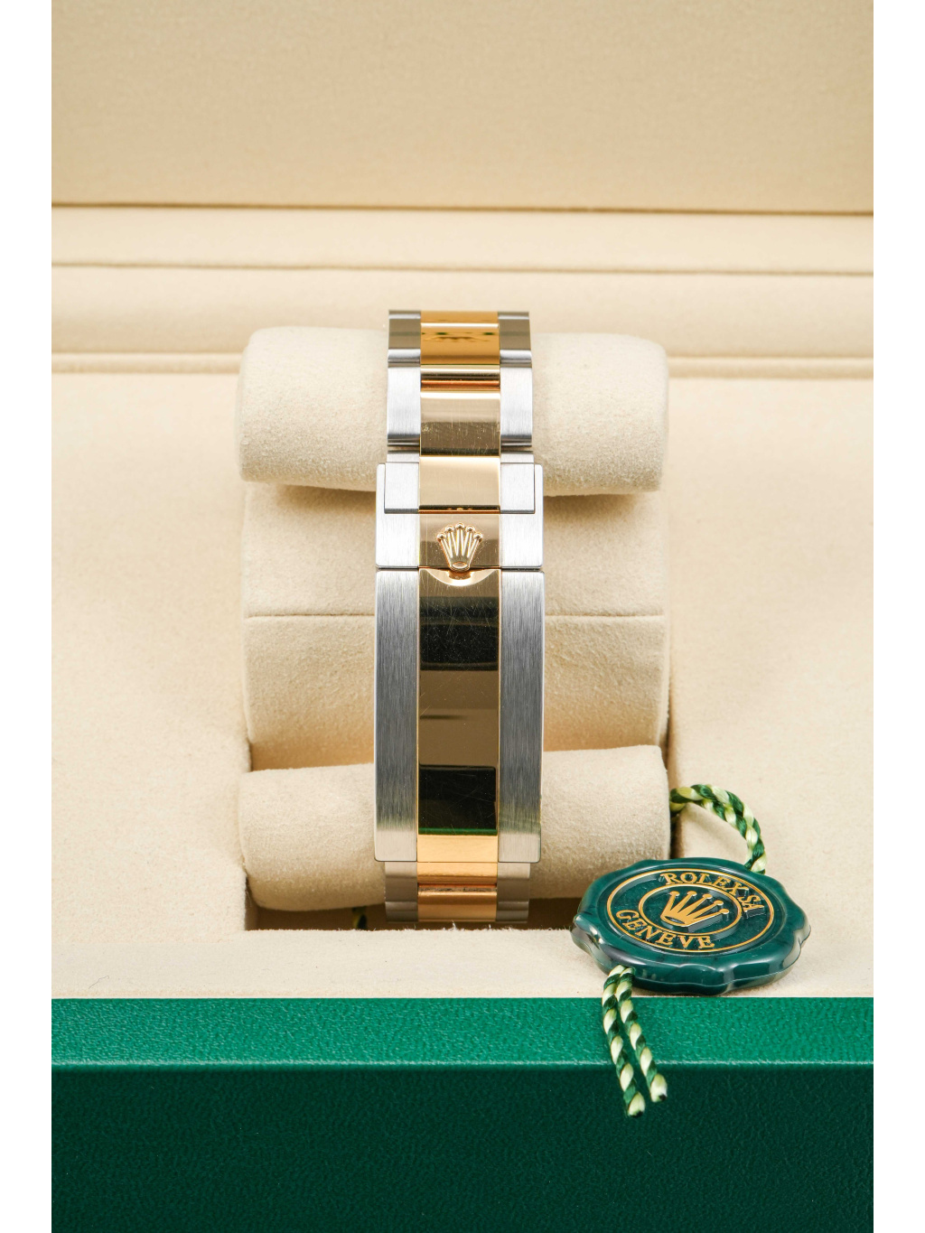 Hodinky jsou osazeny Oyster náramkem s kombinací ocelových a zlatých článků, doplněným o sponu Oysterlock a systém Glidelock, který umožňuje jemné prodloužení bez použití nástrojů – ideální i přes potápěčský oblek.