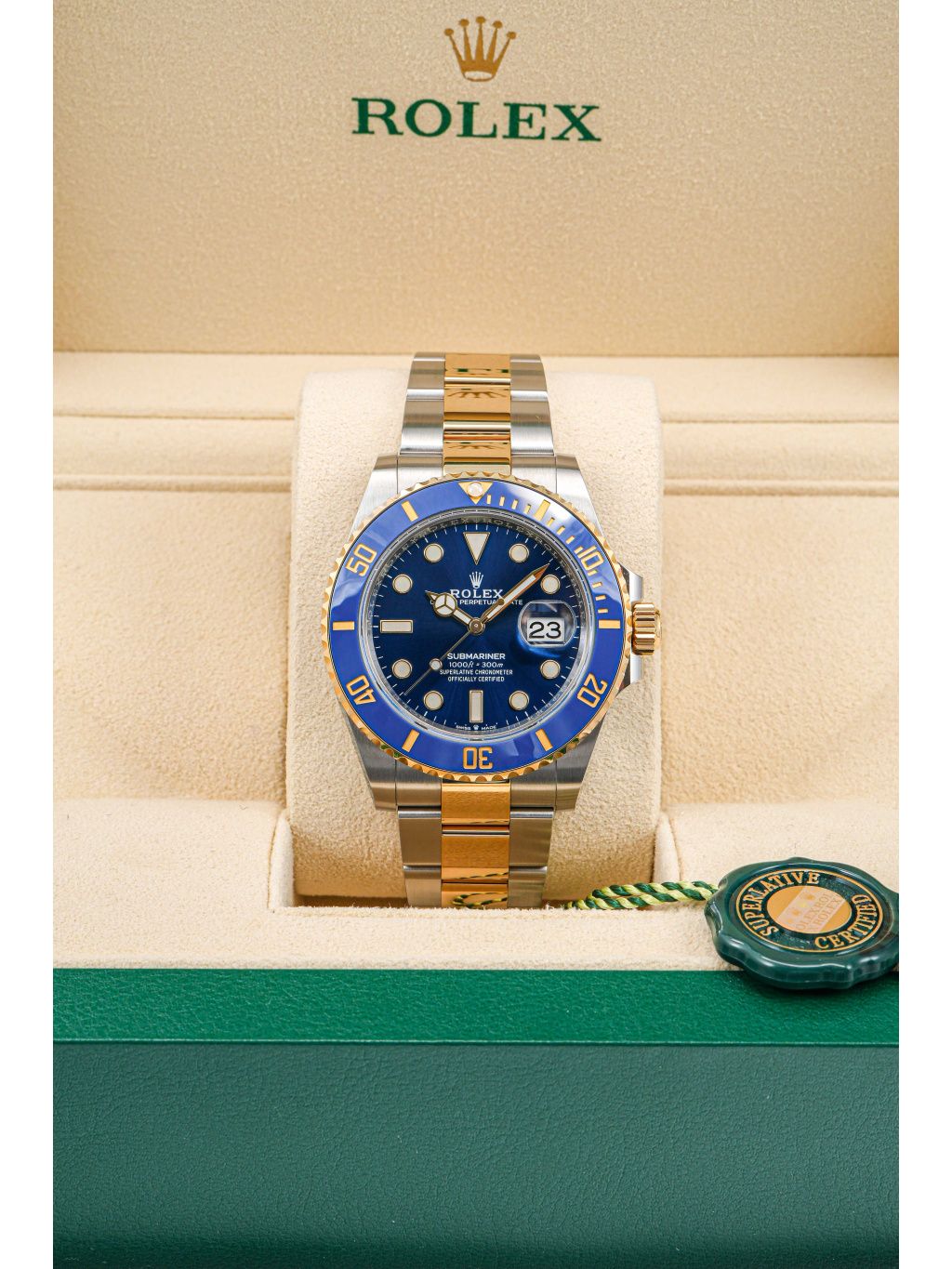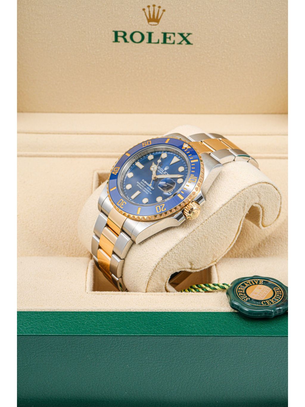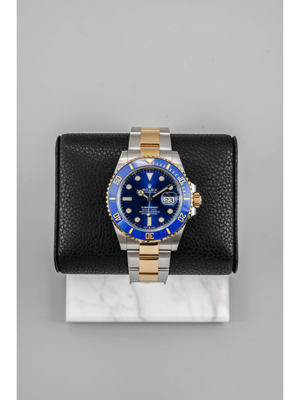 Rolex Submariner Date přezdívaný „Bluesy“ patří mezi nejikoničtější a vizuálně nejvýraznější varianty této legendární potápěčské kolekce. Kombinace modrého číselníku a modré keramické lunety s prvky 18kt žlutého zlata vytváří luxusní interpretaci klasického Submarineru, která si zachovává svůj plně profesionální charakter.