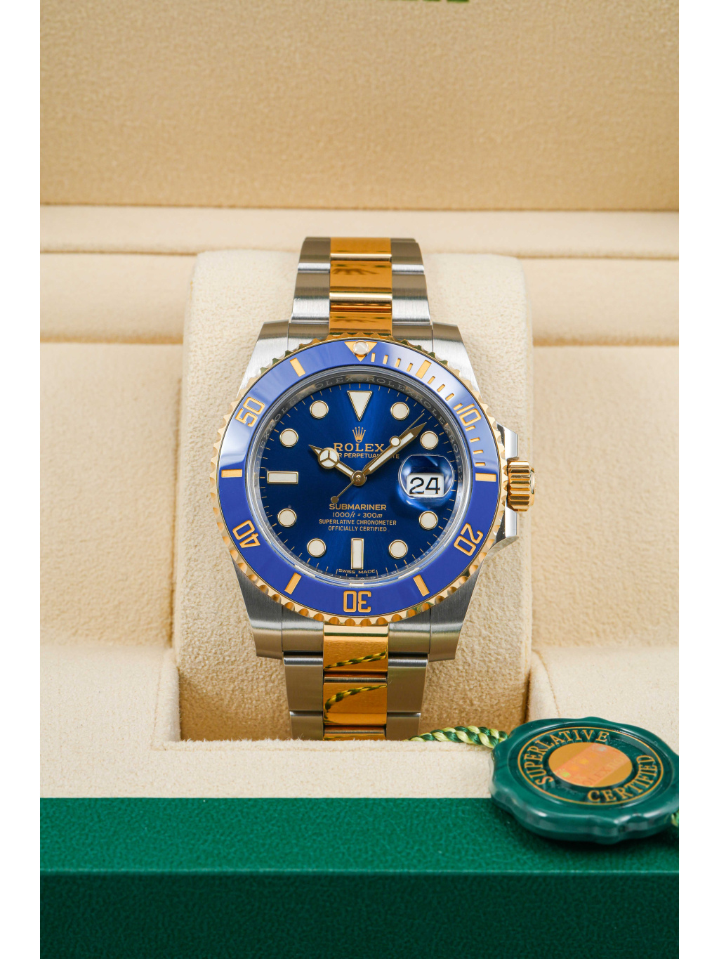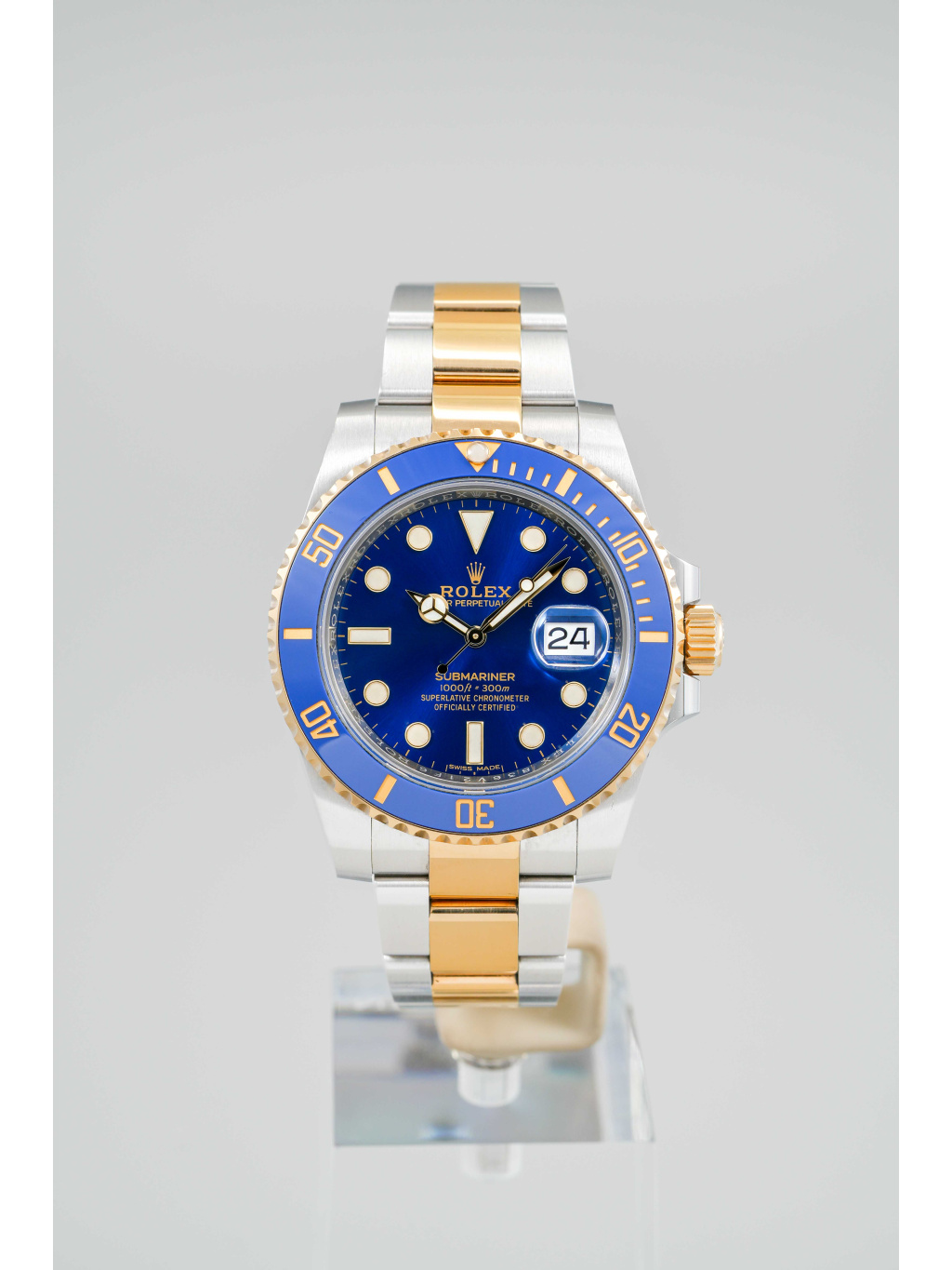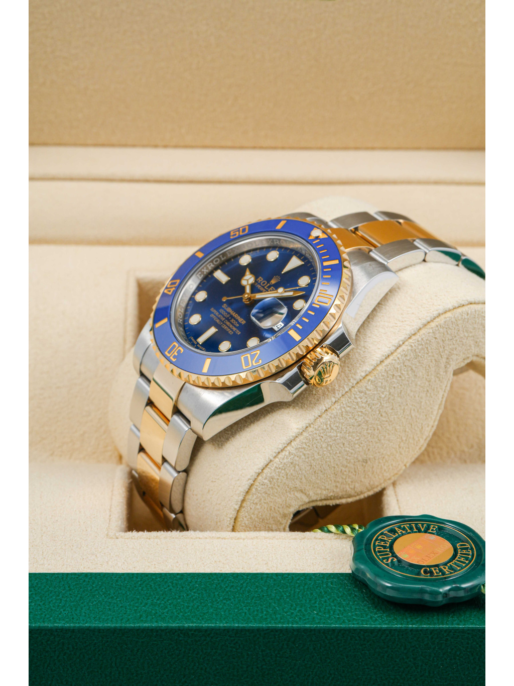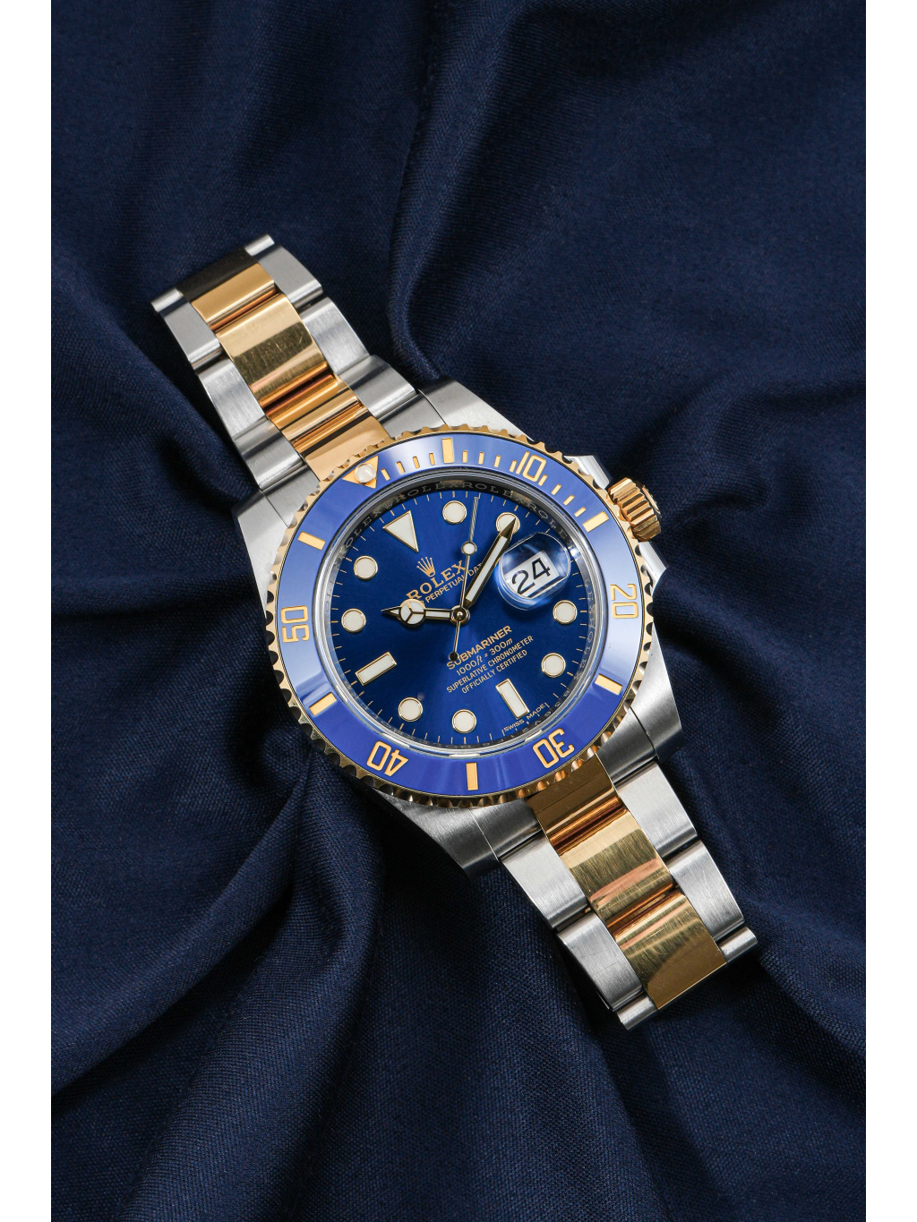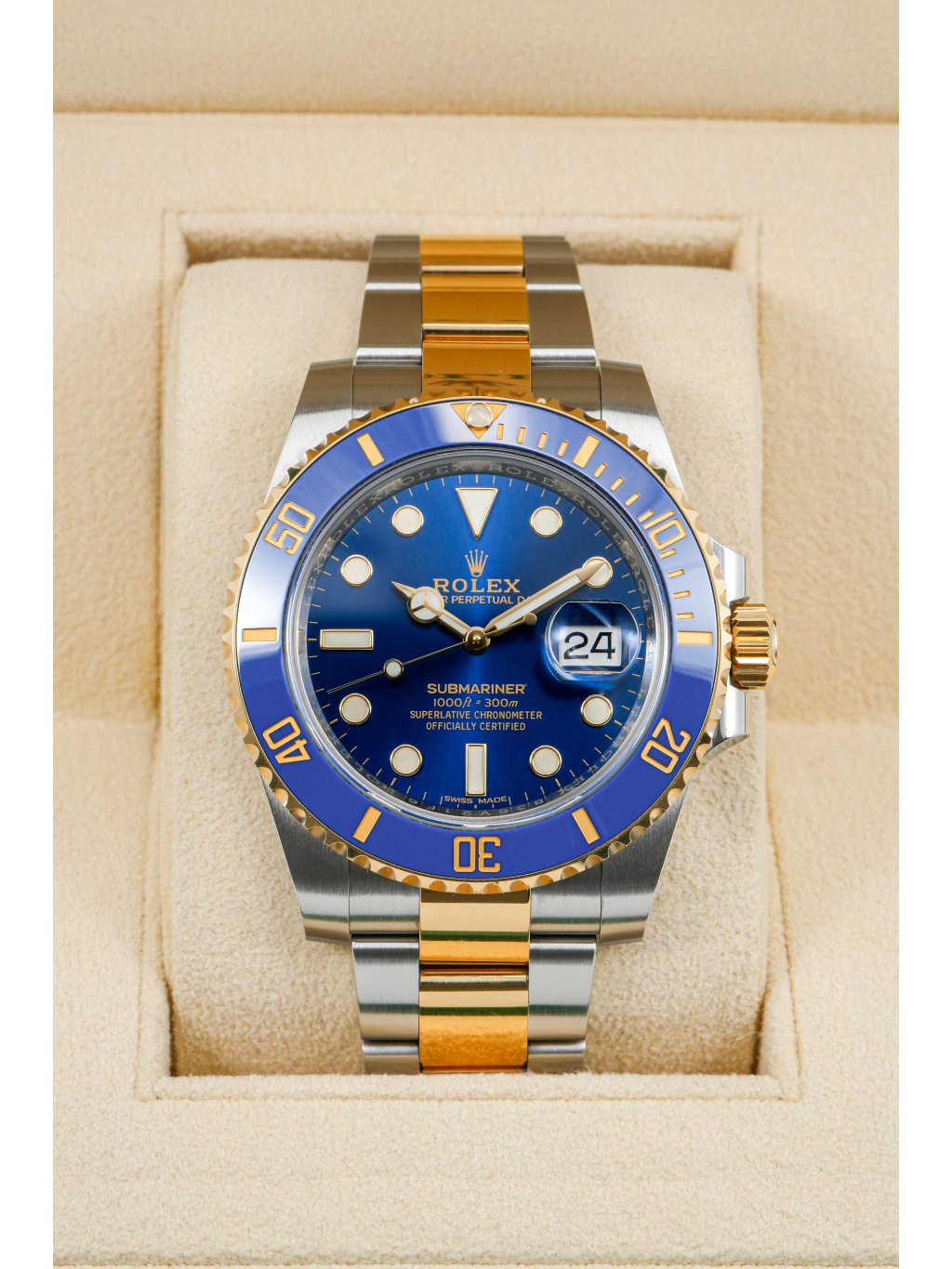 Pouzdro o průměru 40 mm je osazeno jednosměrně otočnou keramickou lunetou Cerachrom v modré barvě se zlatými číslicemi. Modrý sunburst číselník doplňují zlaté ručky a indexy s luminiscenční výplní Chromalight, která zajišťuje perfektní čitelnost i ve tmě. Safírové sklíčko s čočka Cyclops nad datem je typickým znakem modelu Submariner Date. Dvoutónový Oyster náramek kombinuje ocelové a zlaté články a je vybaven sponou Oysterlock se systémem Glidelock pro přesné nastavení délky.