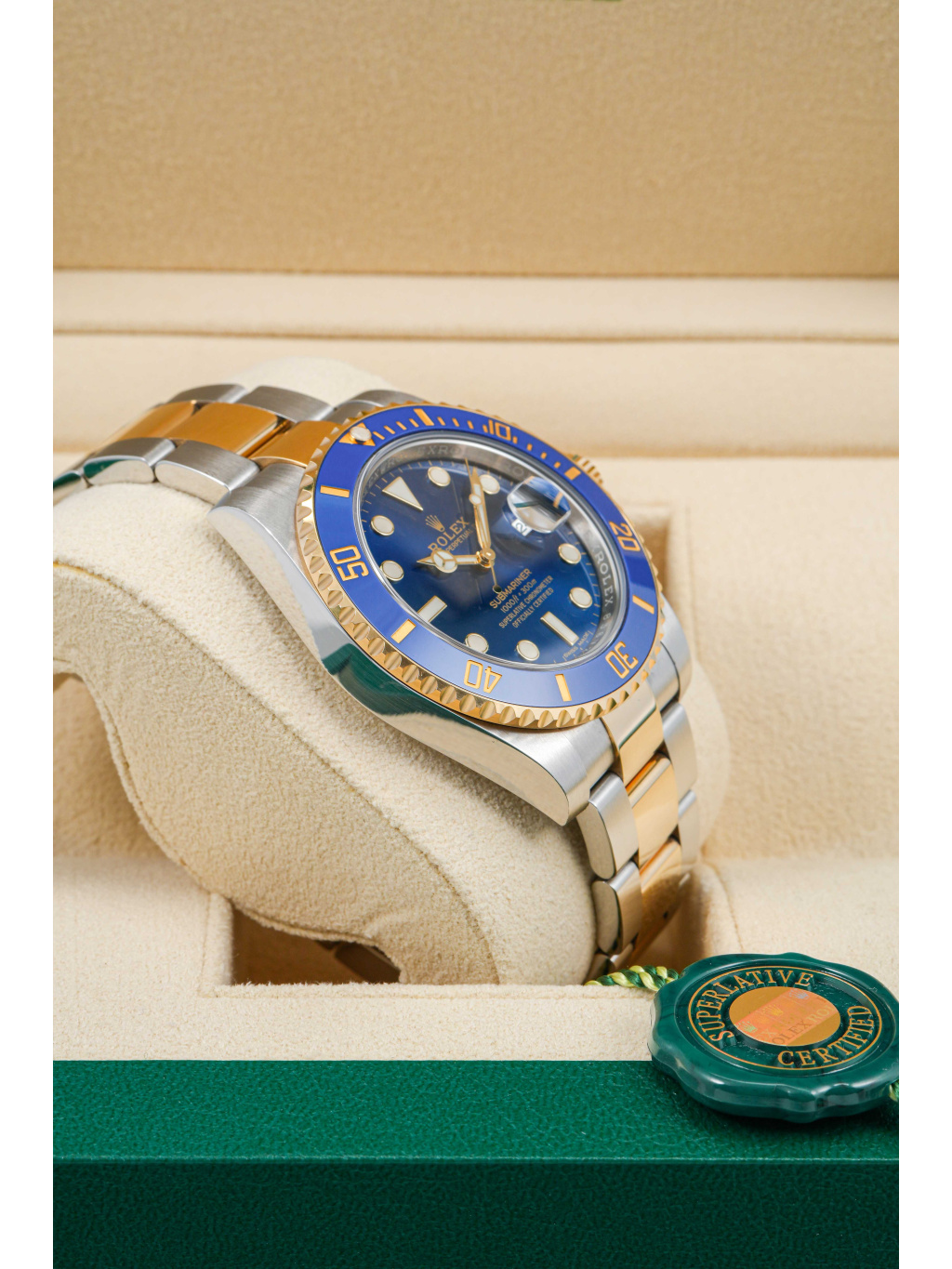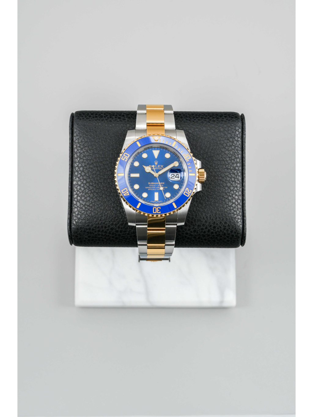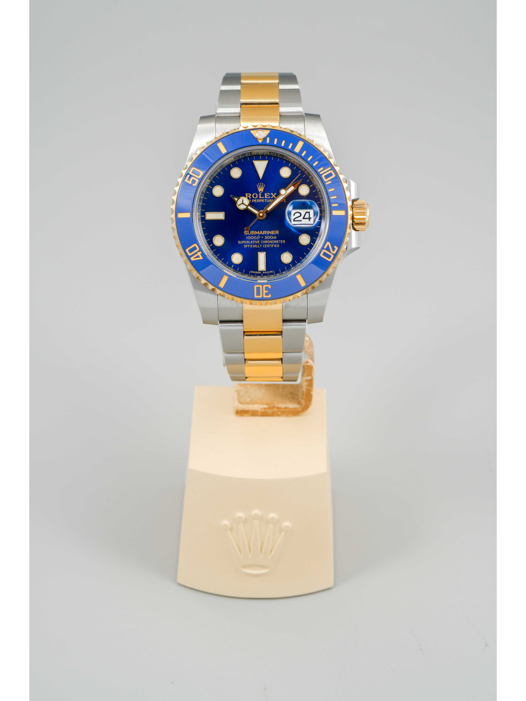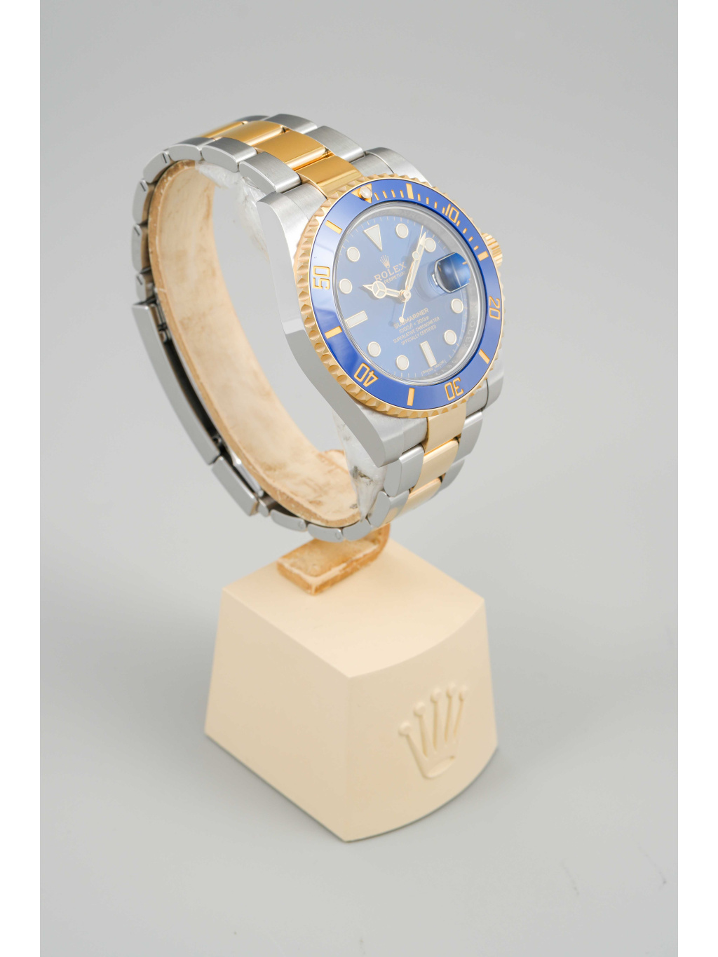 Pouzdro o průměru 40 mm je osazeno jednosměrně otočnou keramickou lunetou Cerachrom v modré barvě se zlatými číslicemi. Modrý sunburst číselník doplňují zlaté ručky a indexy s luminiscenční výplní Chromalight, která zajišťuje perfektní čitelnost i ve tmě. Safírové sklíčko s čočka Cyclops nad datem je typickým znakem modelu Submariner Date. Dvoutónový Oyster náramek kombinuje ocelové a zlaté články a je vybaven sponou Oysterlock se systémem Glidelock pro přesné nastavení délky.
