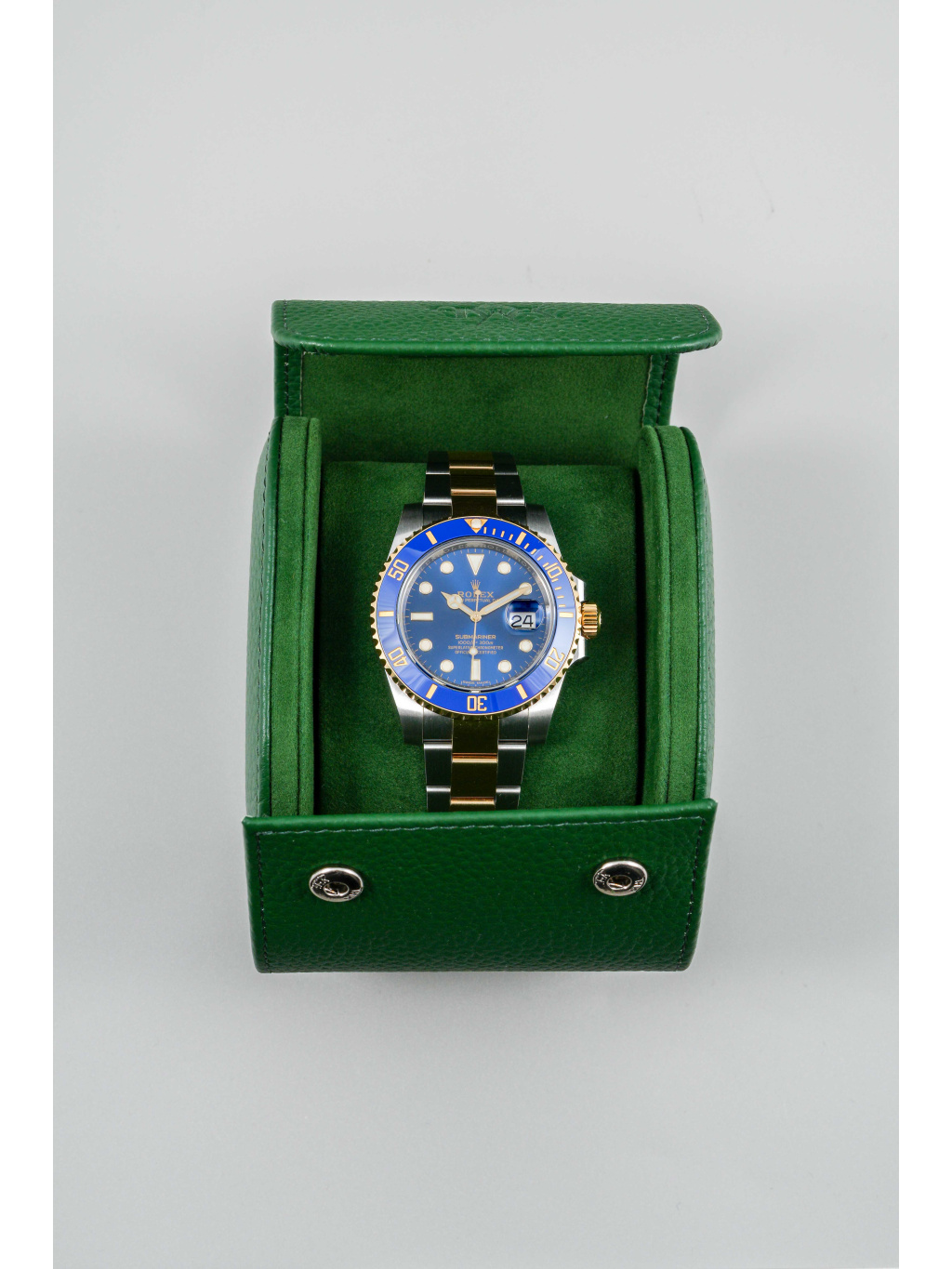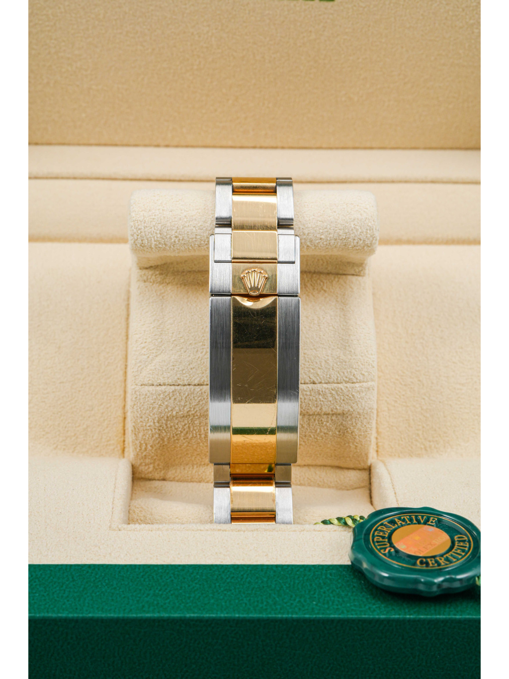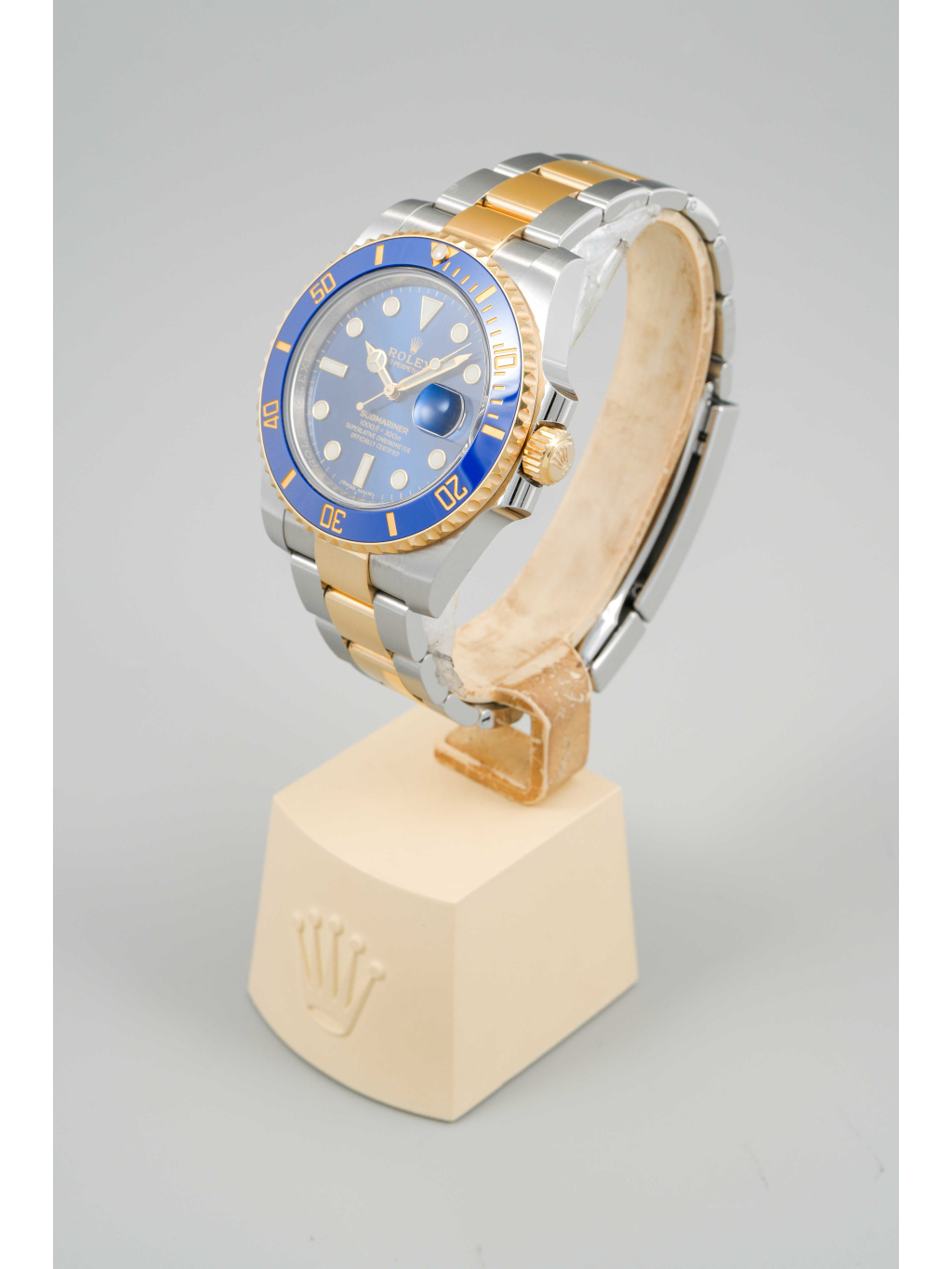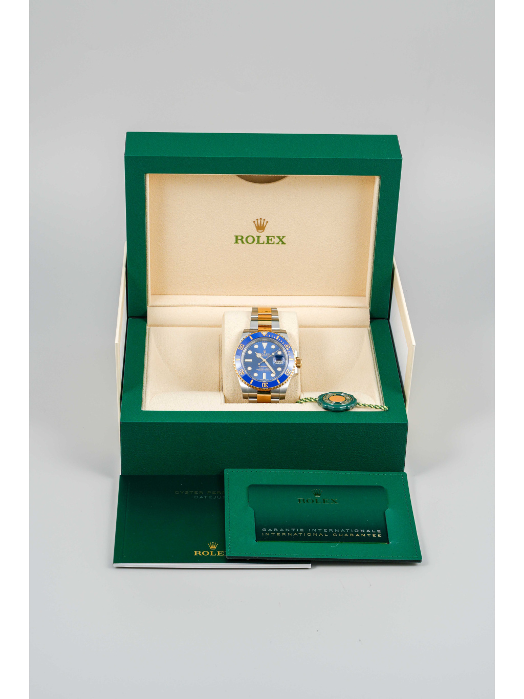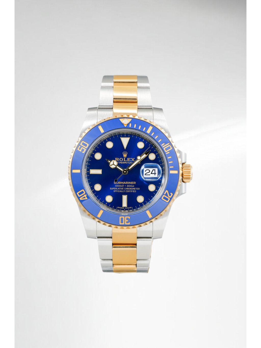 Pouzdro o průměru 40 mm je osazeno jednosměrně otočnou keramickou lunetou Cerachrom v modré barvě se zlatými číslicemi. Modrý sunburst číselník doplňují zlaté ručky a indexy s luminiscenční výplní Chromalight, která zajišťuje perfektní čitelnost i ve tmě. Safírové sklíčko s čočka Cyclops nad datem je typickým znakem modelu Submariner Date. Dvoutónový Oyster náramek kombinuje ocelové a zlaté články a je vybaven sponou Oysterlock se systémem Glidelock pro přesné nastavení délky.