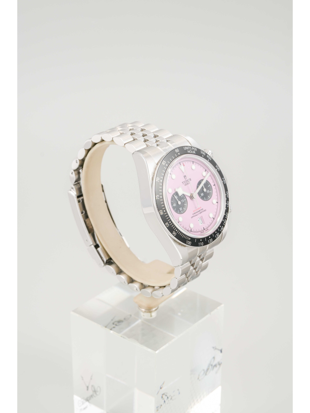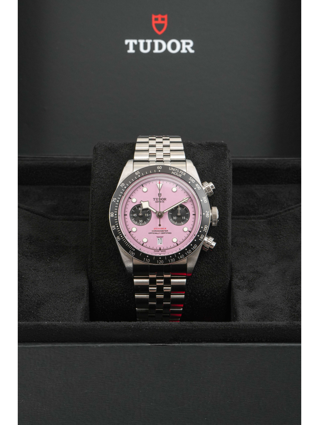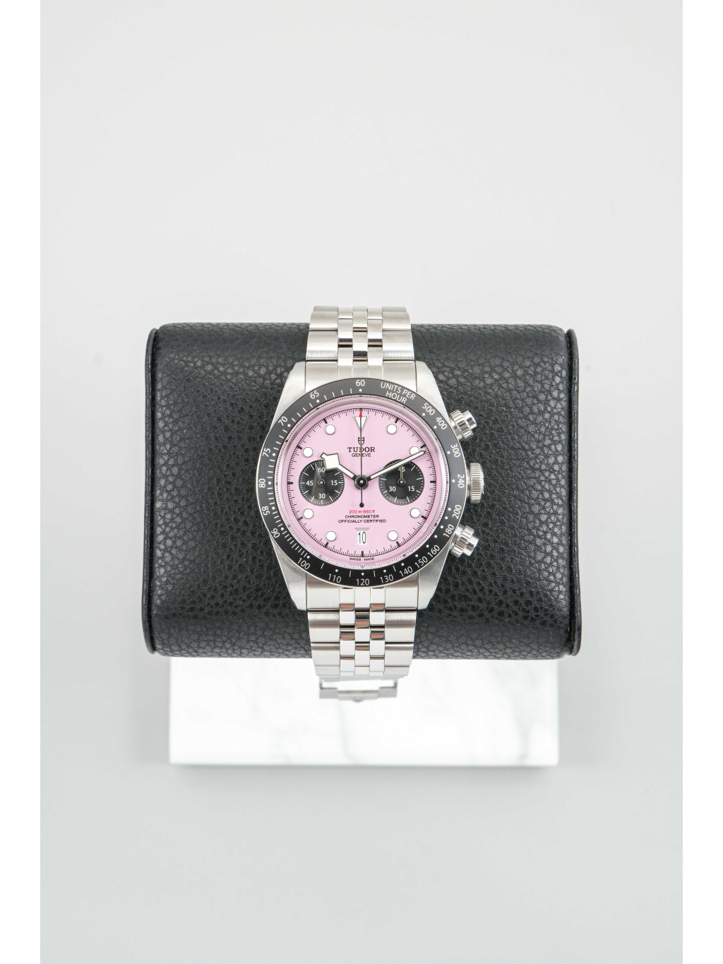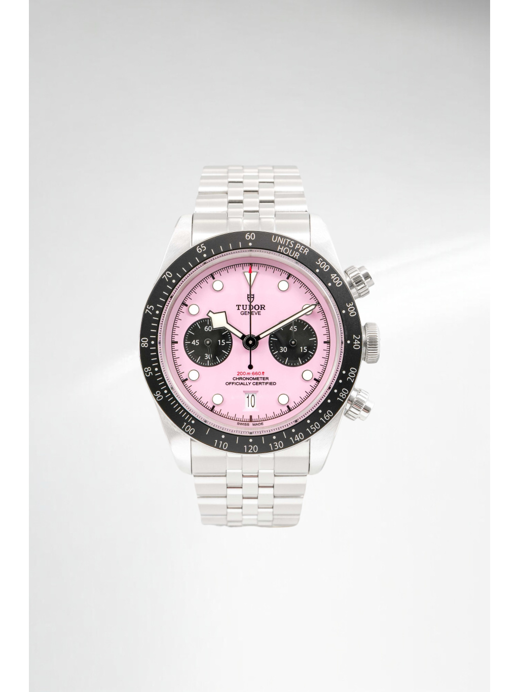 Tudor Black Bay Chrono Pink je odvážnou a moderní interpretací sportovního chronografu značky Tudor. Výrazné růžové detaily dodávají modelu svěží charakter a odlišují jej od tradičních provedení kolekce Black Bay. Tento model je často spojován s partnerstvím značky Tudor s klubem Inter Miami CF, díky čemuž si rychle získal výraznou mediální i sběratelskou pozornost.