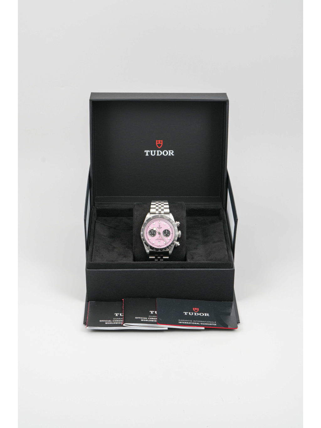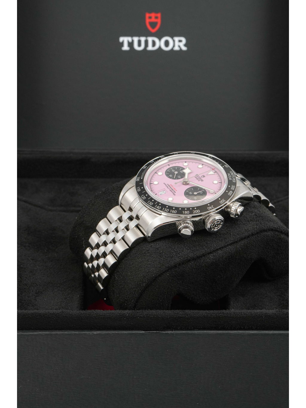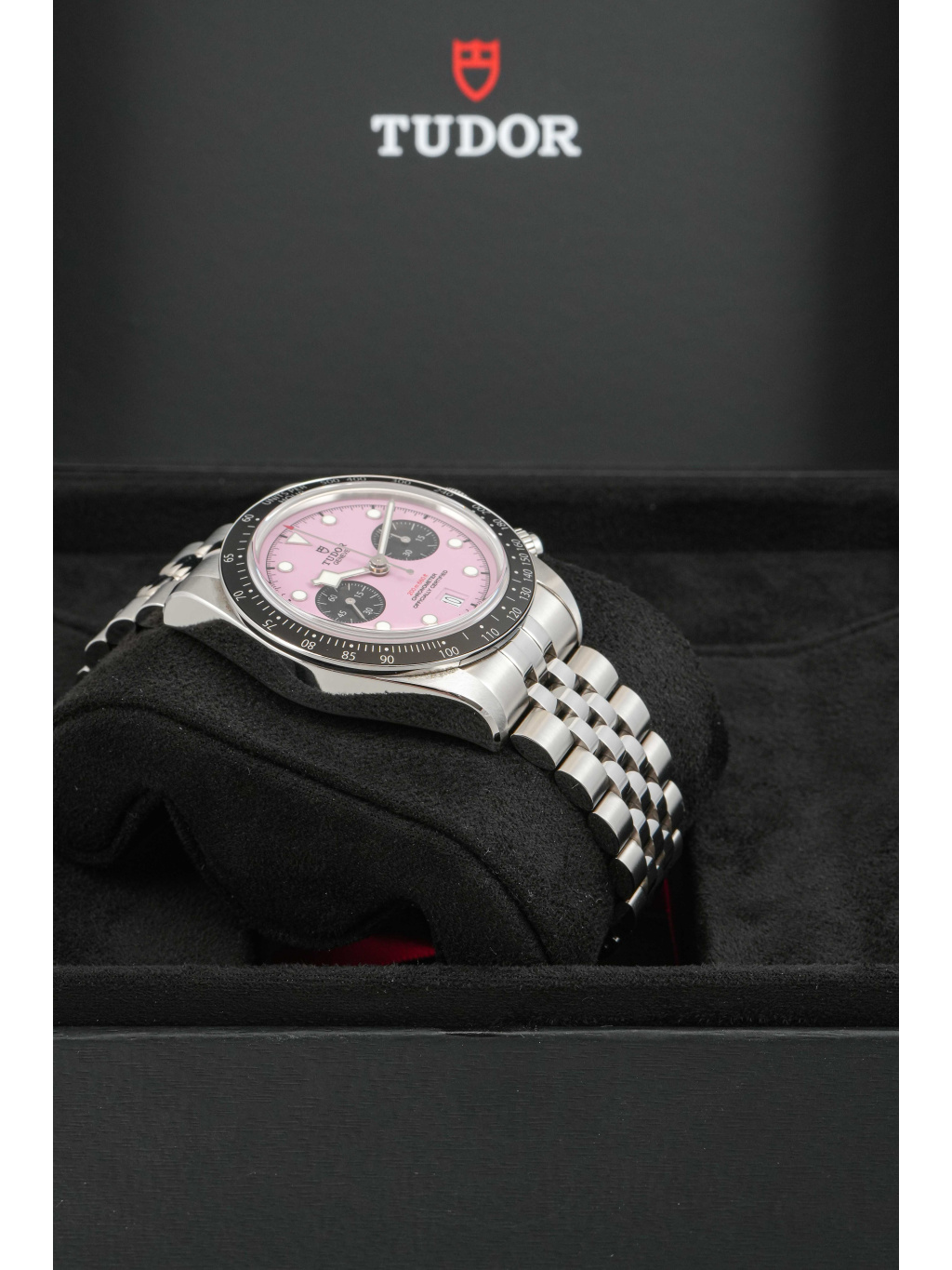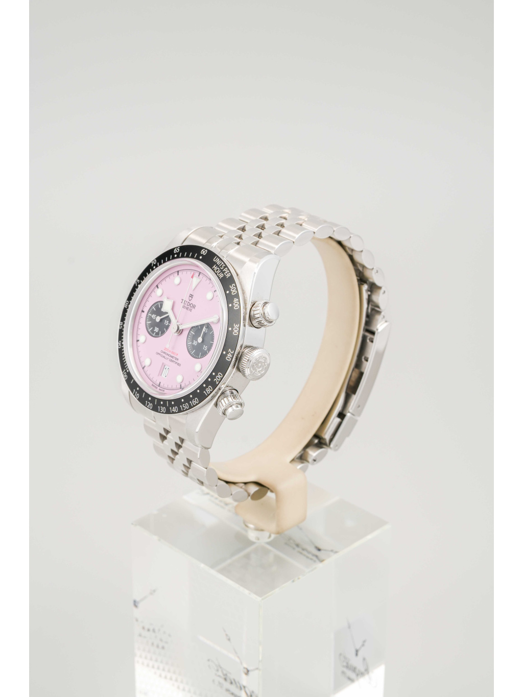 Tudor Black Bay Chrono Pink je odvážnou a moderní interpretací sportovního chronografu značky Tudor. Výrazné růžové detaily dodávají modelu svěží charakter a odlišují jej od tradičních provedení kolekce Black Bay. Tento model je často spojován s partnerstvím značky Tudor s klubem Inter Miami CF, díky čemuž si rychle získal výraznou mediální i sběratelskou pozornost.